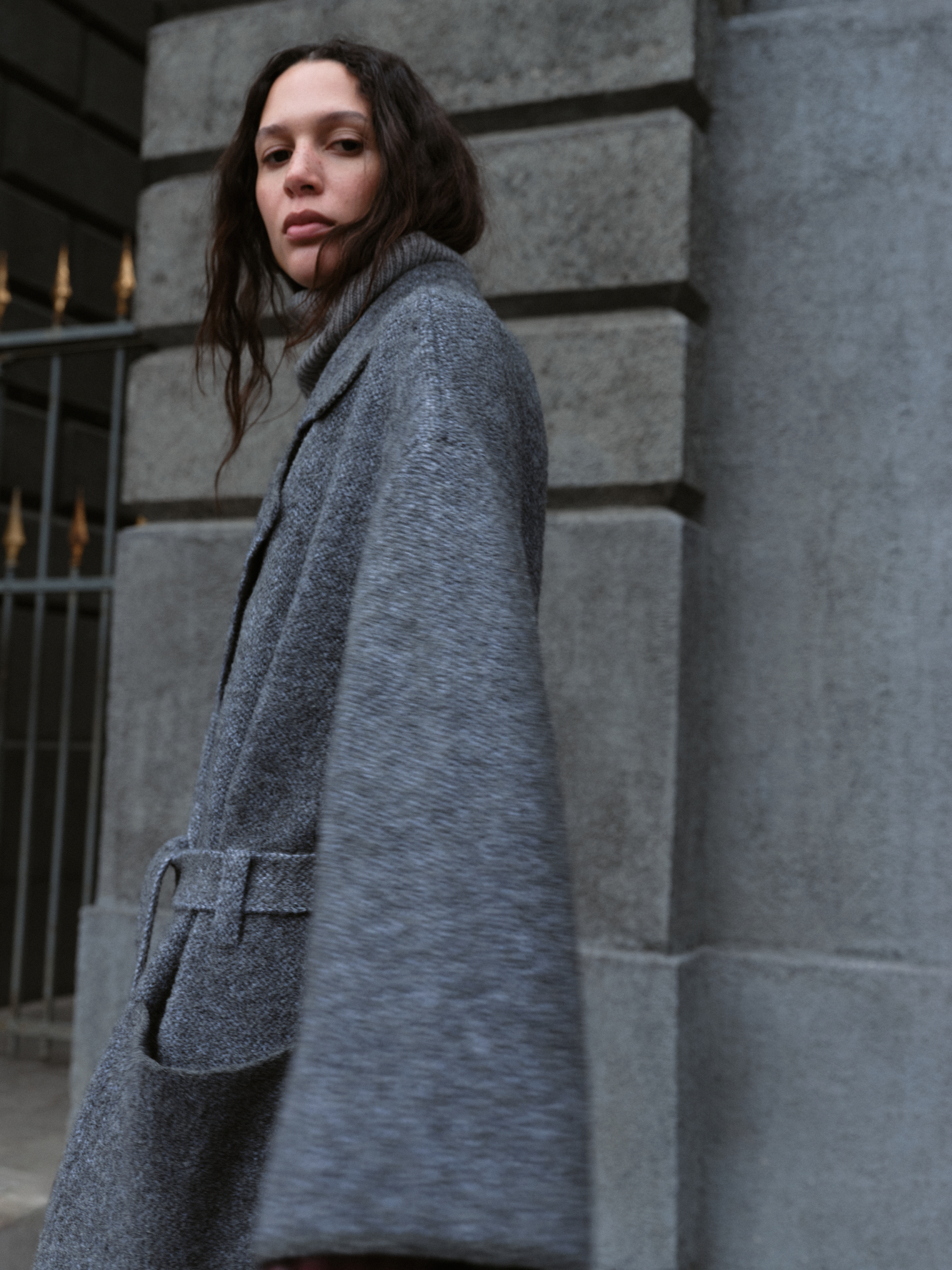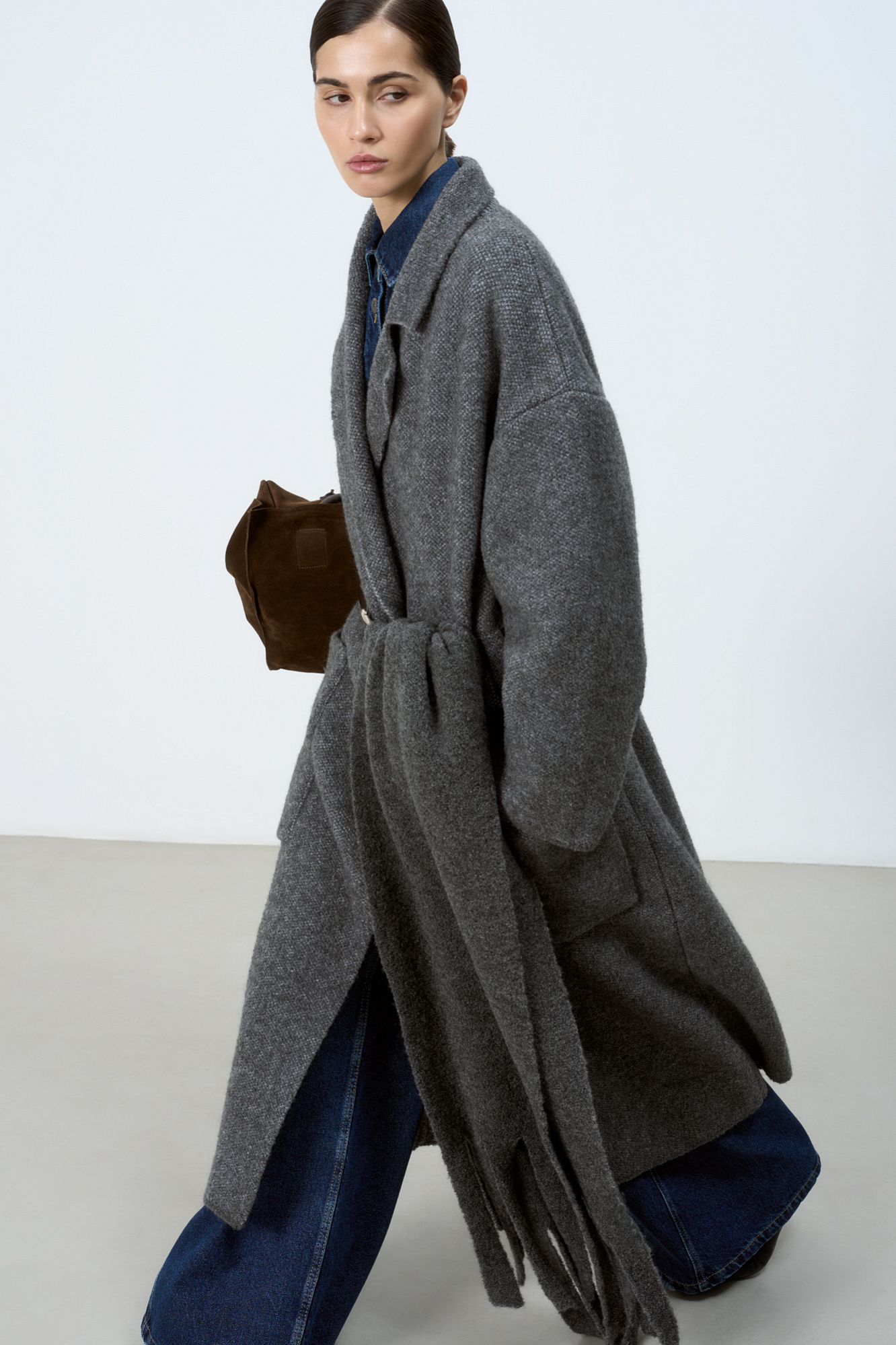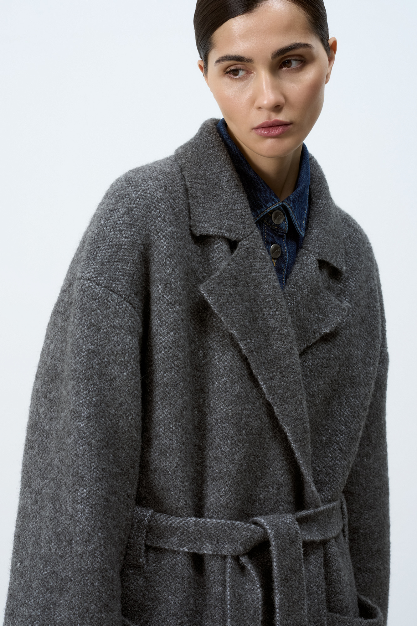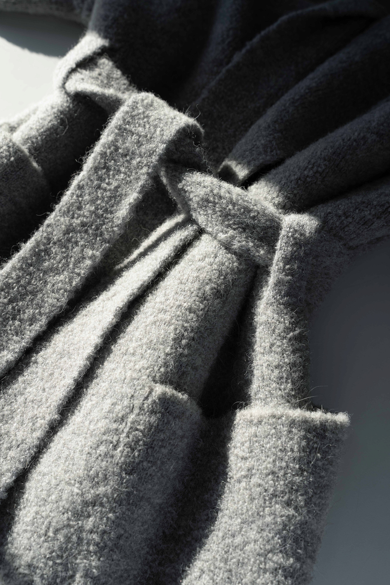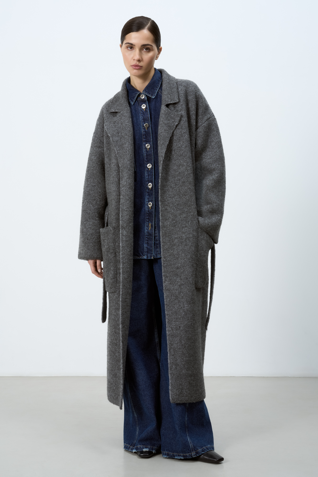 Трикотажное пальто на запах из смесовой шерсти с поясом в тон. Модель свободного силуэта со спущенной линией плеча и накладными карманами. Отложной воротник с прямоугольными лацканами. Изделие без подкладки. Дополнить образ можно шарфом и шапкой в тон.