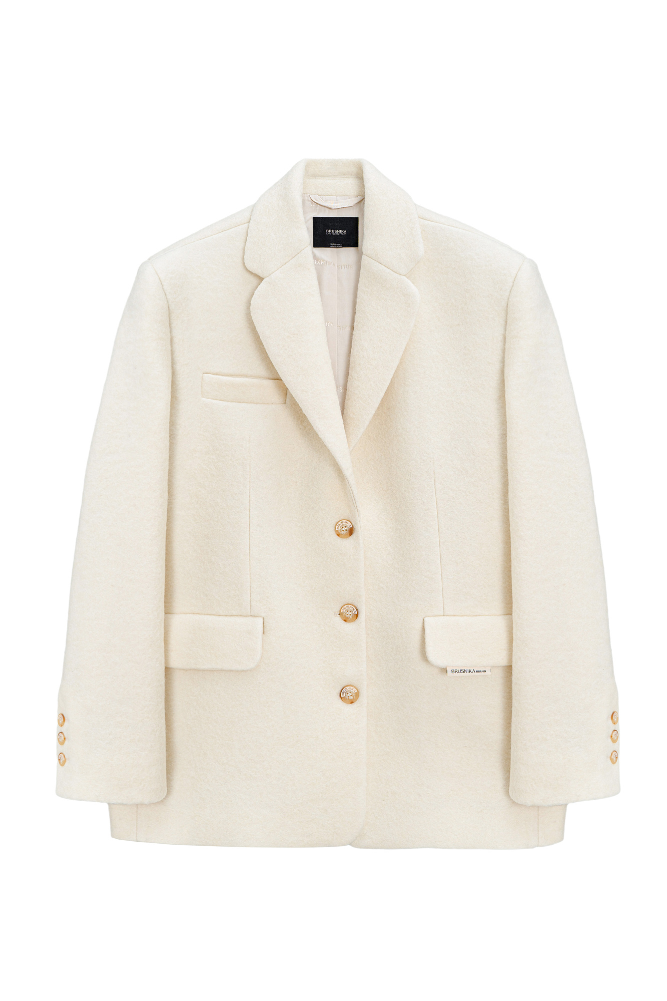 Однобортный жакет-пальто из шерсти. Модель прямого кроя с классическим отложным воротником и двумя прорезными карманами с клапанами. Застежка на пуговицы. Изделие декорировано пуговицами на манжетах и брендированным ярлыком на клапане кармана. Пояс из экокожи в комплекте. Пальто на подкладке.