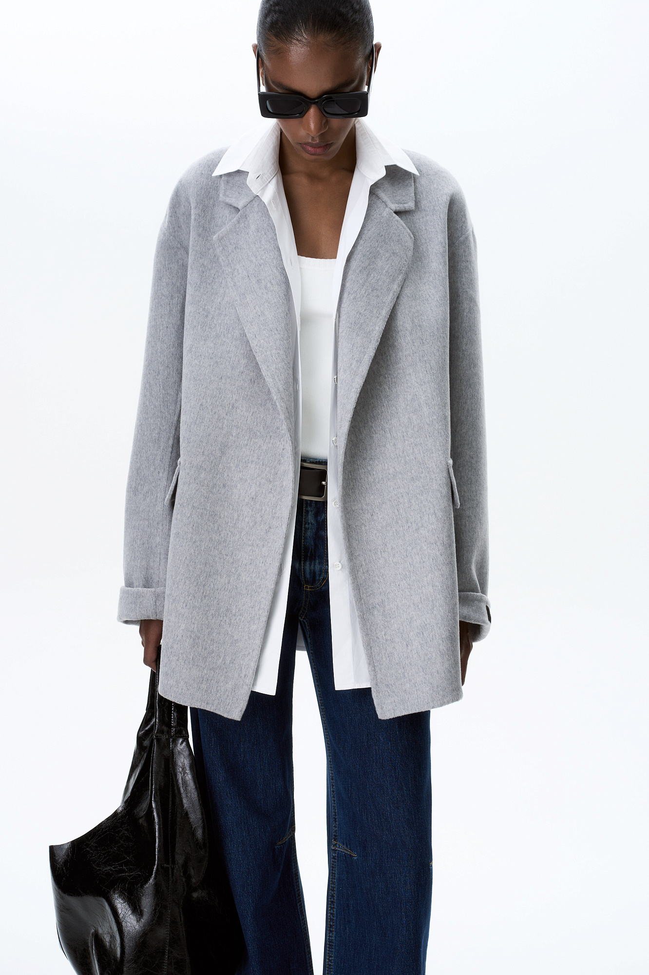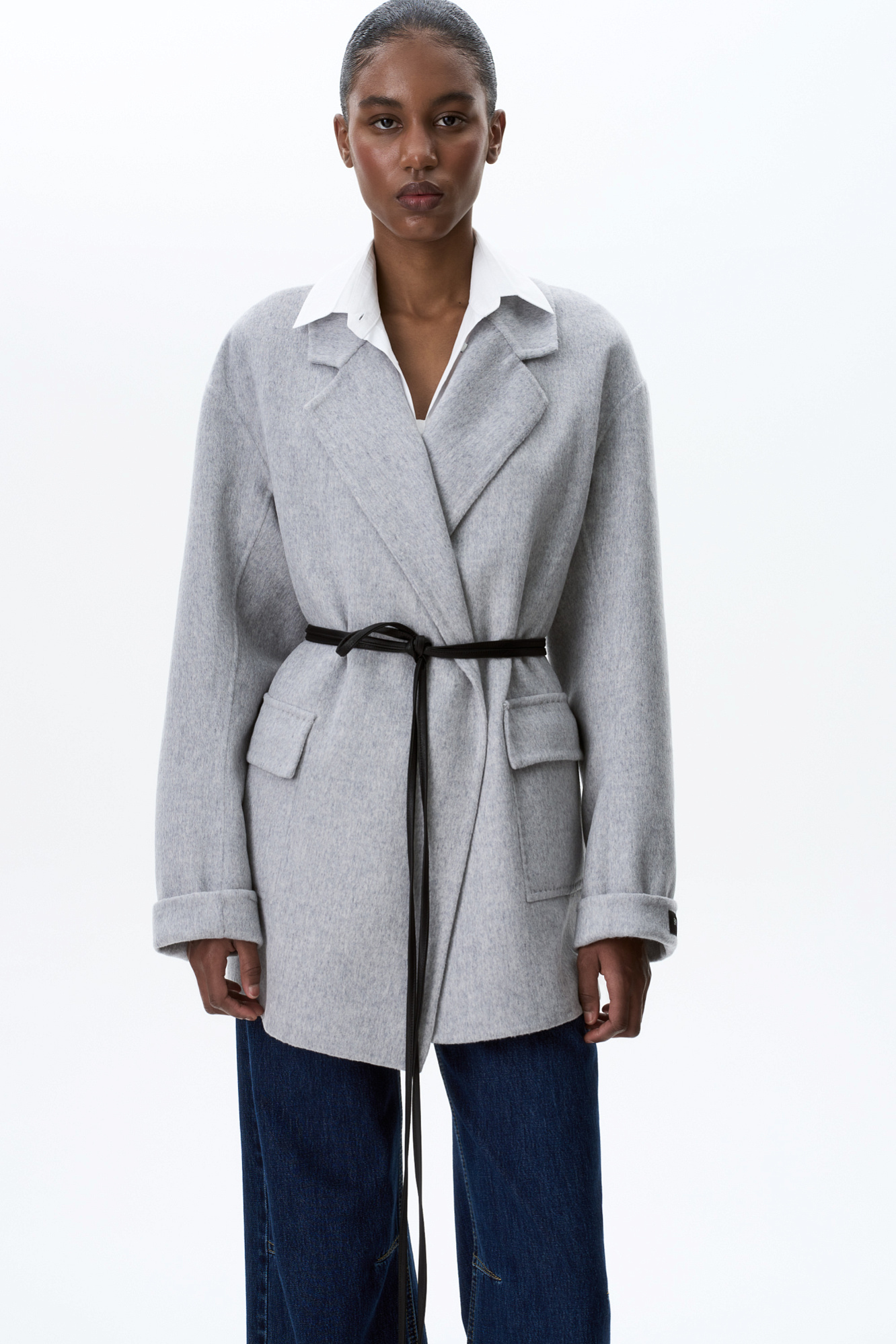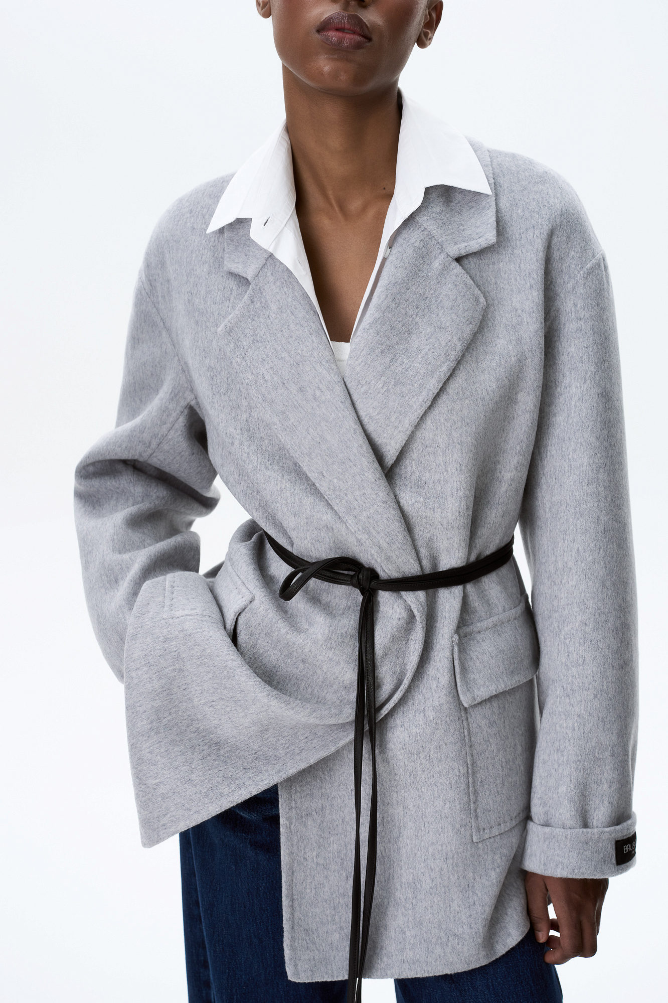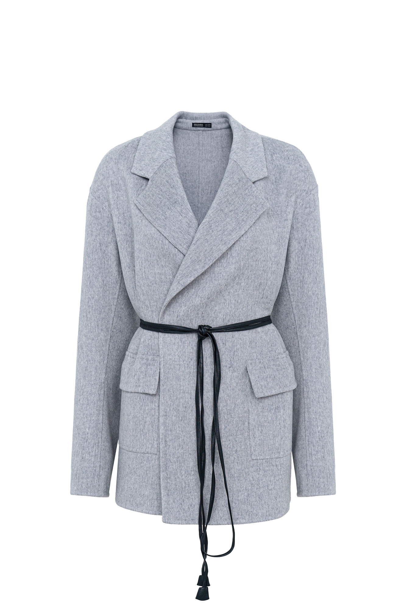 Жакет из двусторонней шерстной ткани на запах. Модель прямого кроя с отложным воротником и накладными карманами с клапанами. Изделие выполнено без подкладки. Тонкий пояс из экокожи в комплекте.