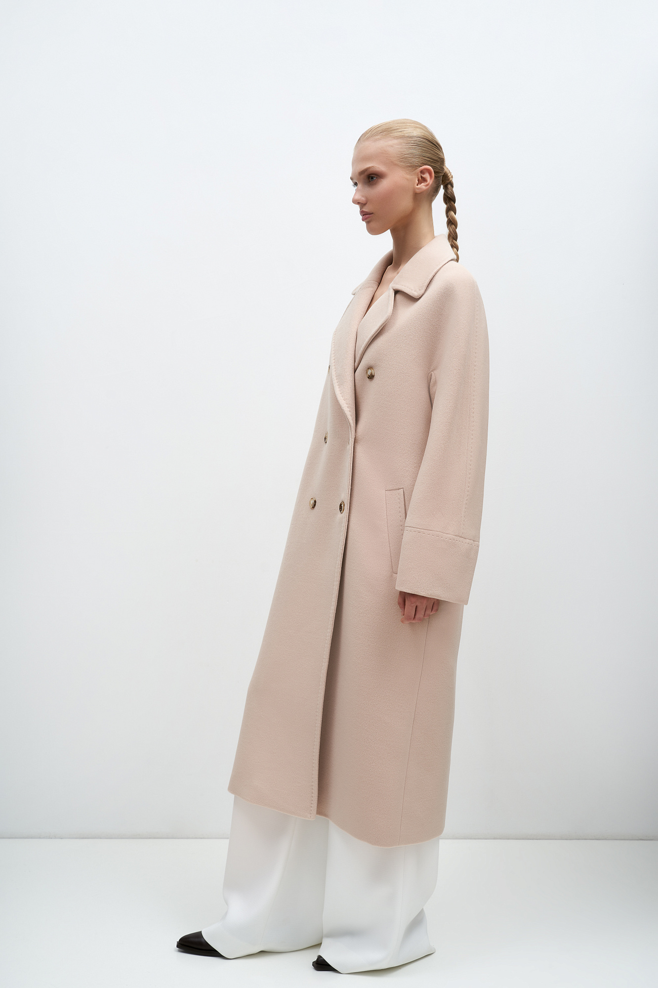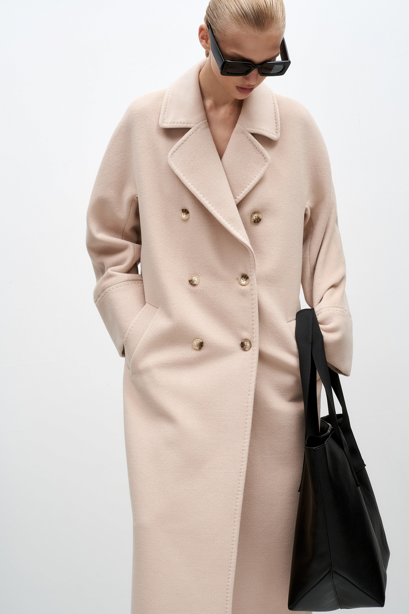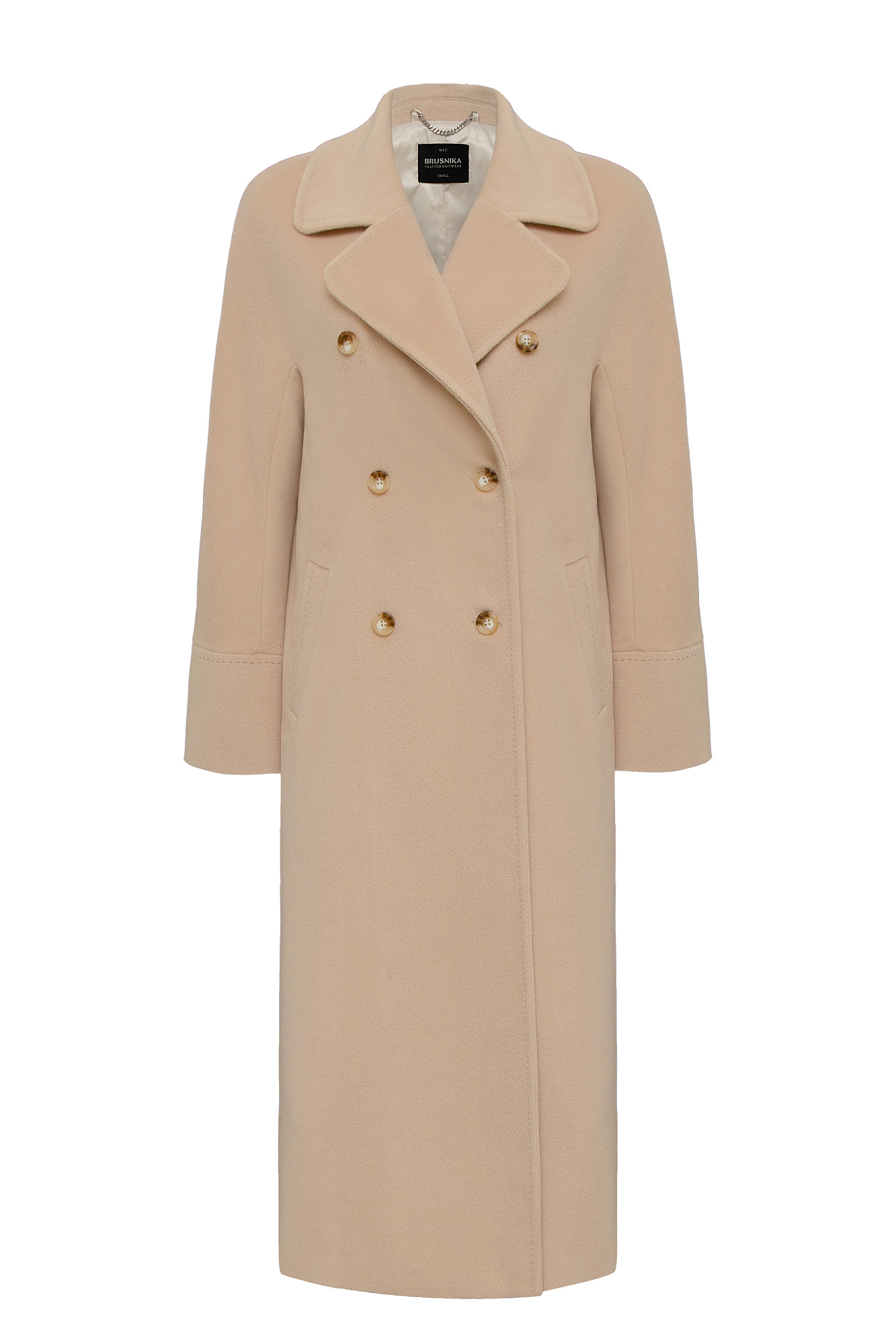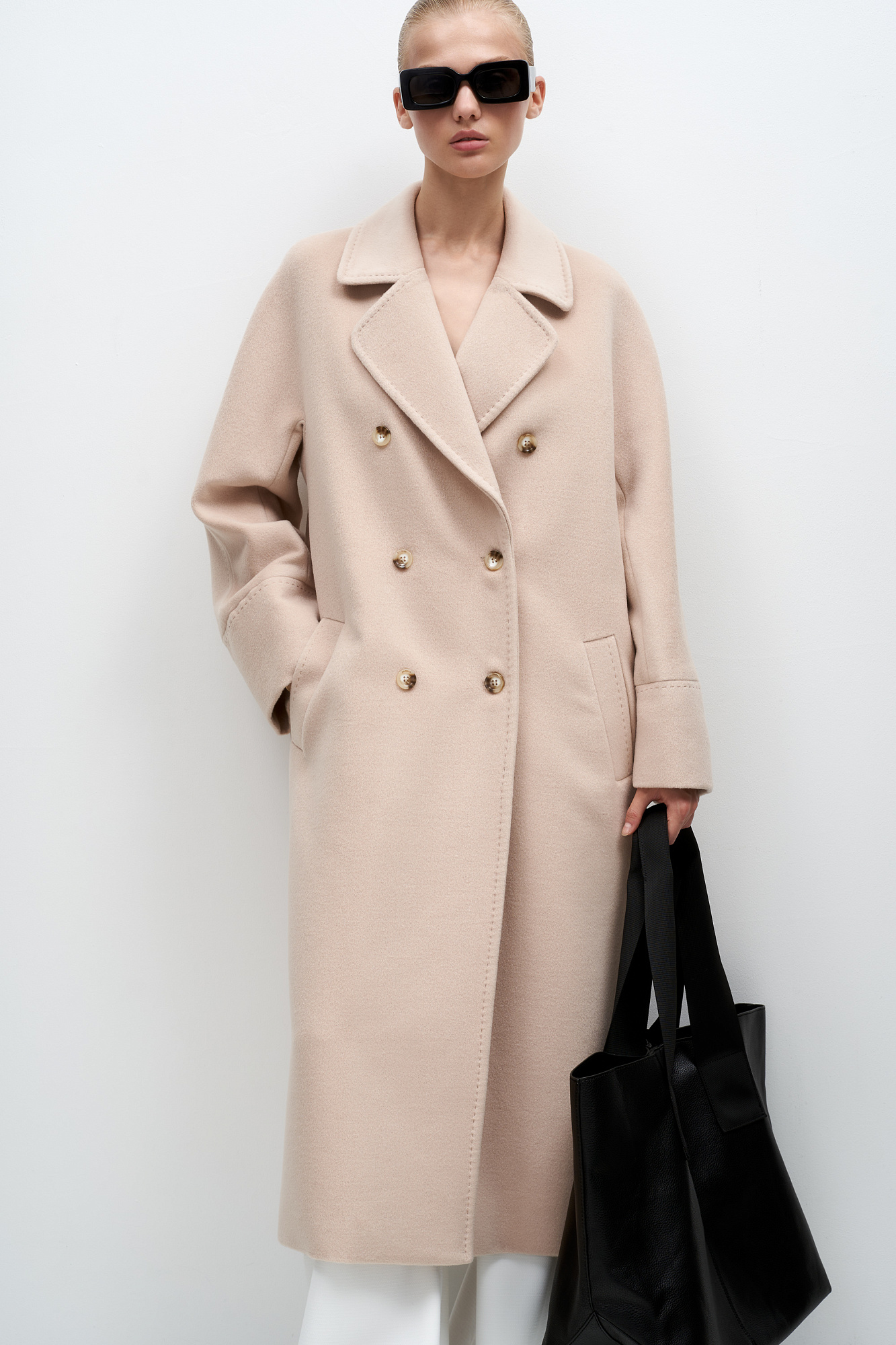 Двубортное пальто из шерсти с карманами. Отложной воротник с прямоугольными лацканами. Длинные рукава. Застегивается на пуговицы.