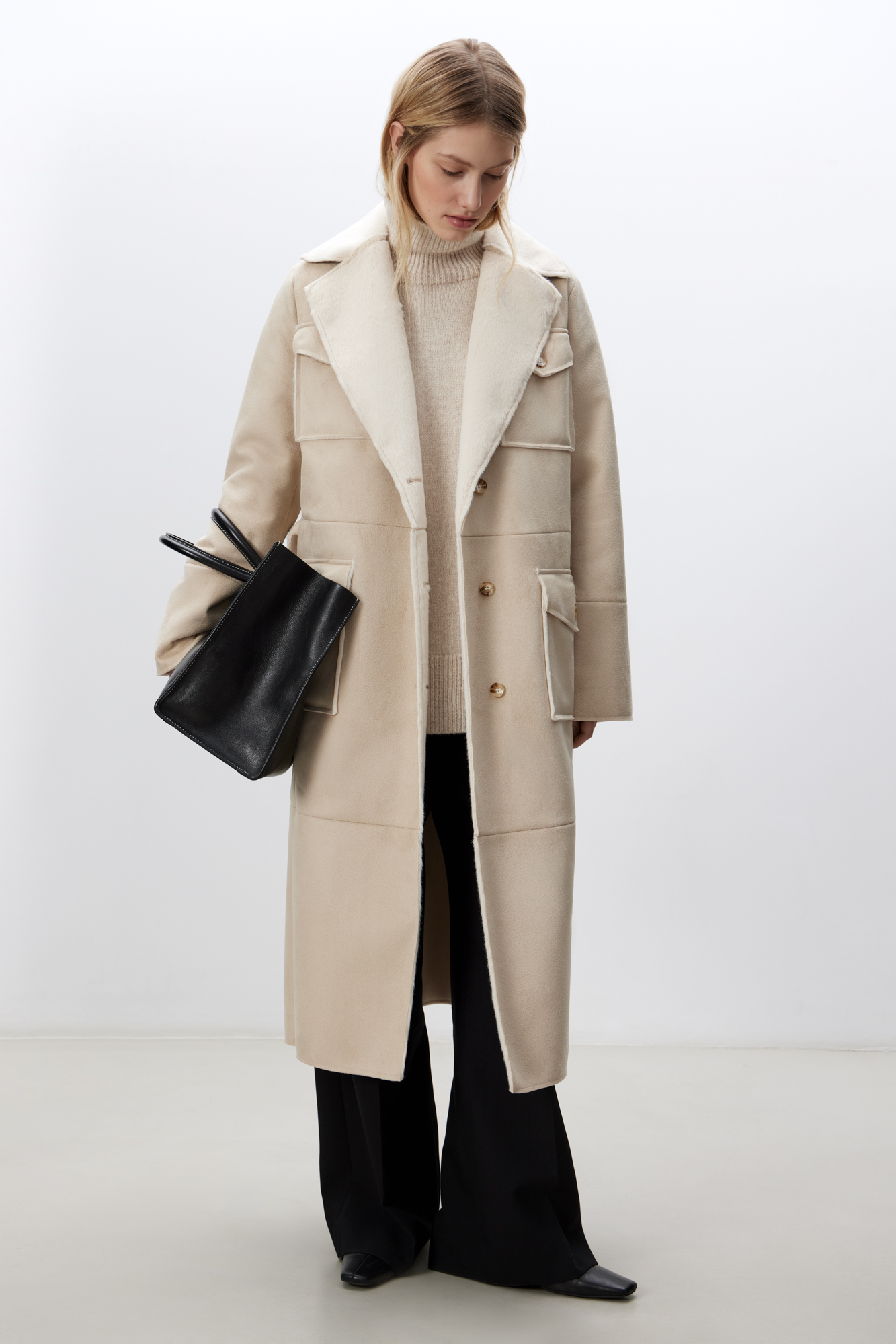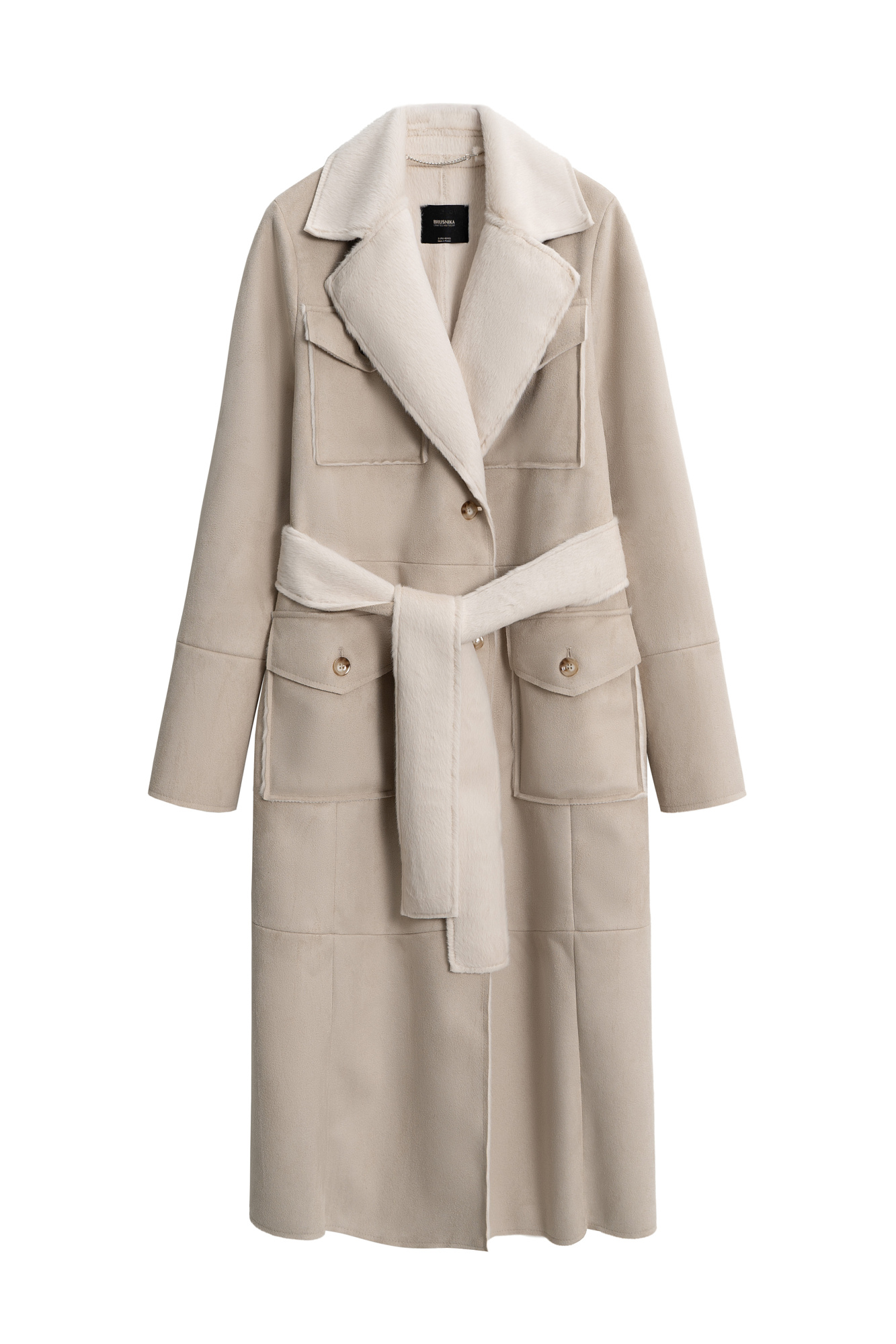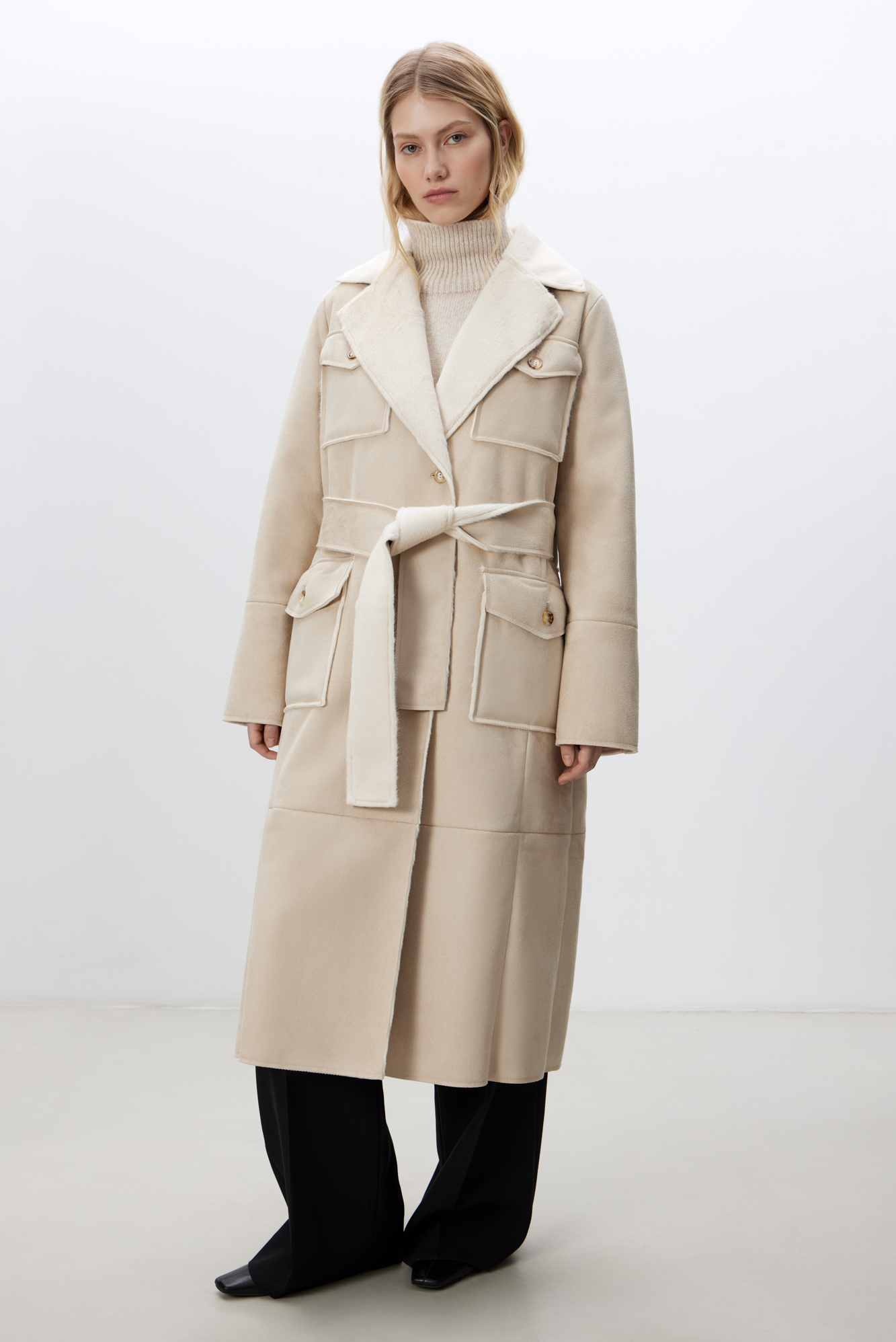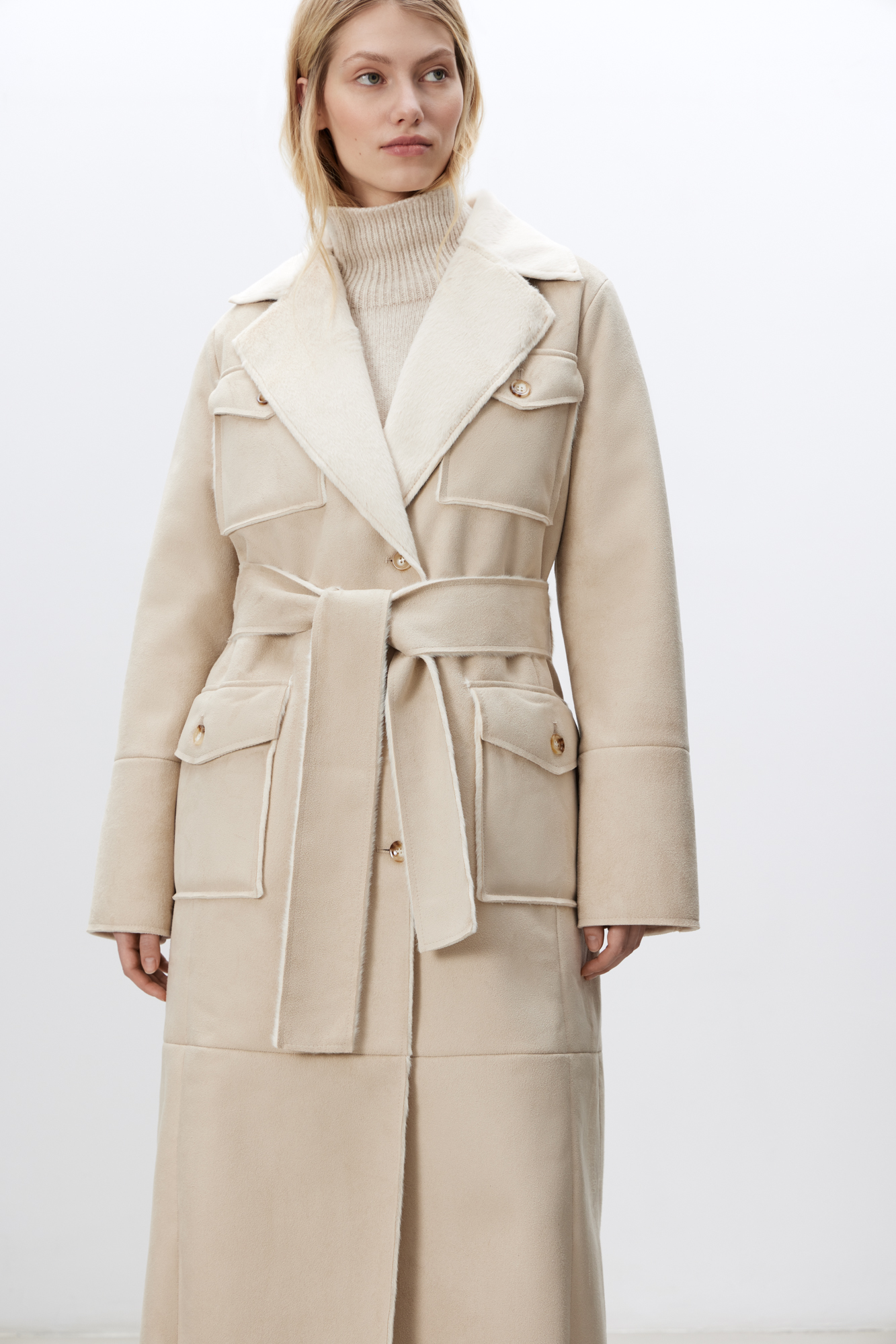 Длинная дубленка из экомеха. Модель прямого силуэта с английским воротником, накладными карманами и поясом. Изделие выполнено на подкладке из экомеха.