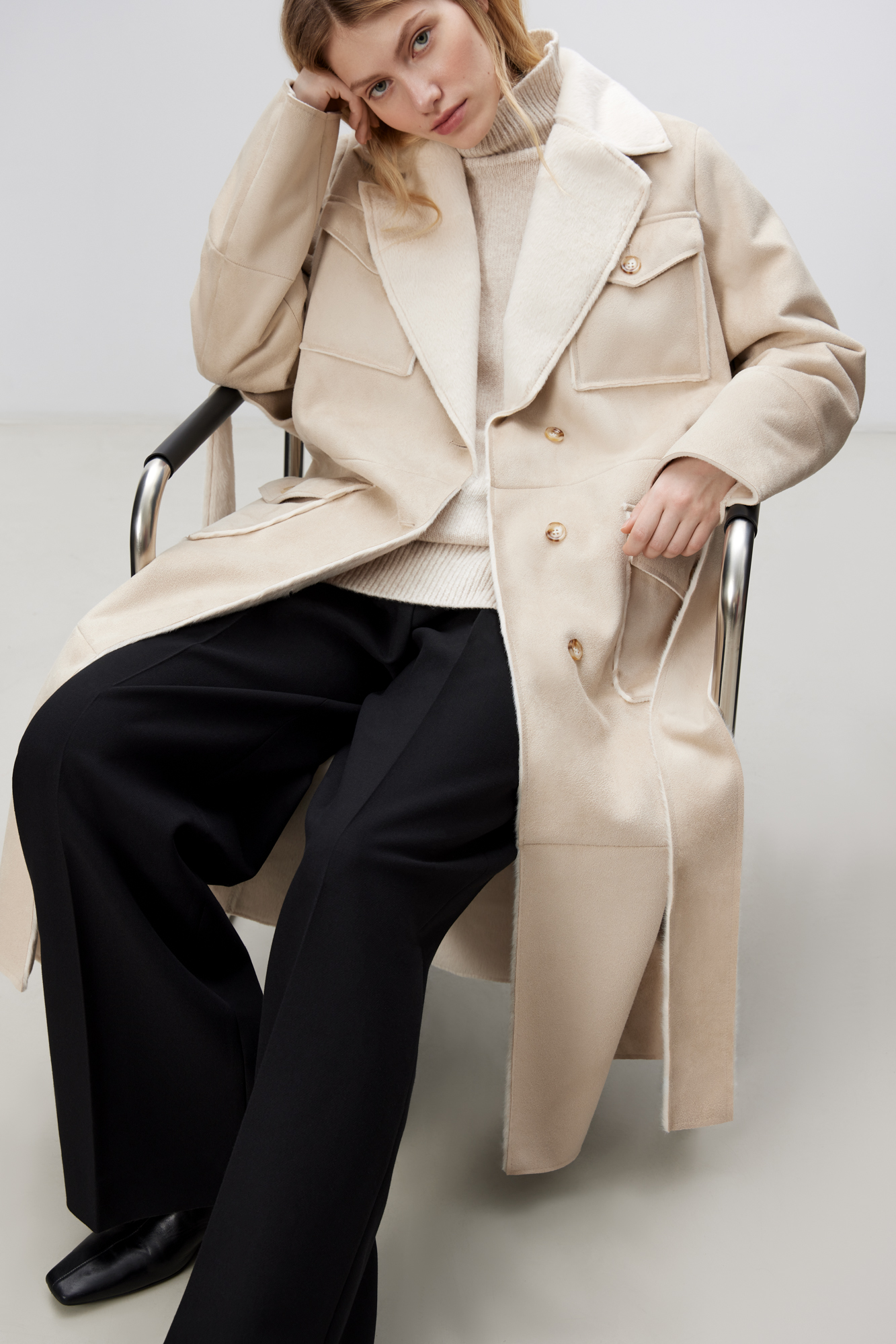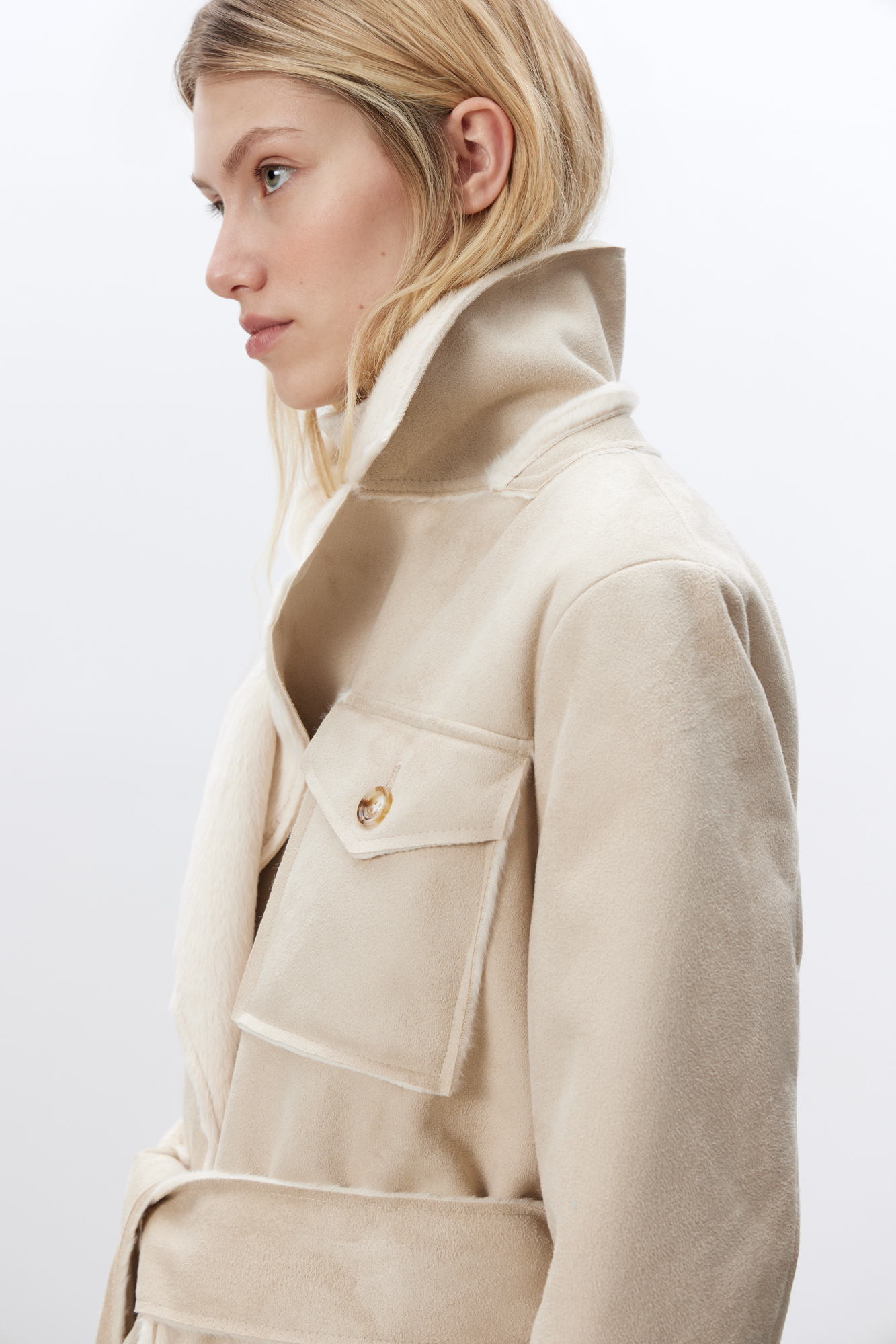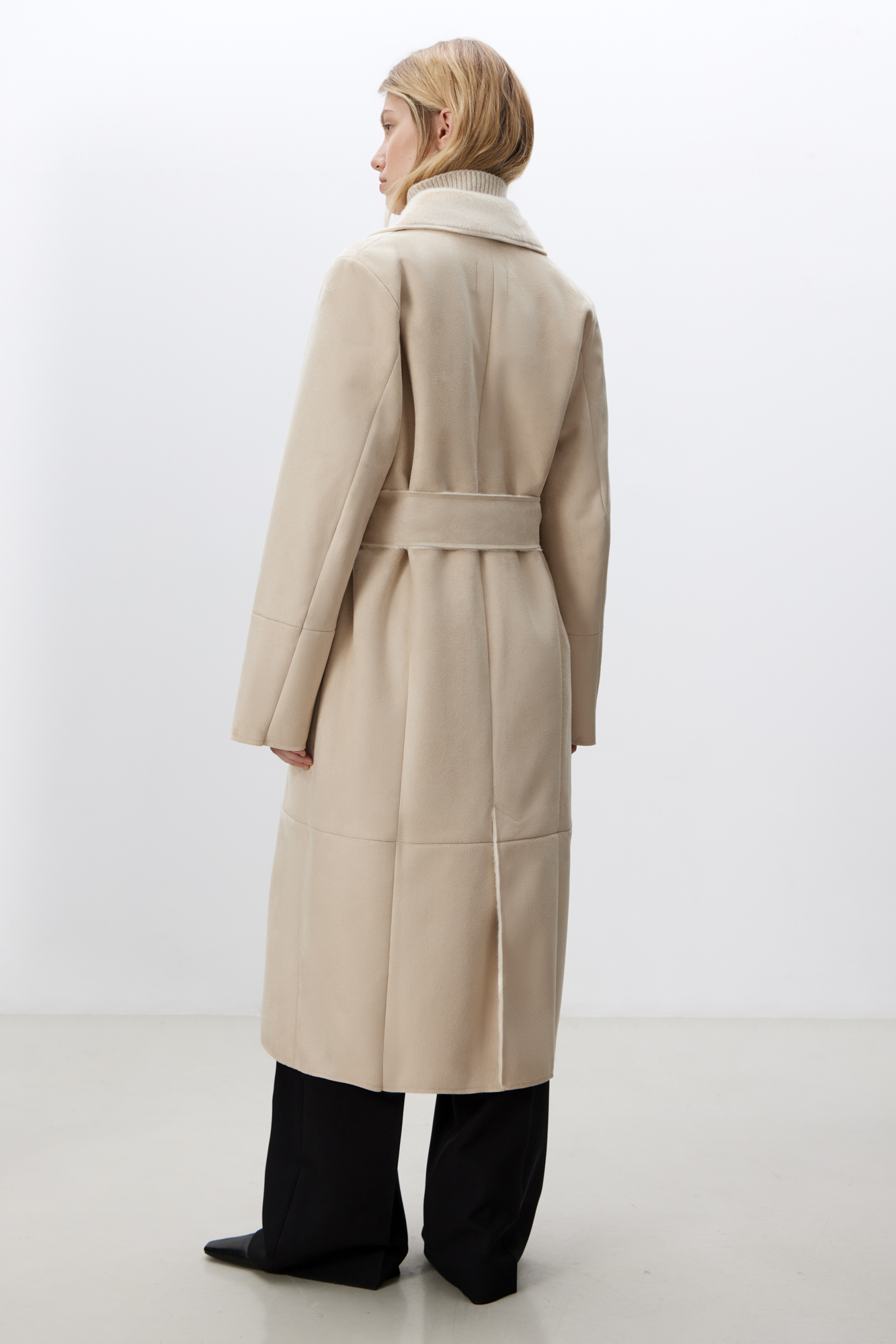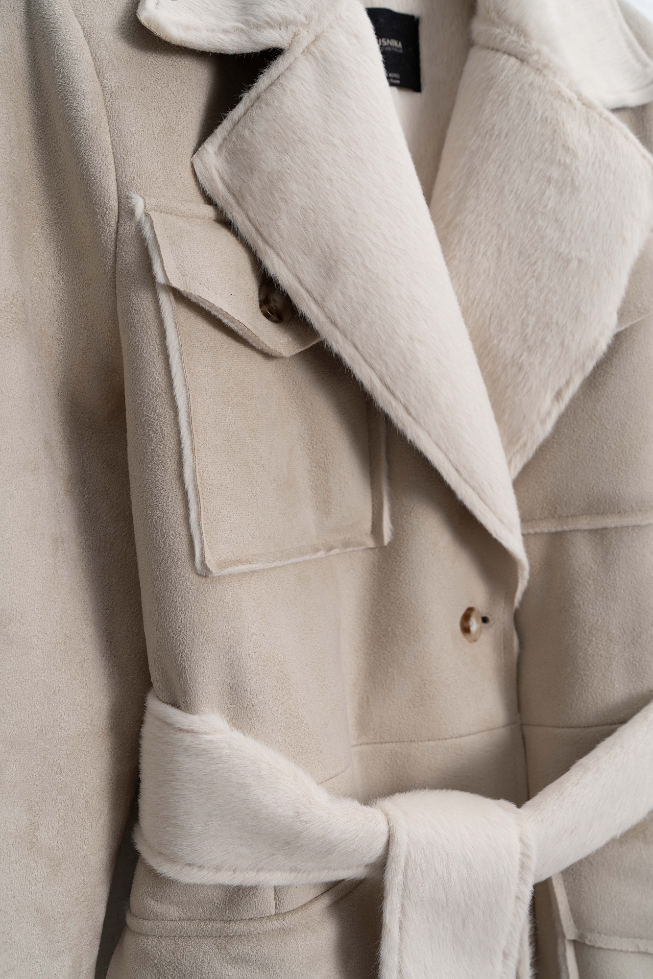 Длинная дубленка из экомеха. Модель прямого силуэта с английским воротником, накладными карманами и поясом. Изделие выполнено на подкладке из экомеха.