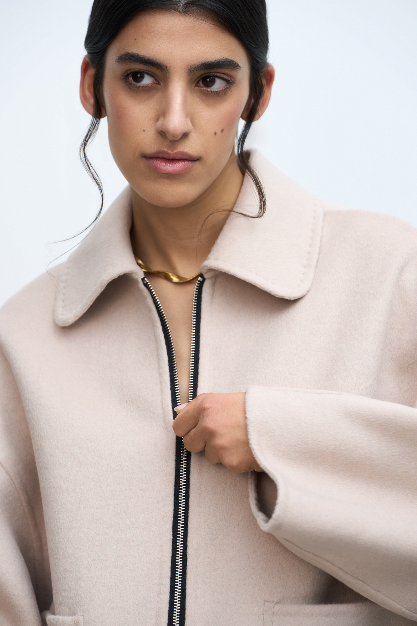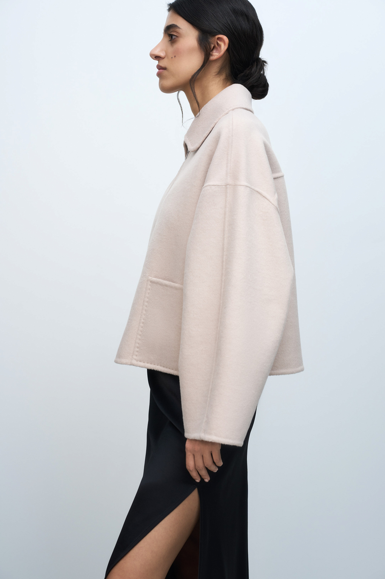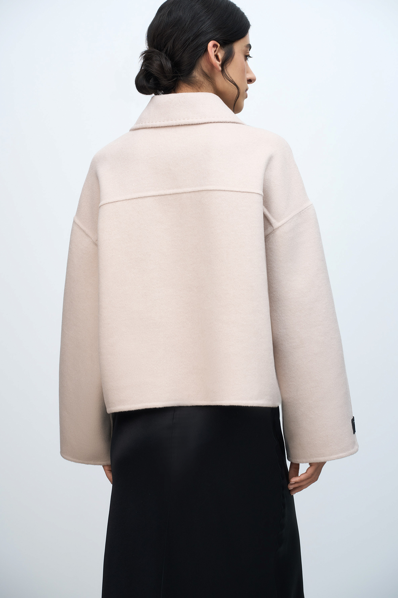 Укороченное пальто прямого силуэта с накладными карманами и застежкой на молнию. Акцентные швы с имитацией ручного стежка. При пошиве модели была использована технология double face, внутренняя сторона выглядит также аккуратно, как и внешняя.