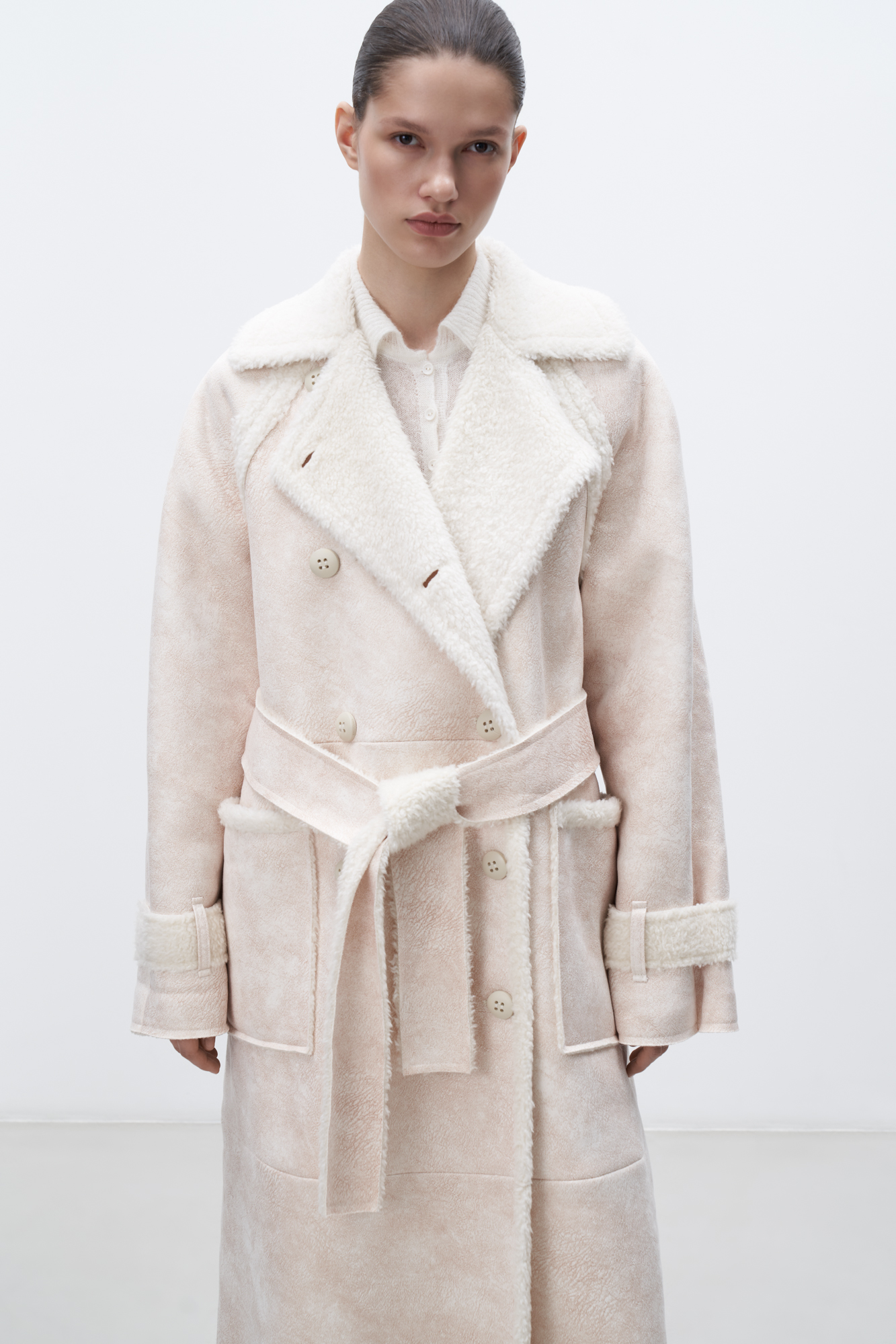 Длинная дубленка из шерсти. Модель прямого силуэта с отложным воротником, накладными карманами, патами и поясом из основного материала. Застежка на пуговицы.