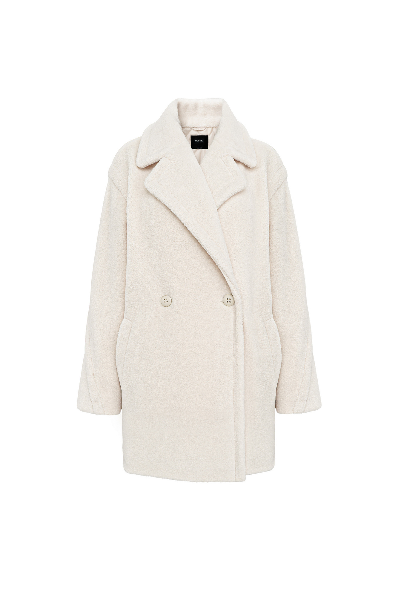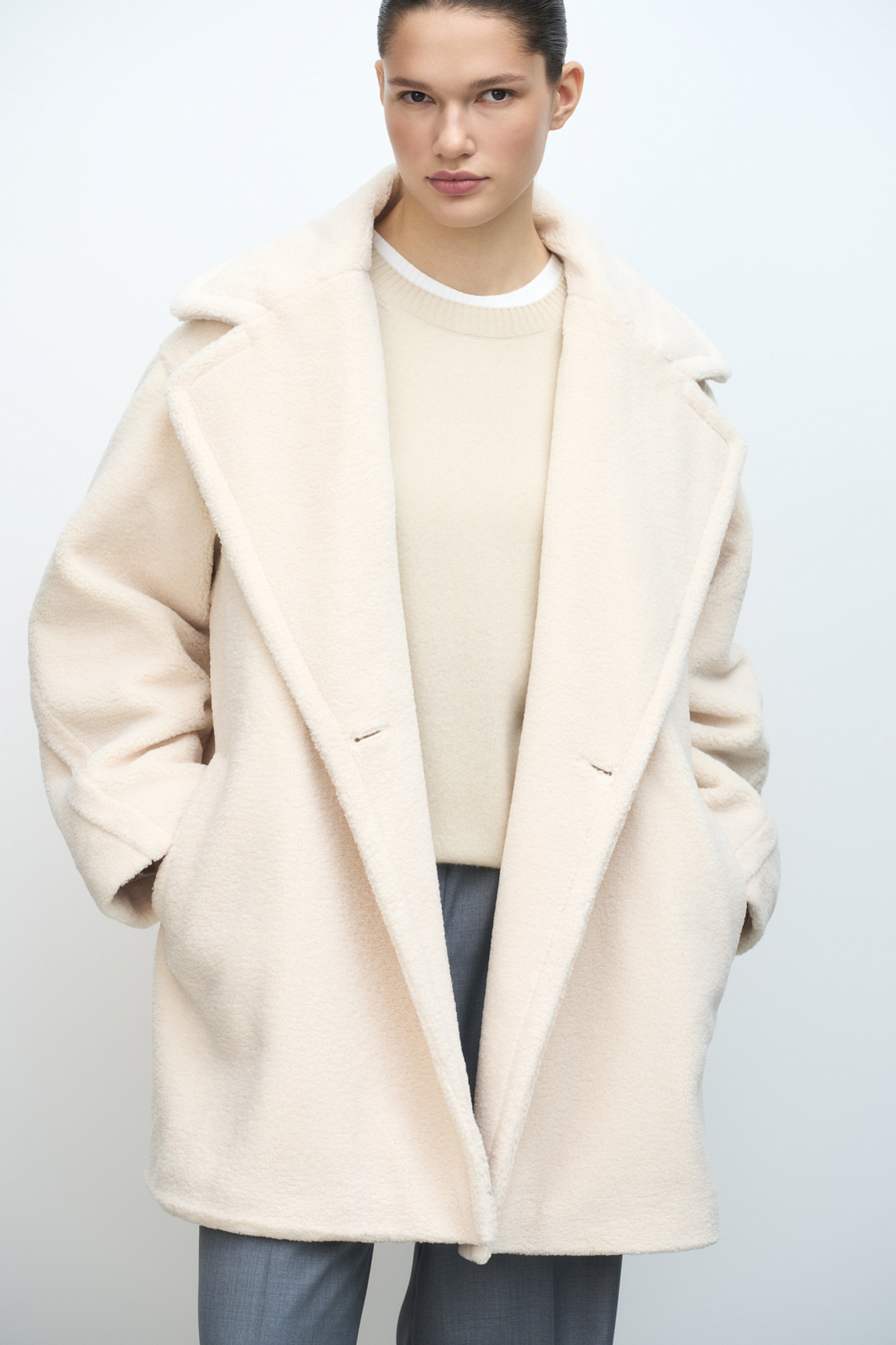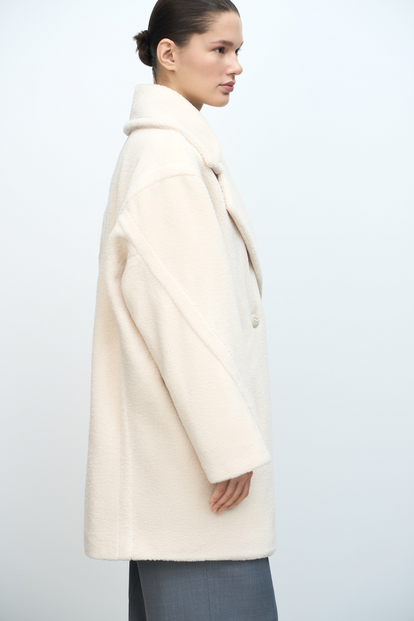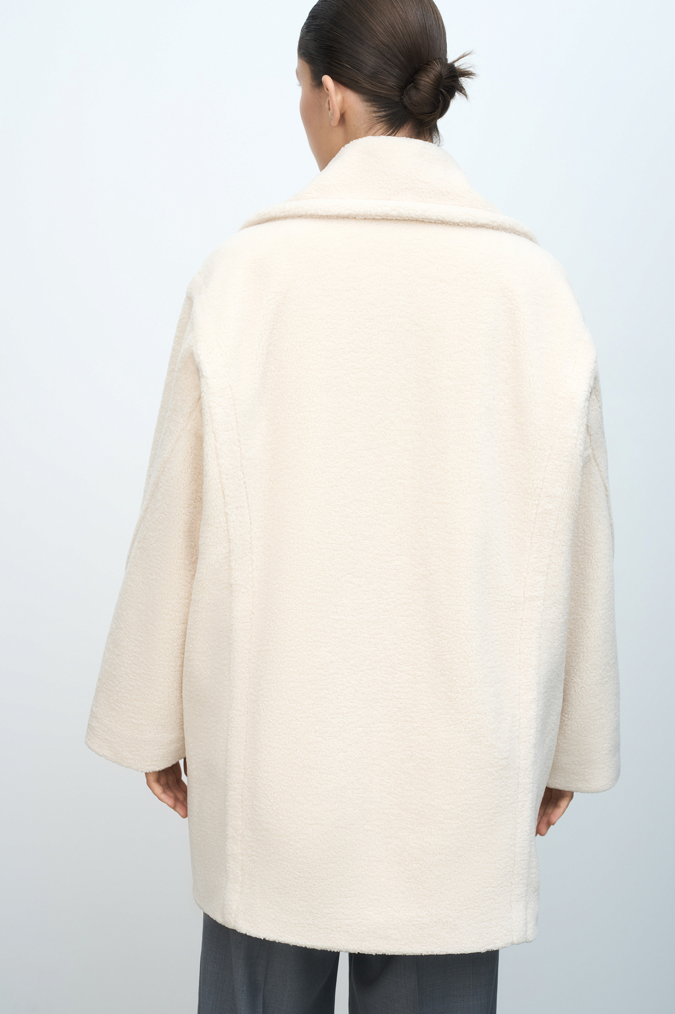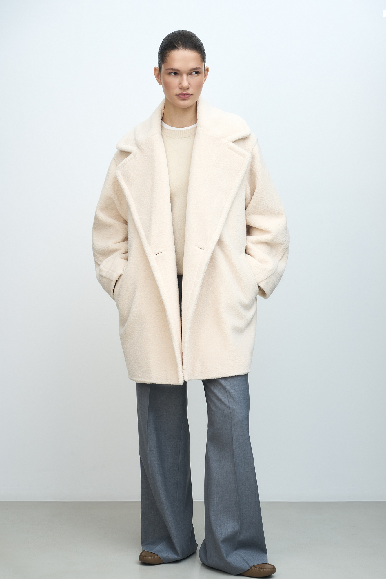 Шуба из экомеха. Модель свободного силуэта со спущенной линией плеча, боковыми карманами и застежкой на пуговицы. Отложной воротник с прямоугольными лацканами. На подкладке.