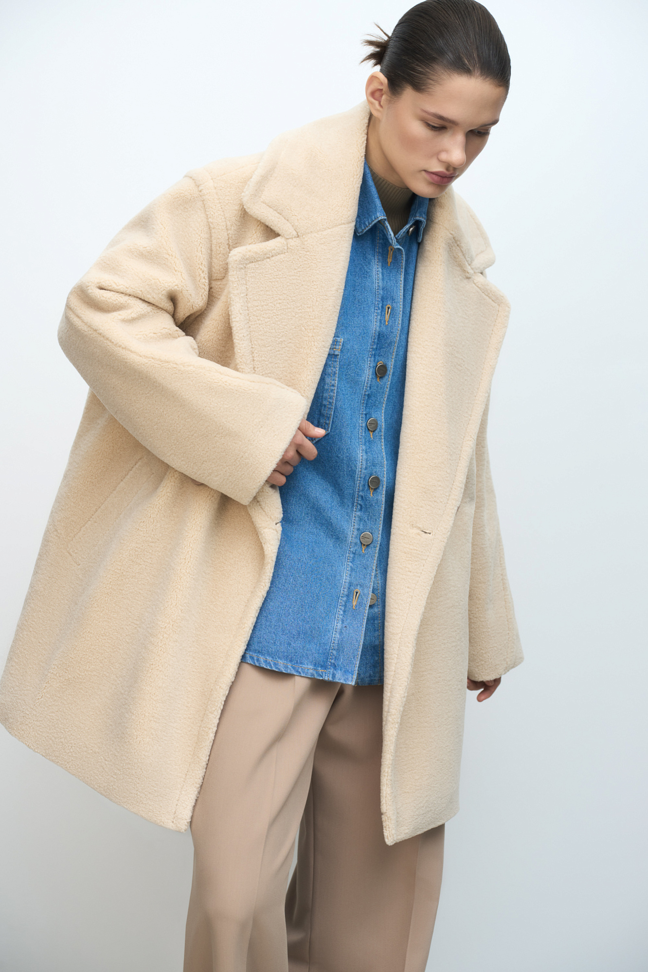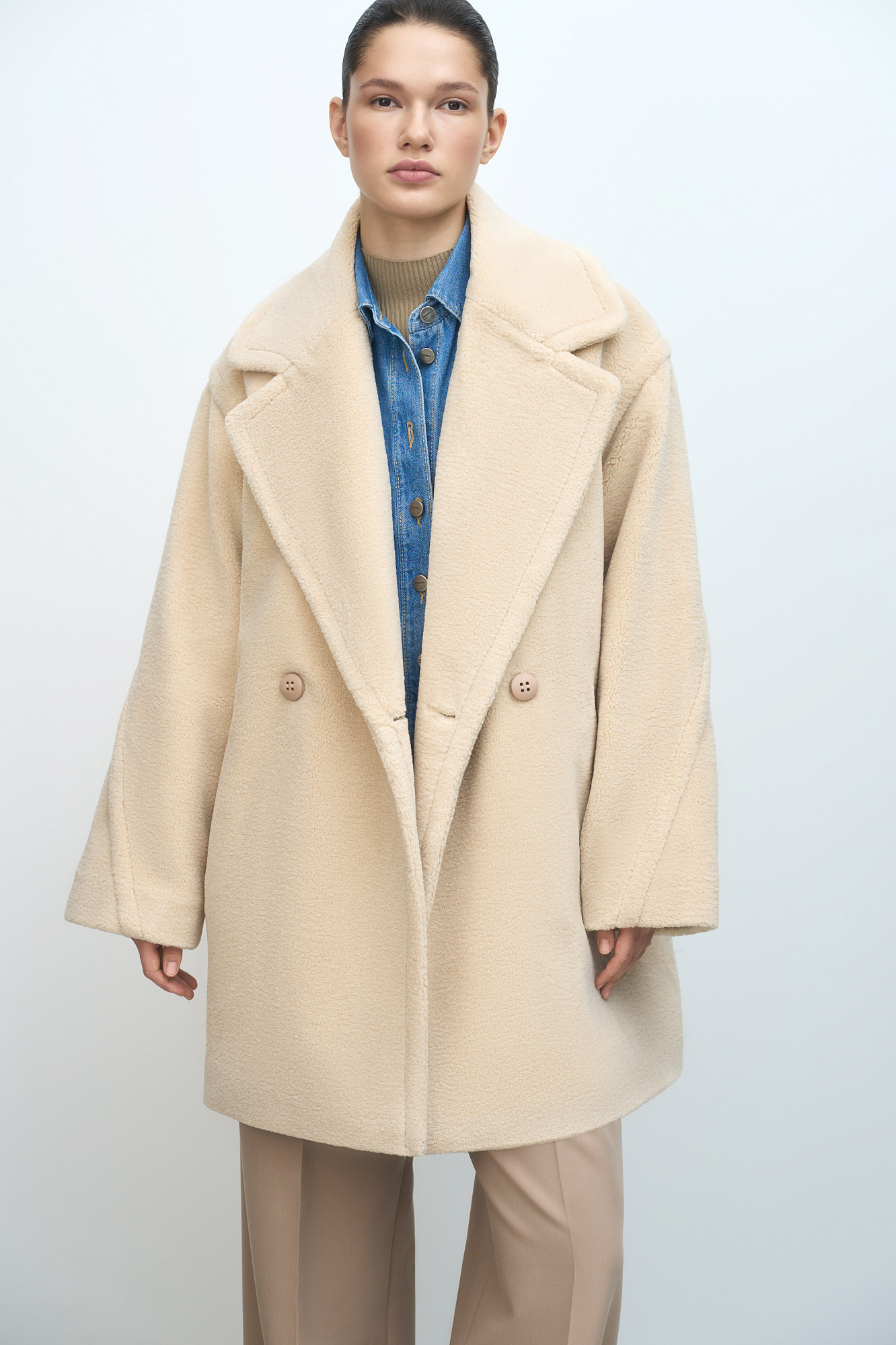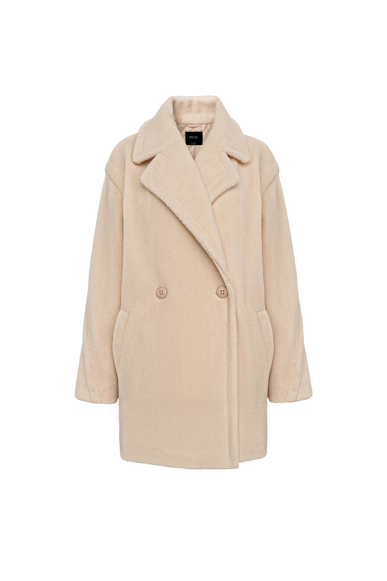 Шуба из экомеха. Модель свободного силуэта со спущенной линией плеча, боковыми карманами и застежкой на пуговицы. Отложной воротник с прямоугольными лацканами. На подкладке.