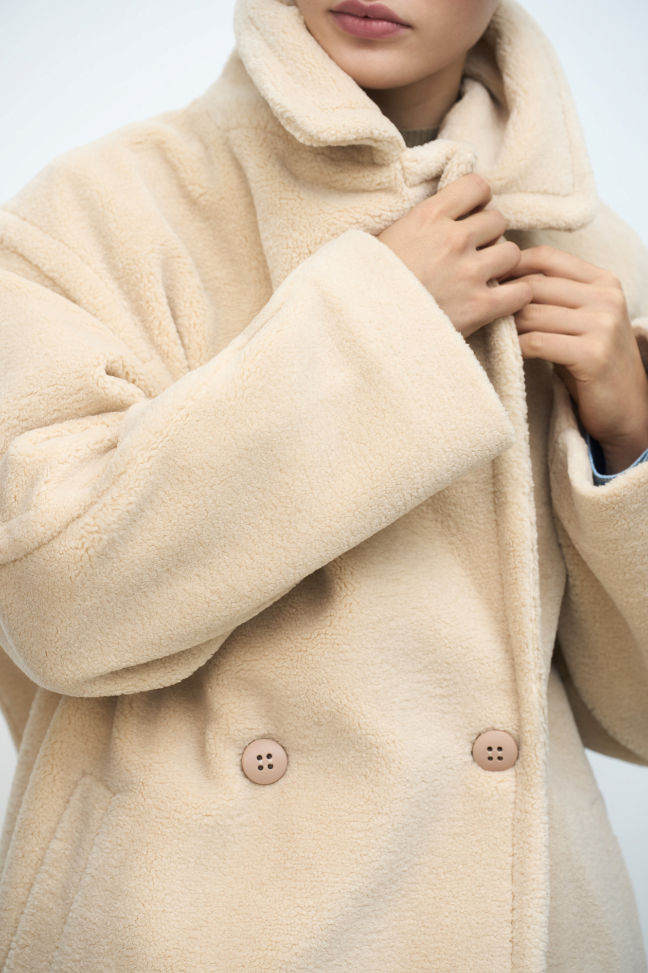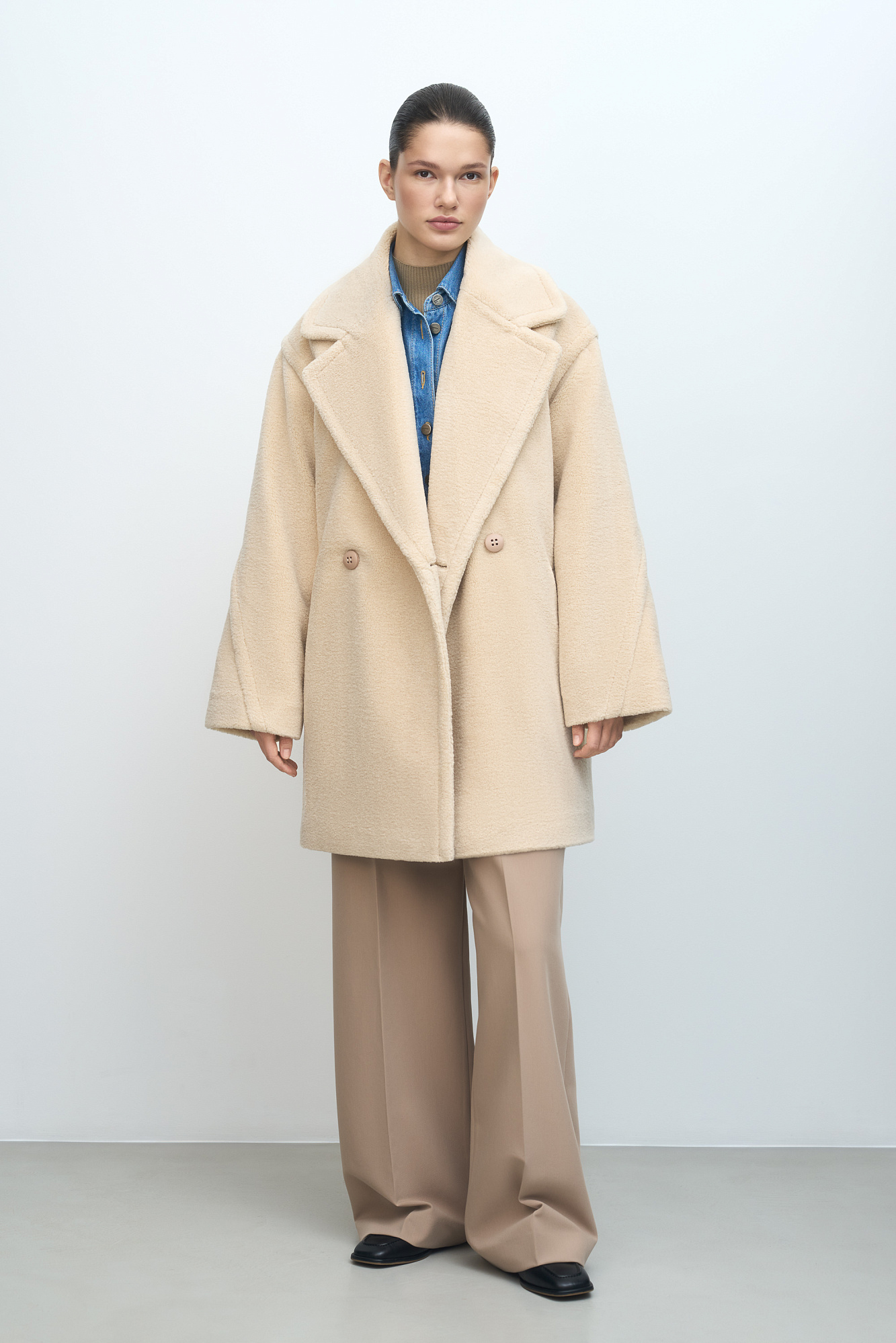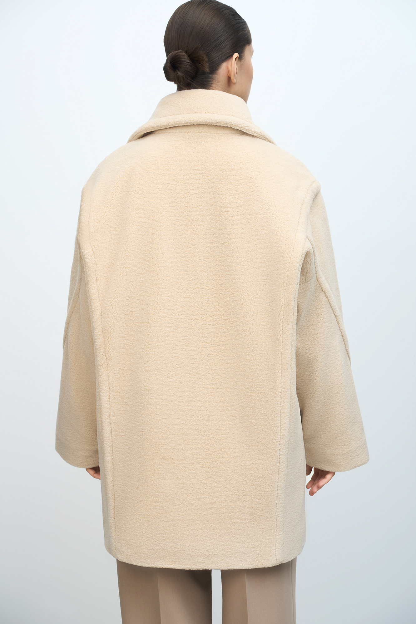 Шуба из экомеха. Модель свободного силуэта со спущенной линией плеча, боковыми карманами и застежкой на пуговицы. Отложной воротник с прямоугольными лацканами. На подкладке.