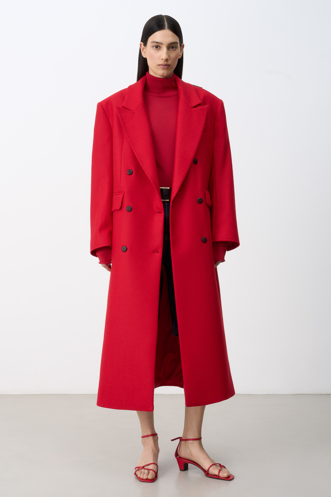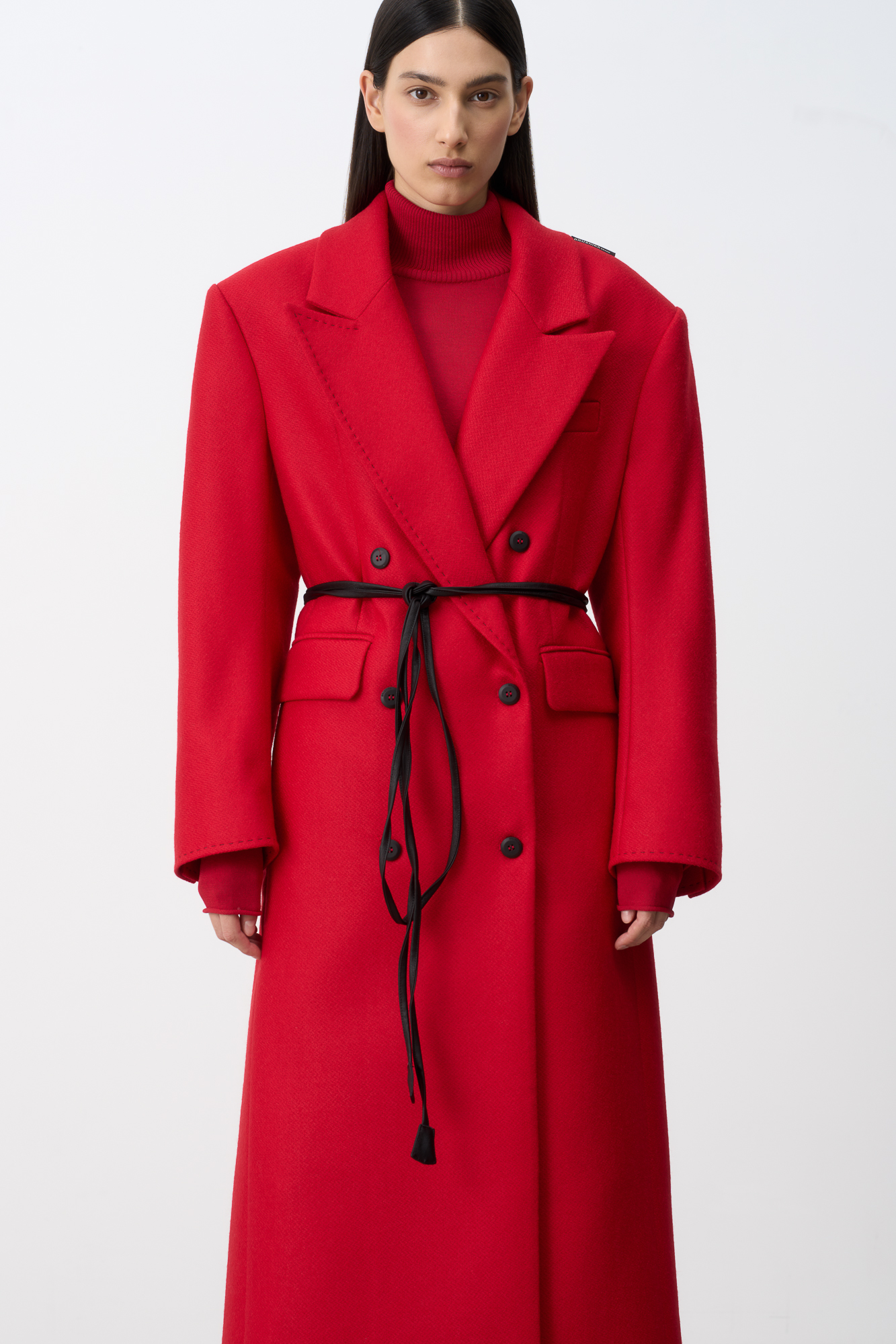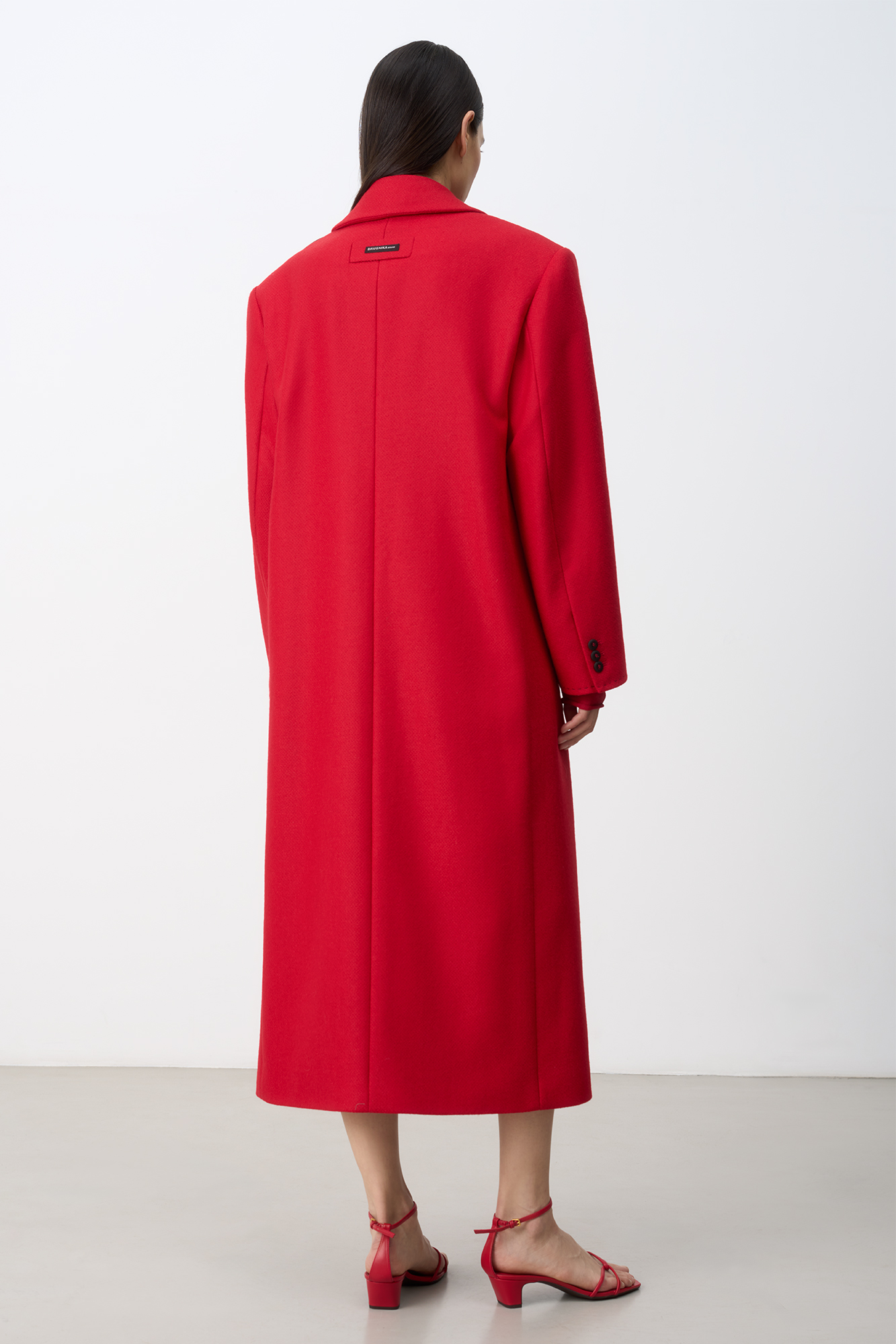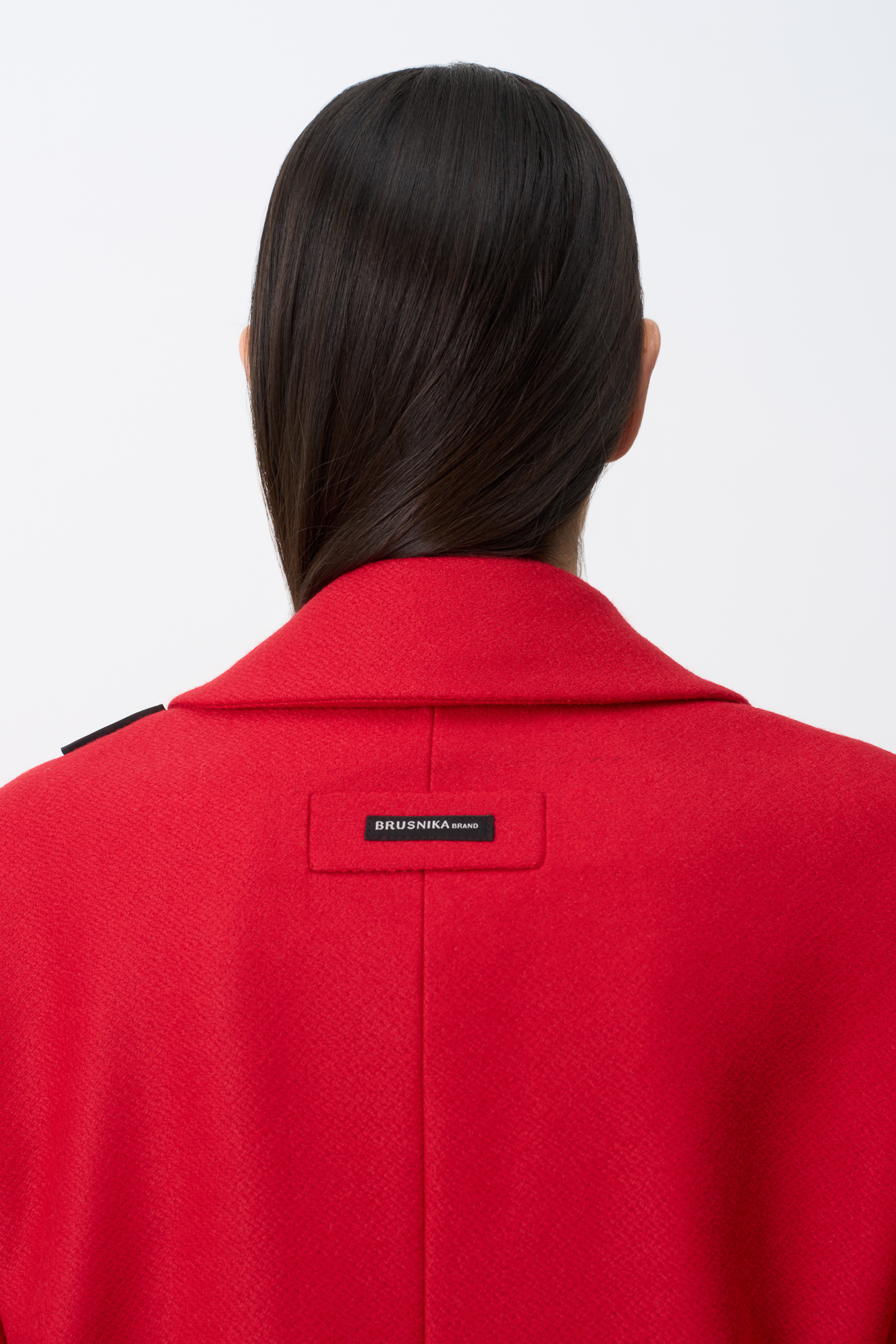 Двубортное пальто свободного силуэта с английским воротником, боковыми карманами, брендированным ярлыком сзади и застежкой на пуговицы. В комплекте тонкий пояс из экокожи. На подкладке.