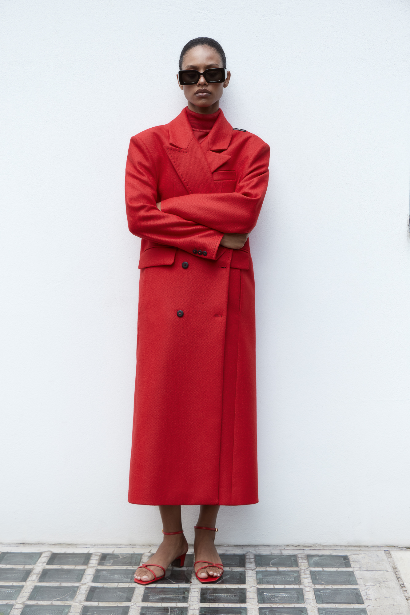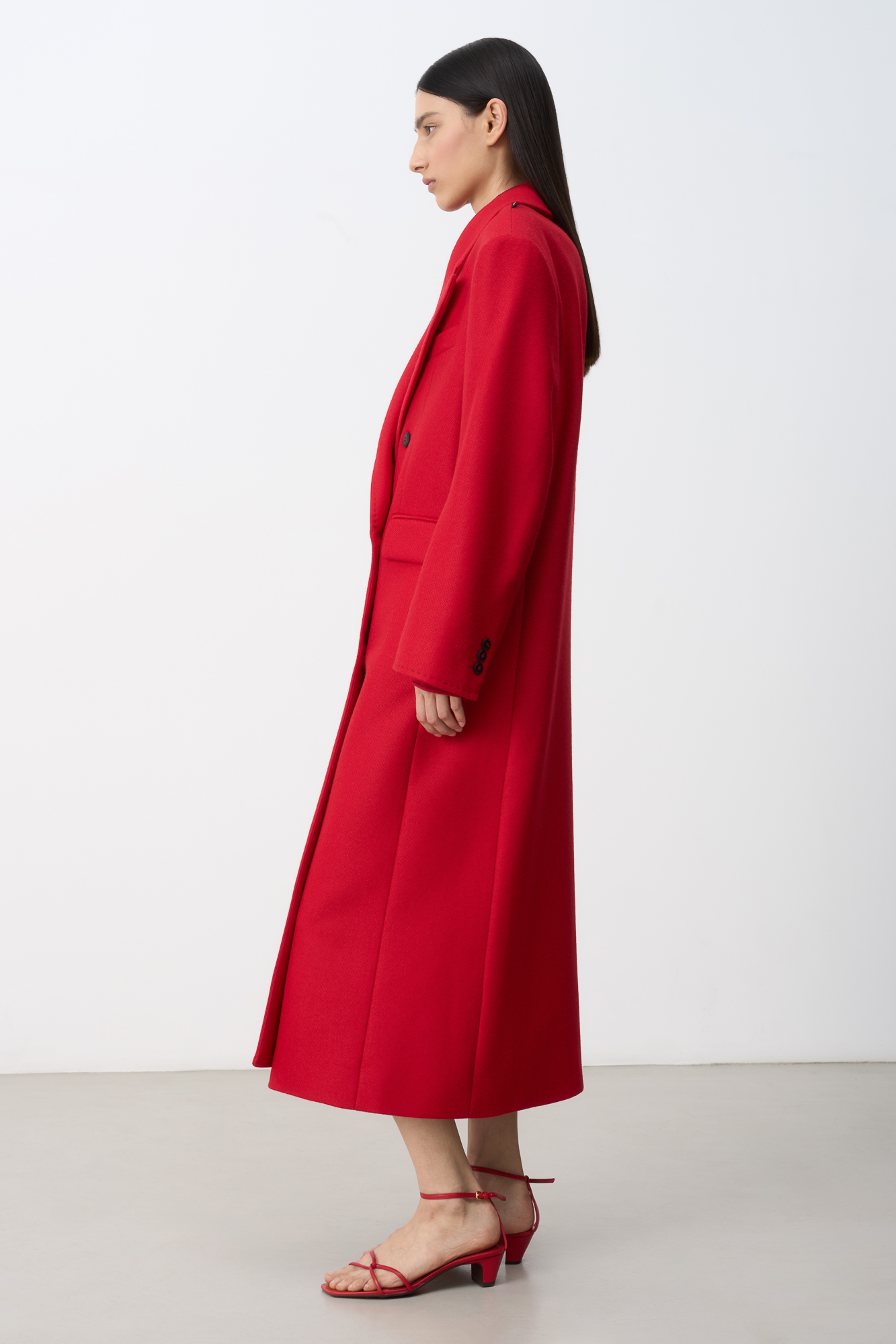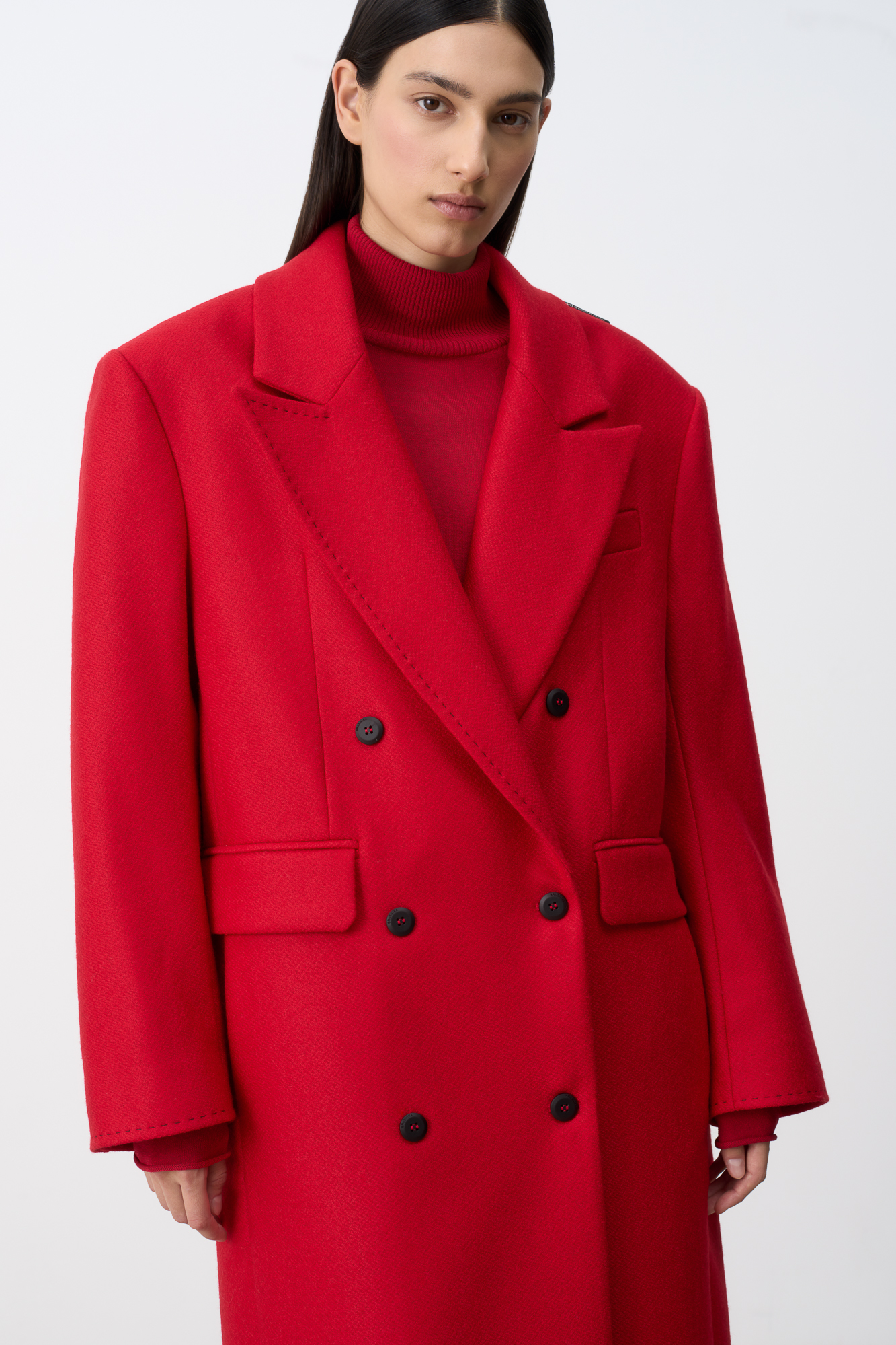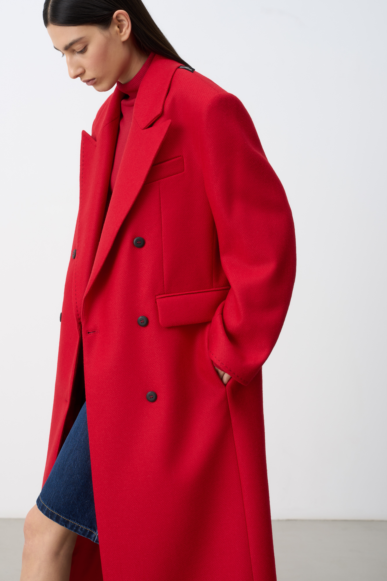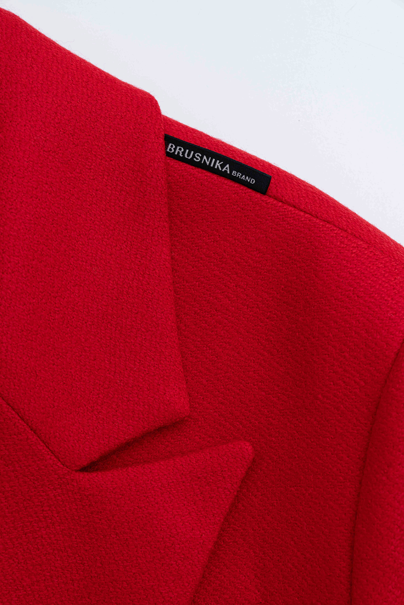 Двубортное пальто свободного силуэта с английским воротником, боковыми карманами, брендированным ярлыком сзади и застежкой на пуговицы. В комплекте тонкий пояс из экокожи. На подкладке.