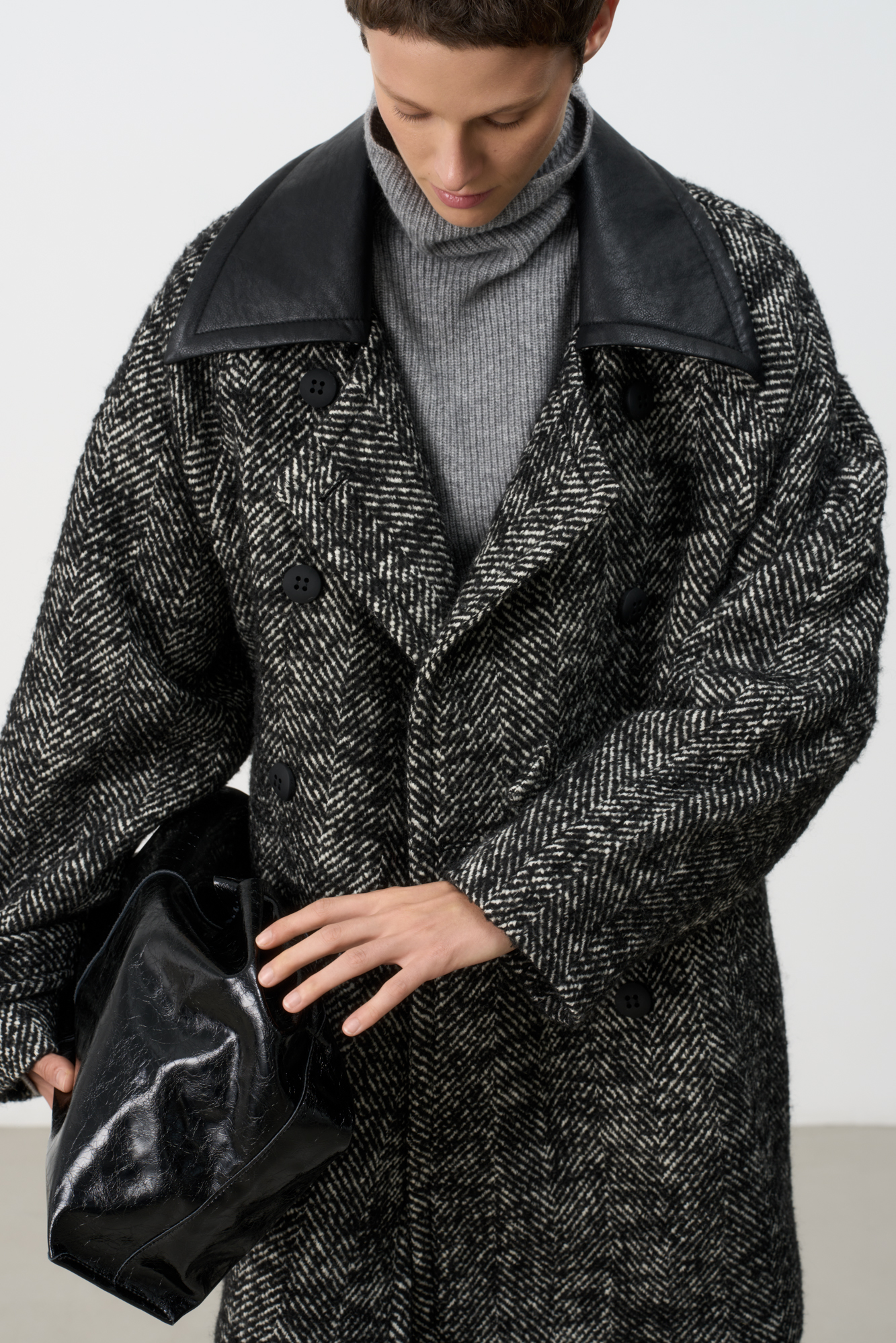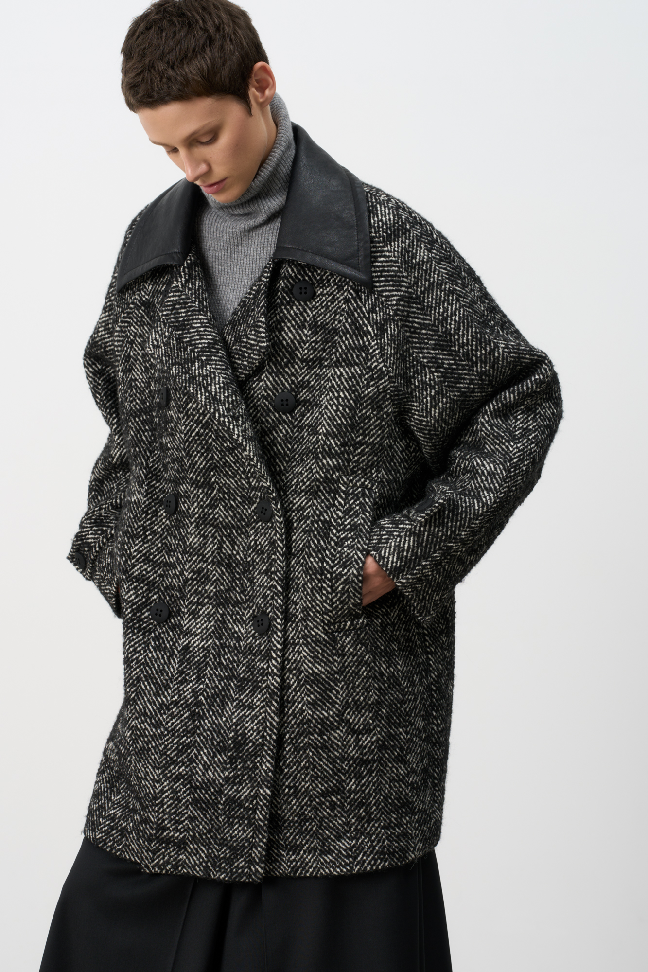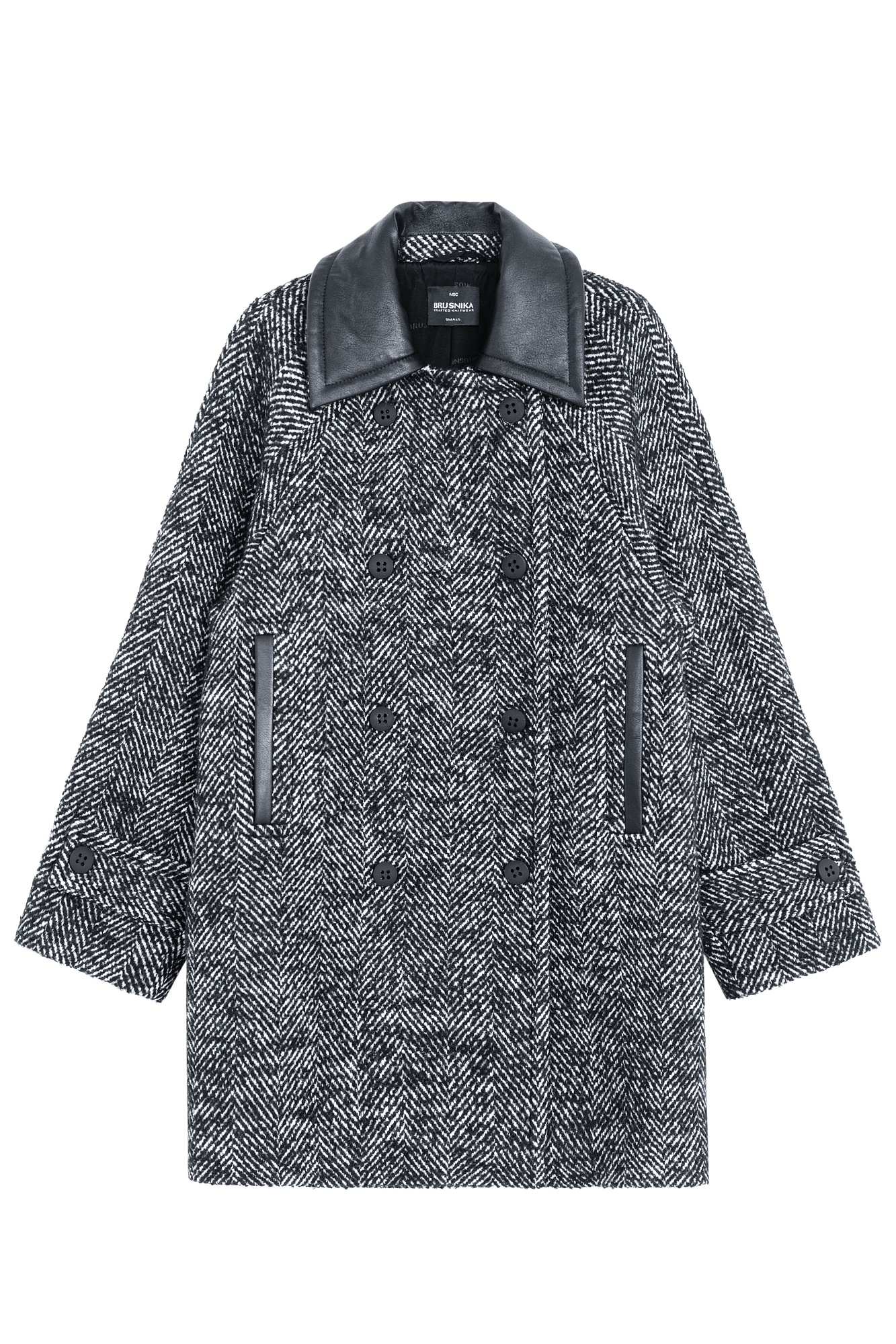 Шерстяное двубортное пальто на подкладке. Модель свободного силуэта с воротником из экокожи и боковыми карманами.