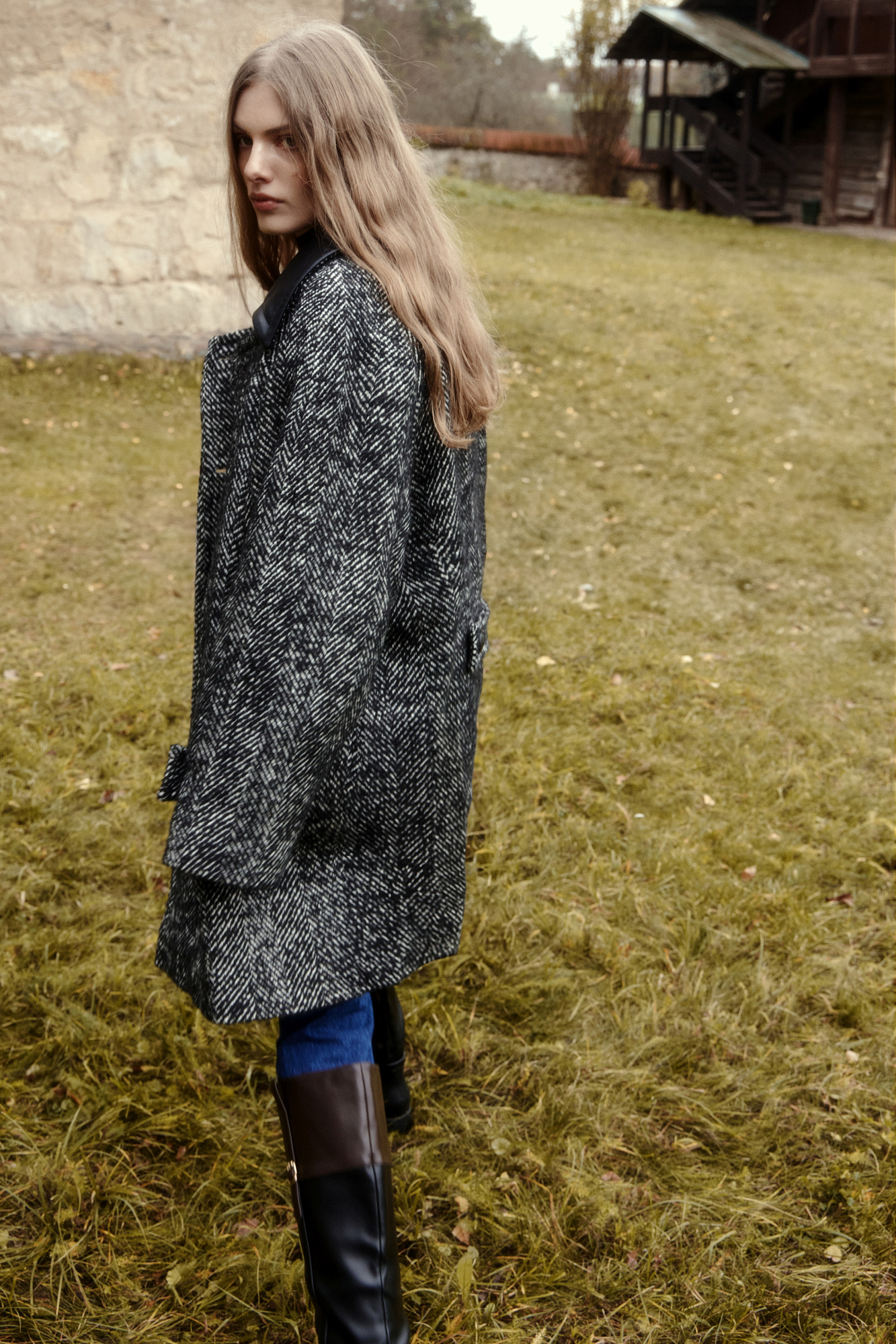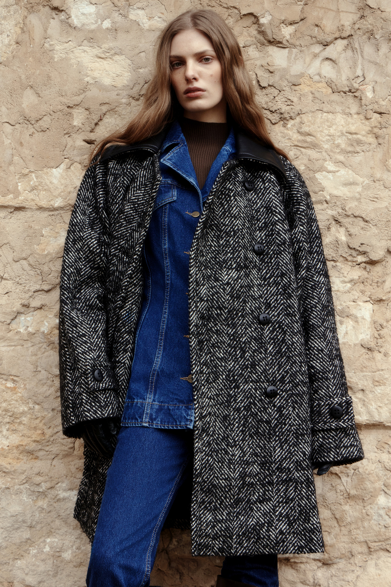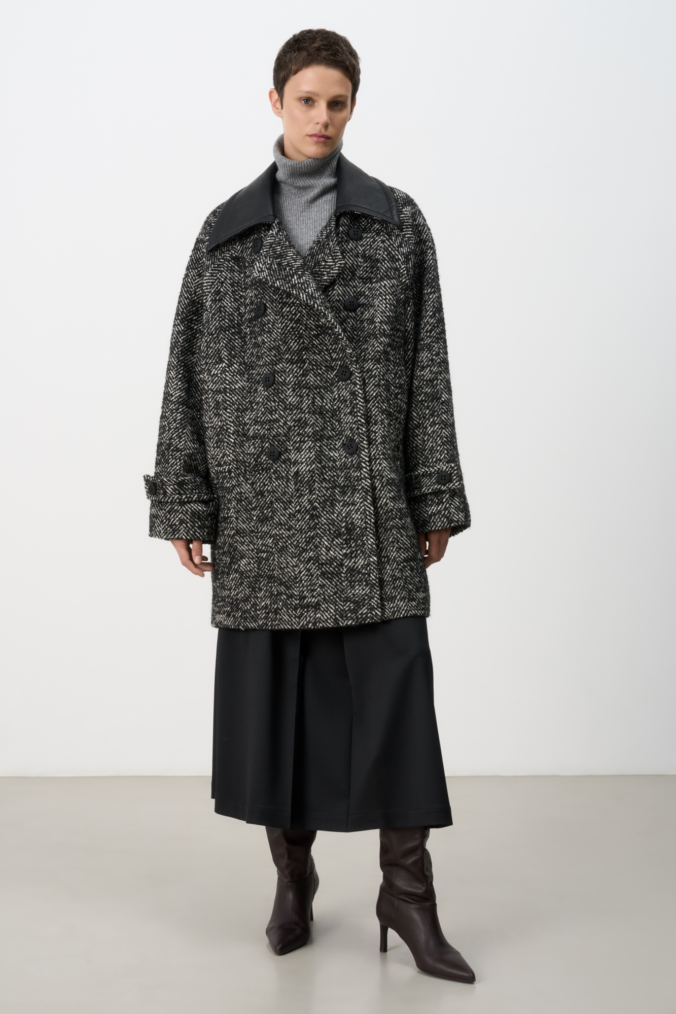Шерстяное двубортное пальто на подкладке. Модель свободного силуэта с воротником из экокожи и боковыми карманами.