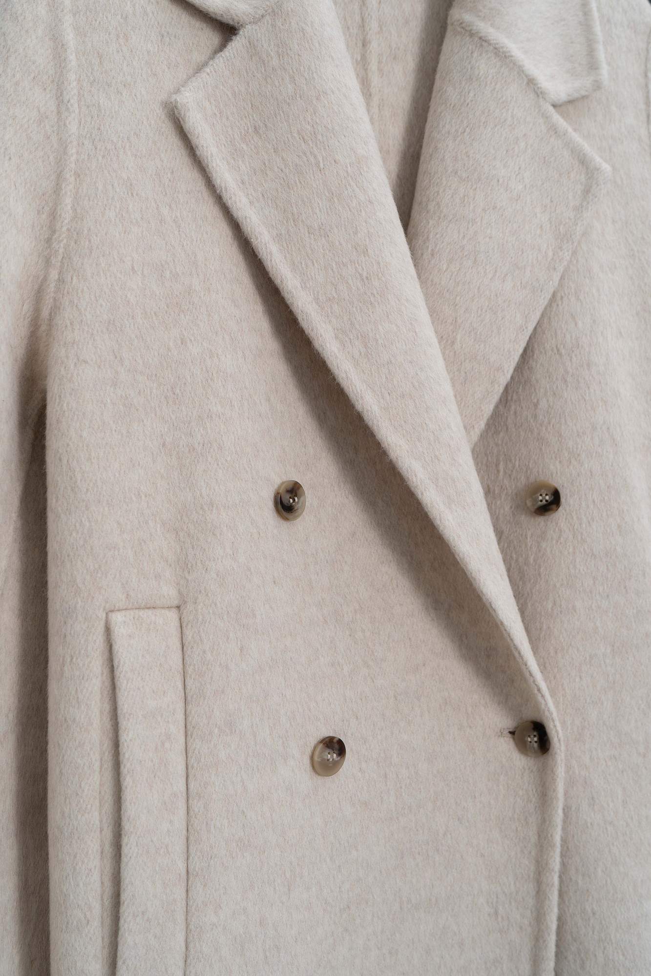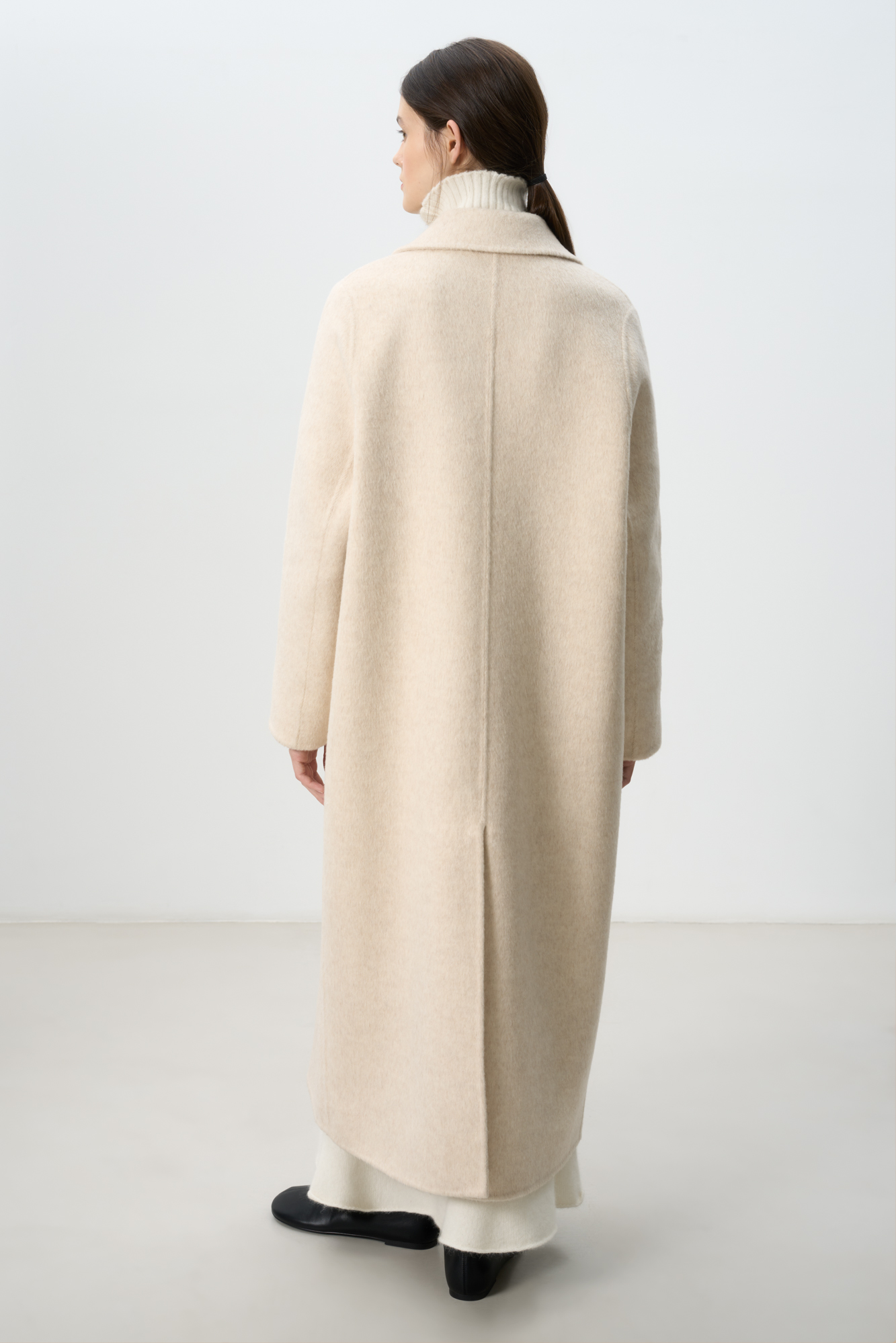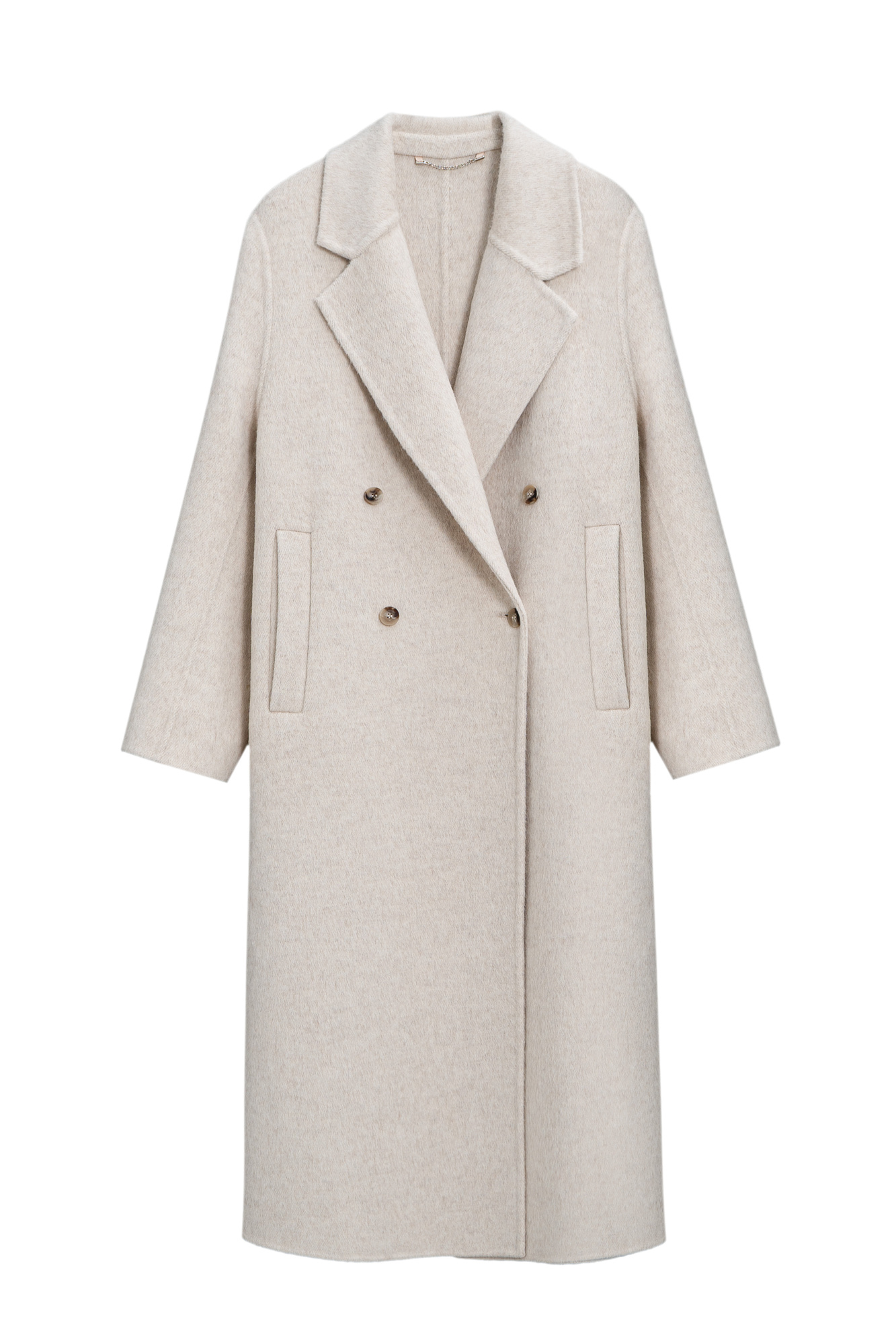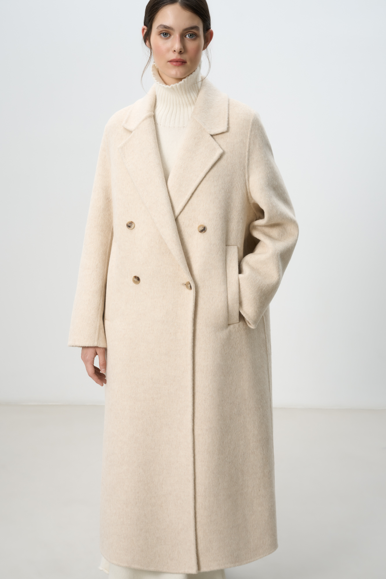 Двубортное шерстяное пальто свободного силуэта с английским воротником, боковыми карманами и застежкой на пуговицы.