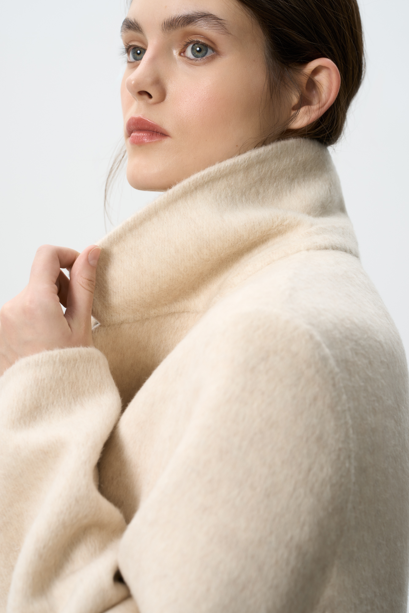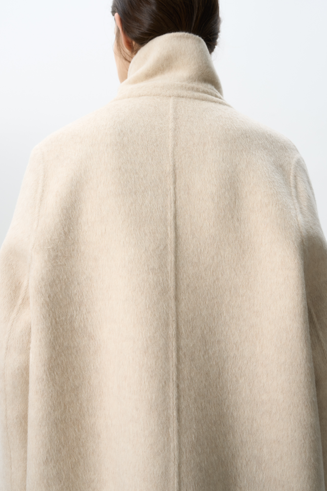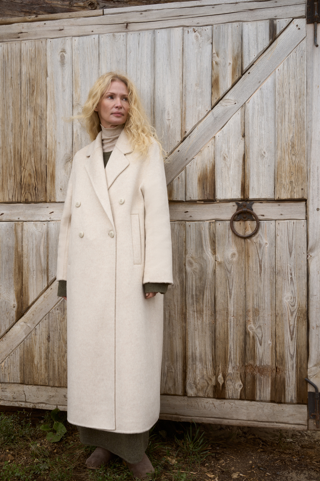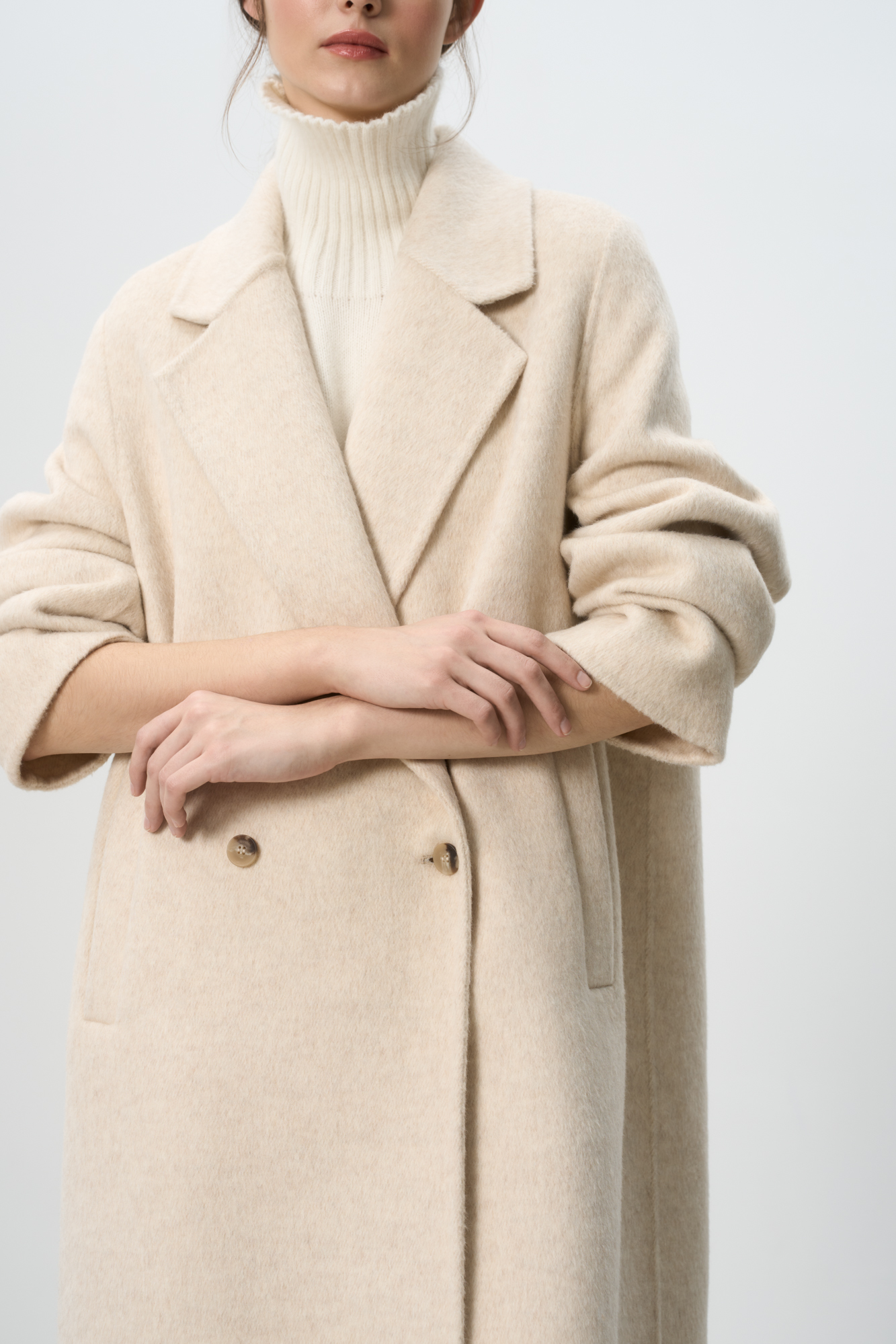 Двубортное шерстяное пальто свободного силуэта с английским воротником, боковыми карманами и застежкой на пуговицы.