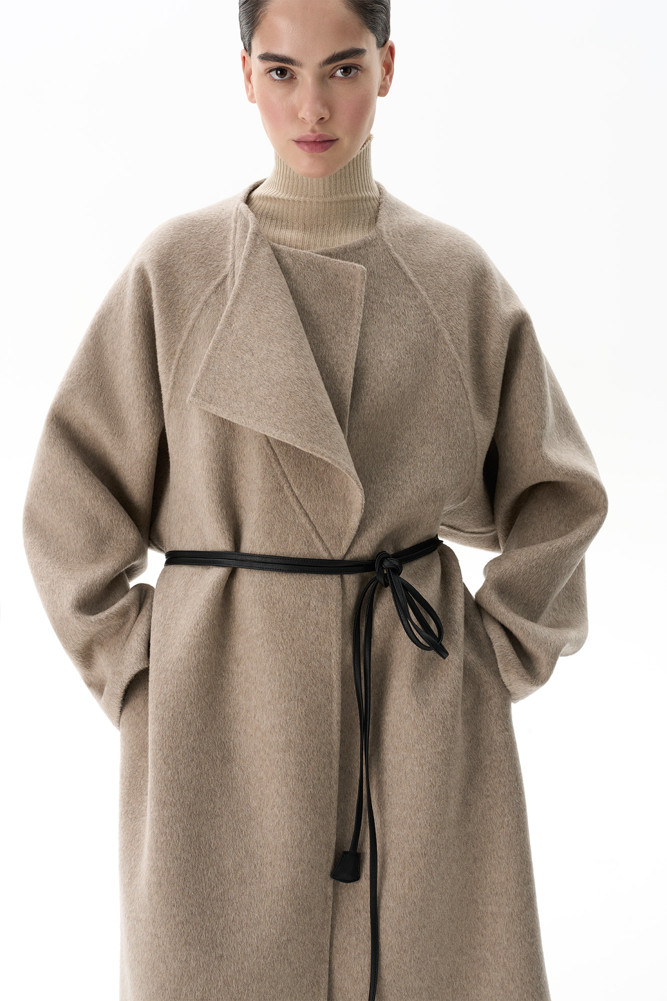 Шерстяное пальто из двусторонней ткани. Модель прямого кроя без воротника. Застежка на скрытые магнитные пуговицы. Изделие без подкладки. Модель декорирована асимметричным лацканом. Пояс из экокожи в комплекте.