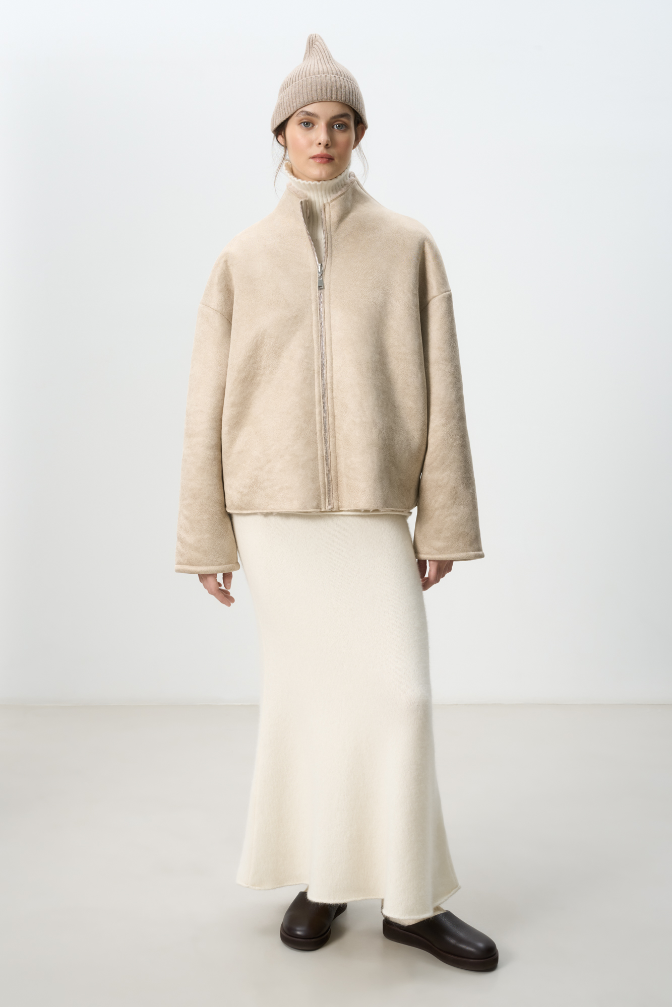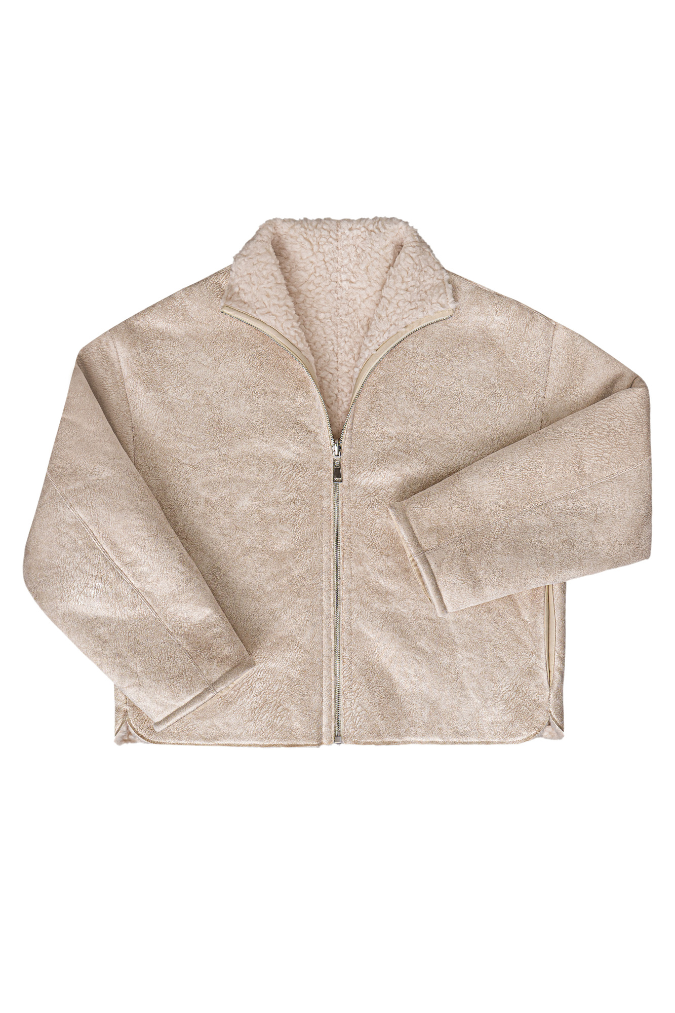 Двустороння короткая дубленка из шерсти. Модель прямого кроя, с воротником-стойкой и боковыми карманами. Застежка на молнию.