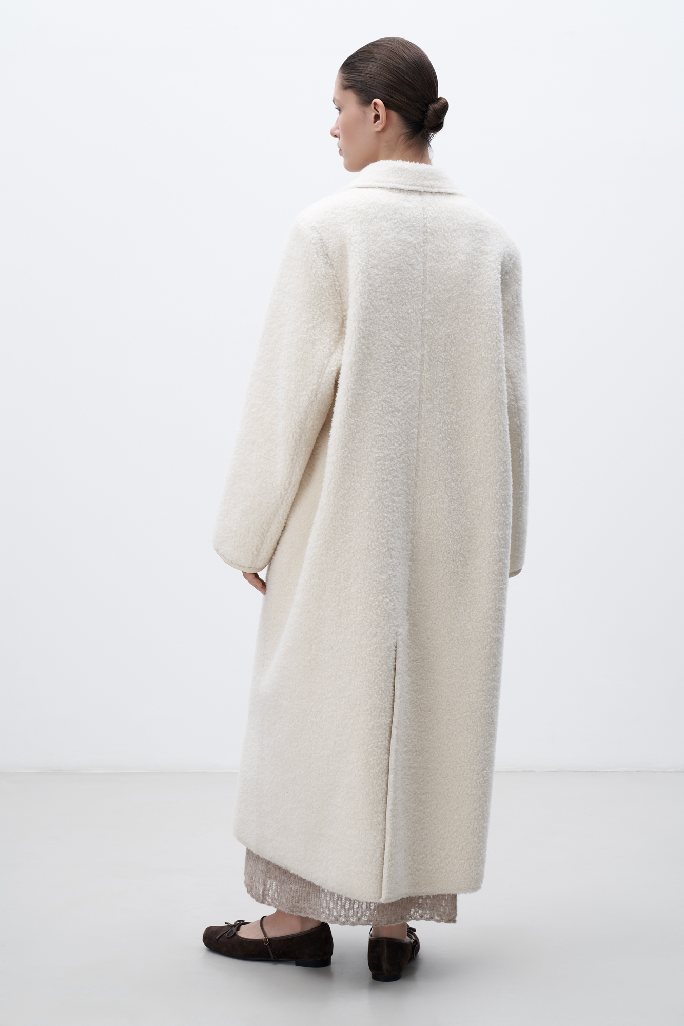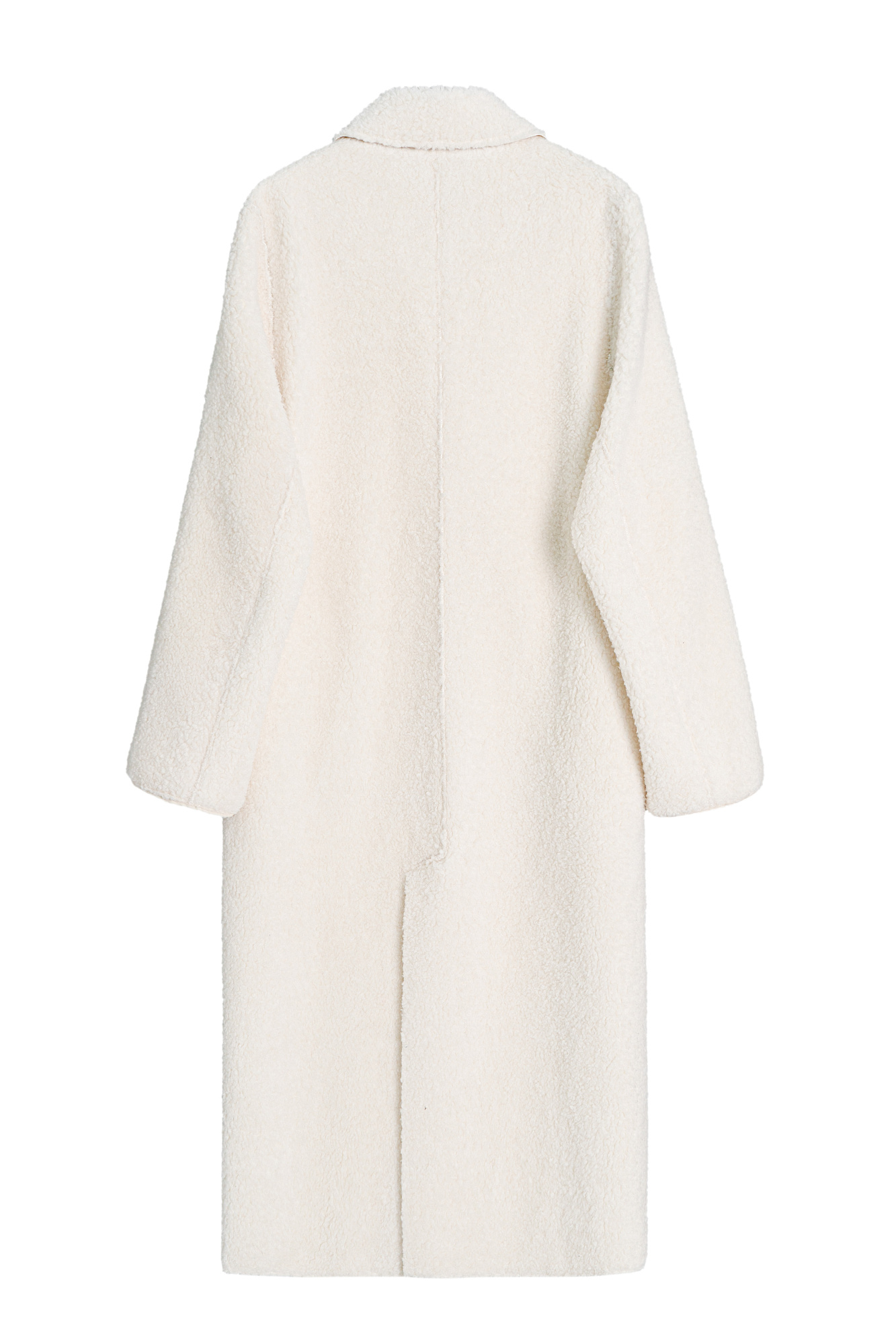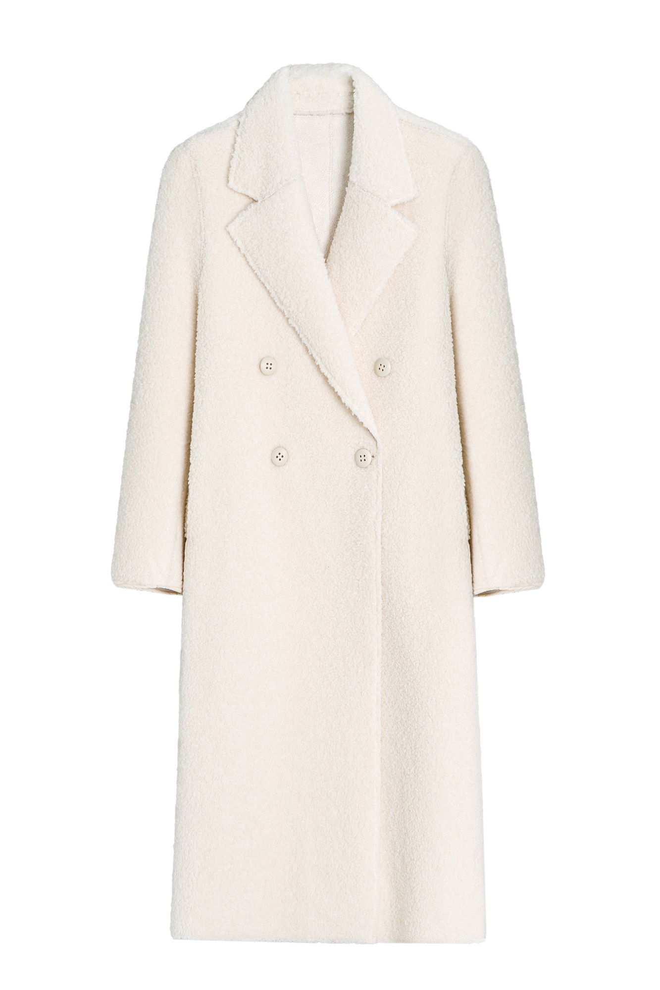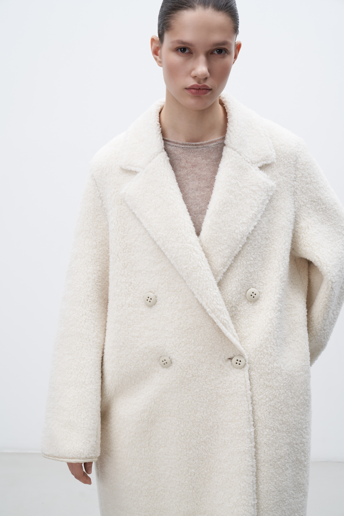 Двустороннее шерстяное пальто. Модель свободного силуэта с английским воротником, боковыми карманами и застежкой на пуговицы.