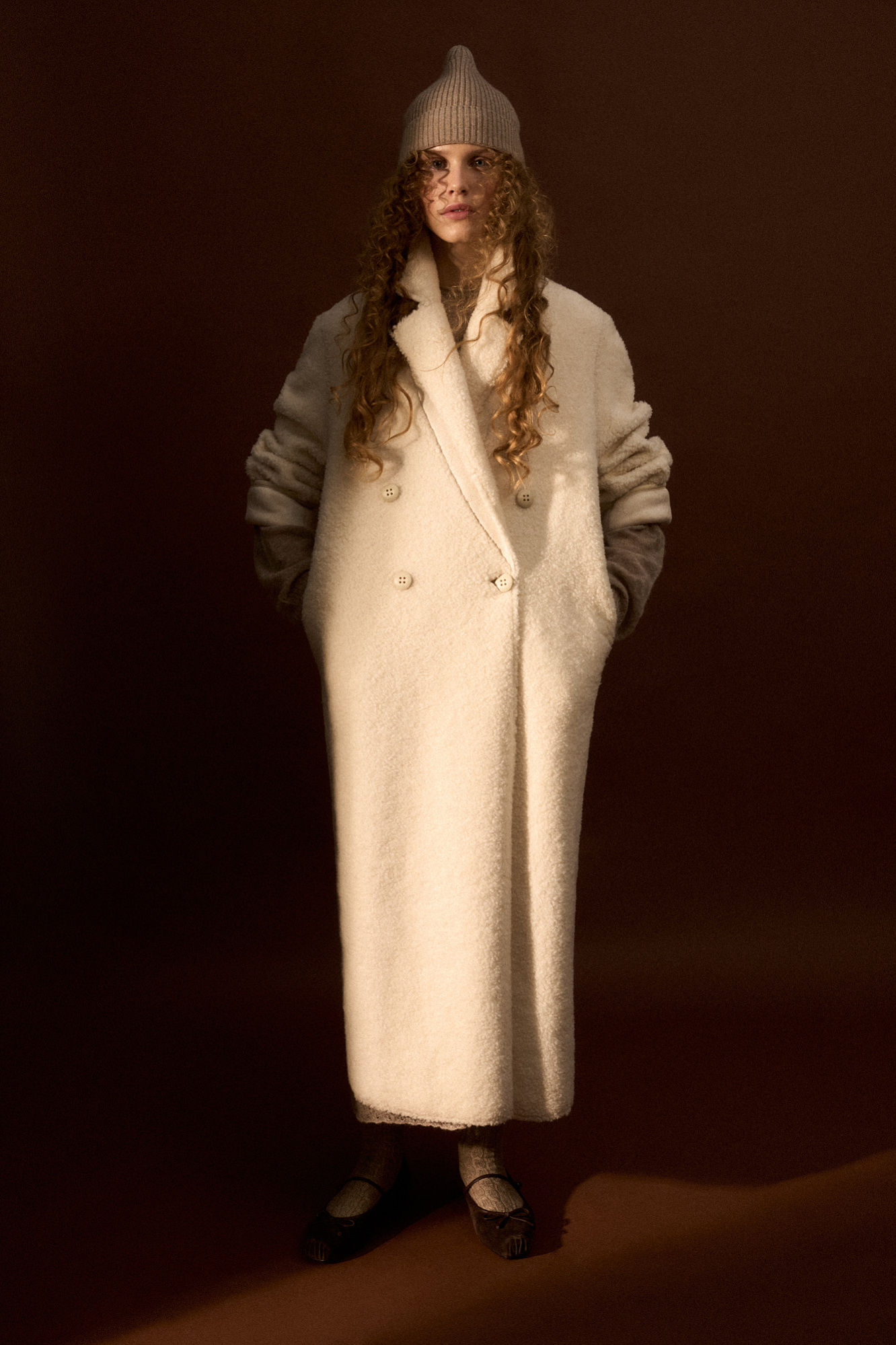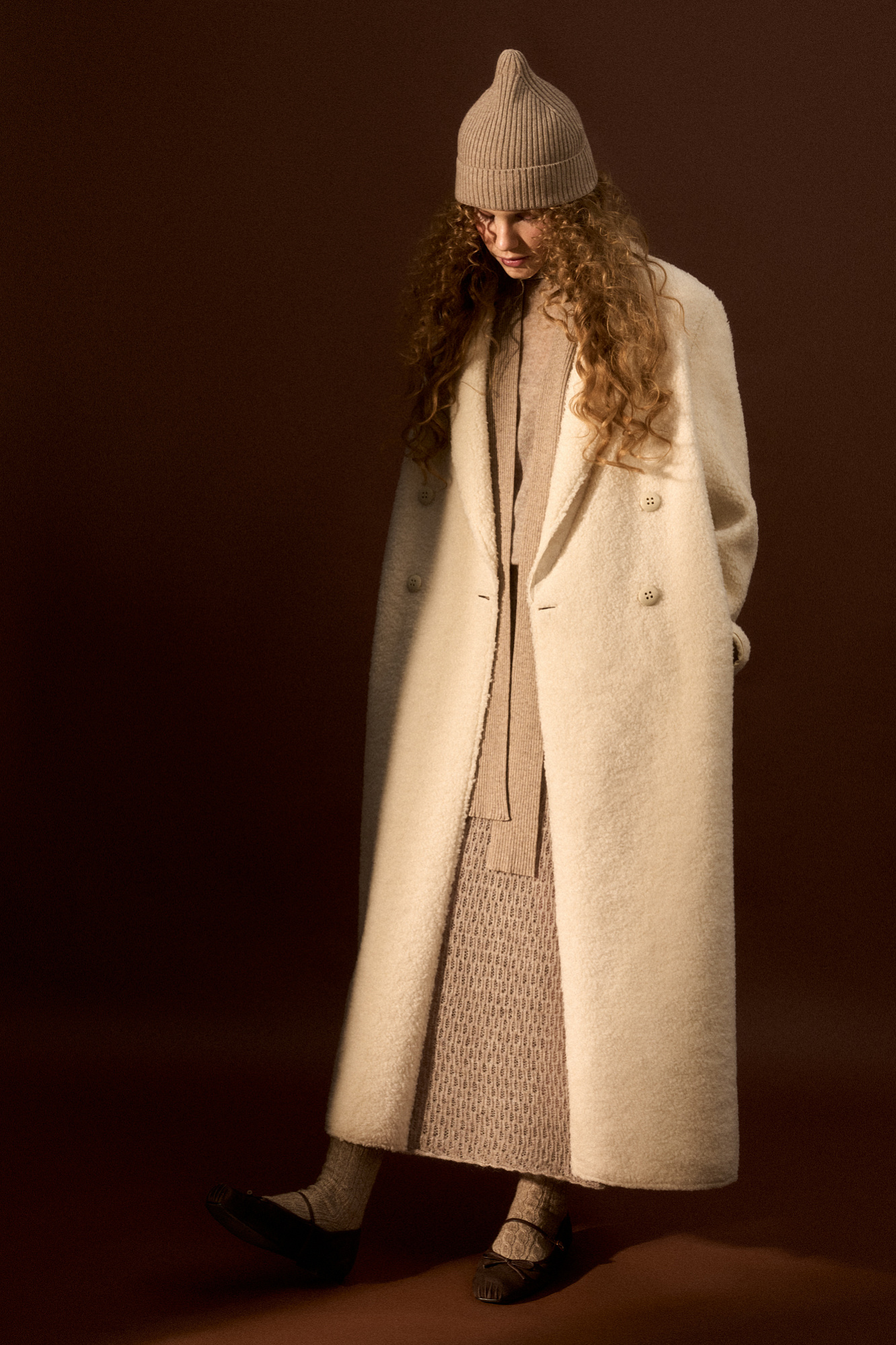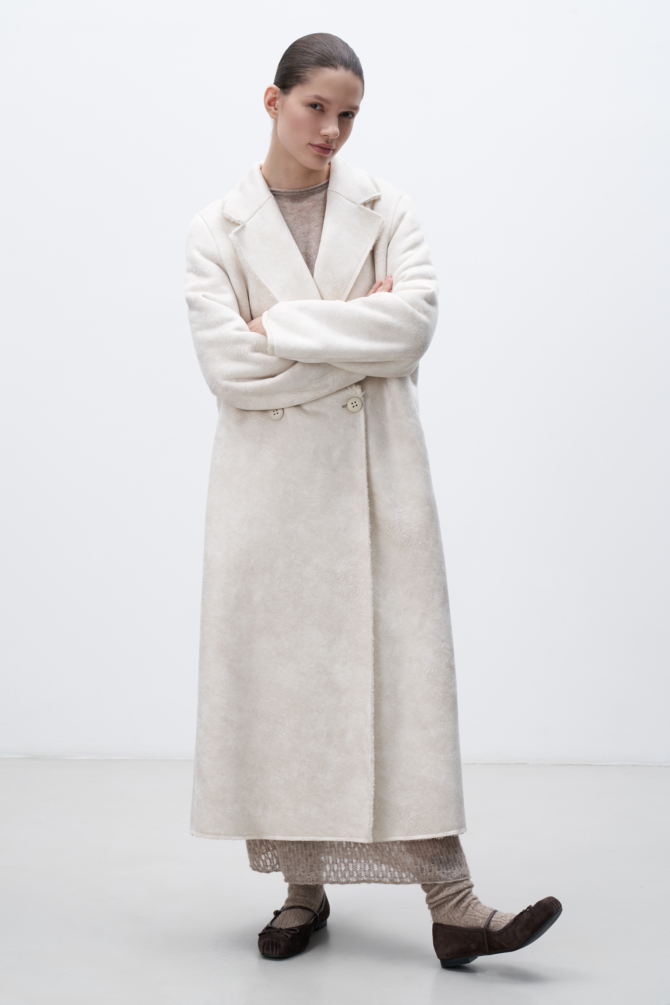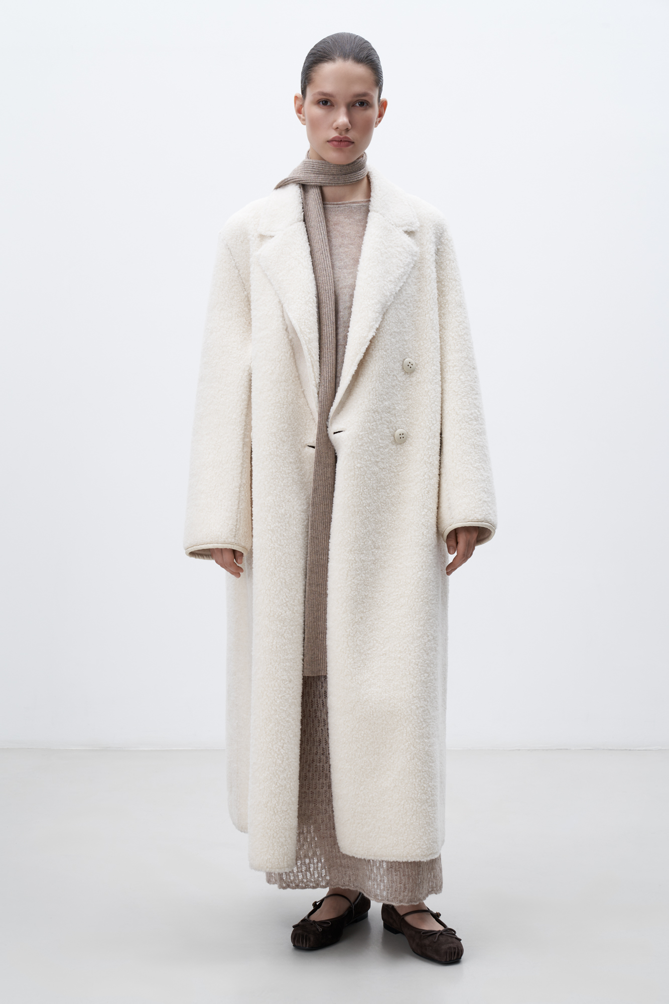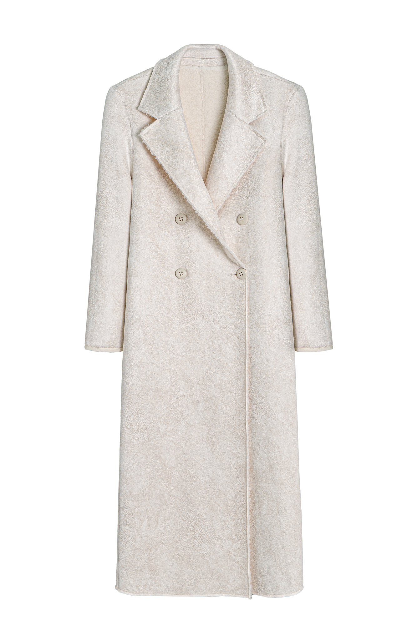 Двустороннее шерстяное пальто. Модель свободного силуэта с английским воротником, боковыми карманами и застежкой на пуговицы.