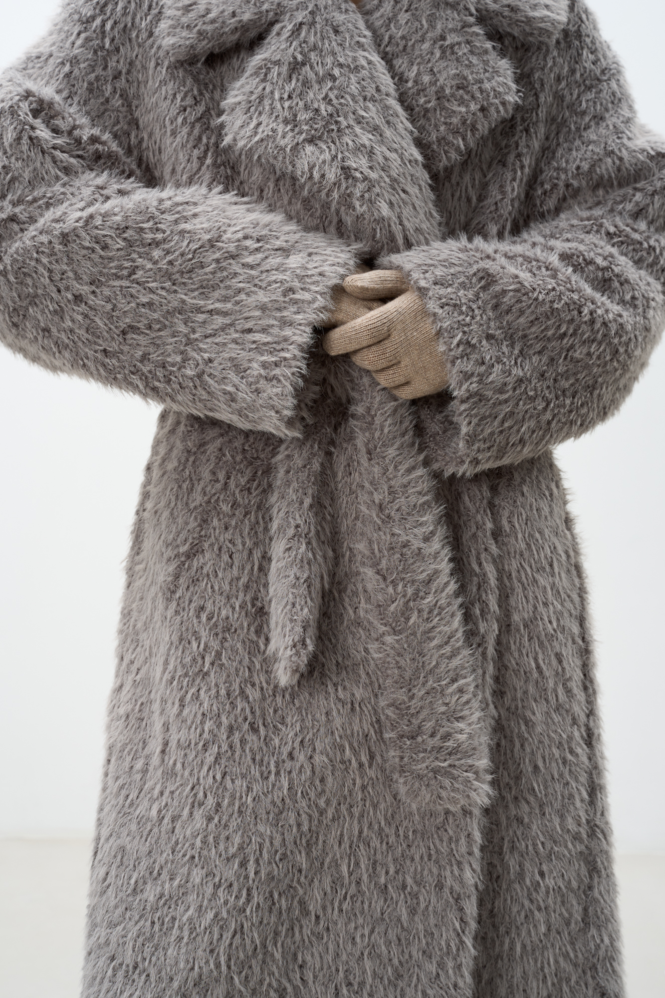 Длинное утепленное пальто из искусственного меха. Модель прямого силуэта с английским воротником, боковыми карманами и поясом из основного материала. Изделие на подкладке.