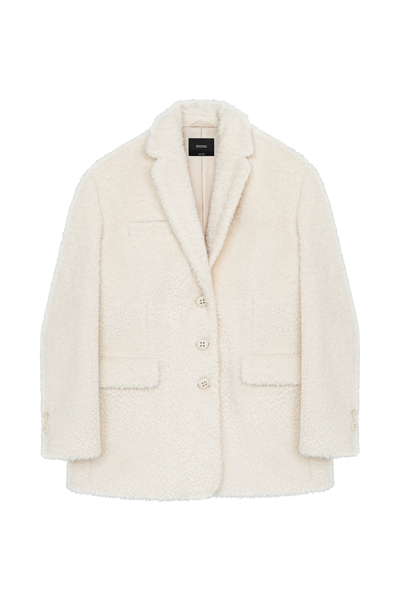 Жакет из искусственного меха с английским воротником и тонким поясом из экокожи. Застежка на пуговицы. Изделие на подкладке.