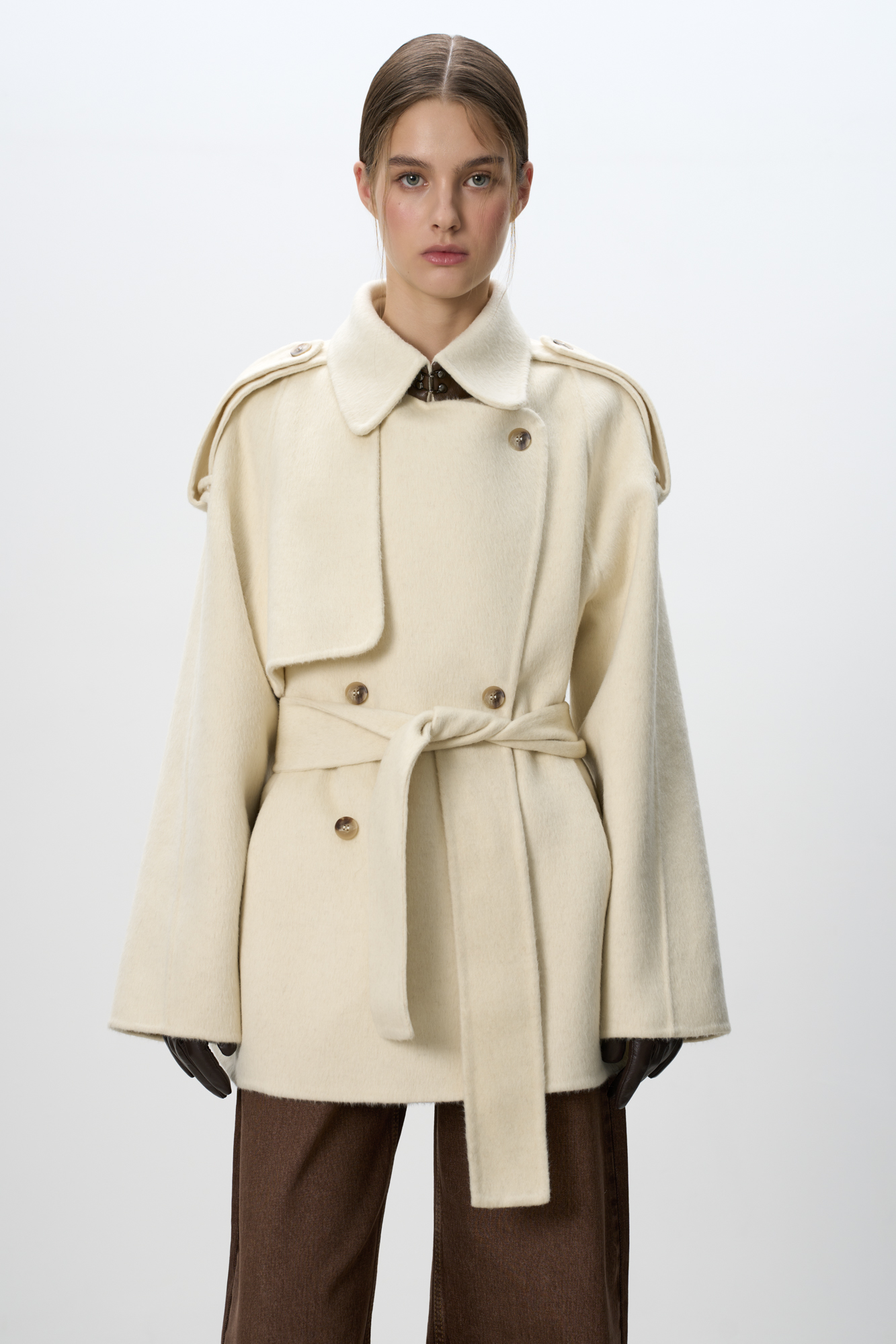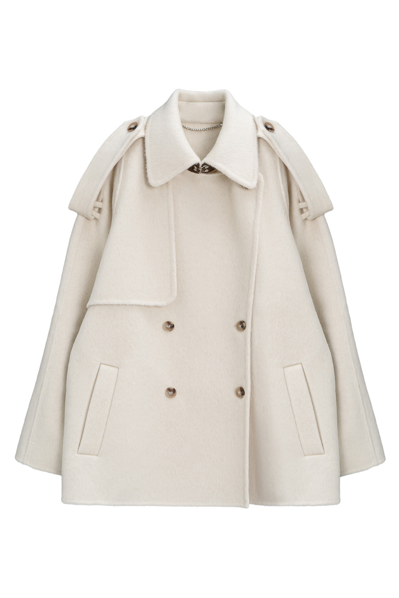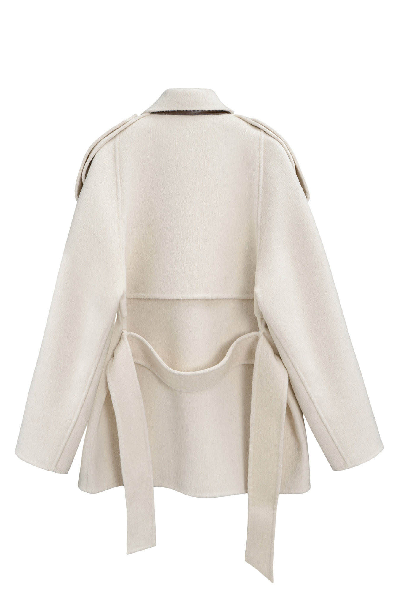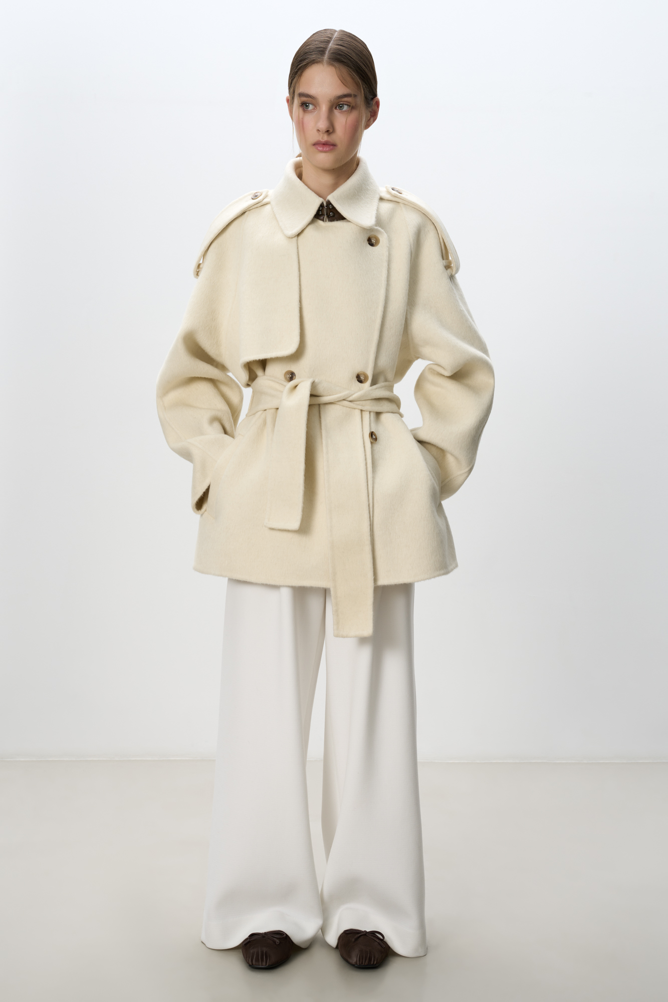Двубортное пальто с добавлением верблюжьей шерсти. Модель прямого свободного силуэта с отложным воротником и боковыми карманами. Изделие декорировано отлетной кокеткой и широкими лацканами на плечах. На талии расположены шлевки, через которые продевается пояс, выполненный из того же материала, что и пальто. Без подкладки.