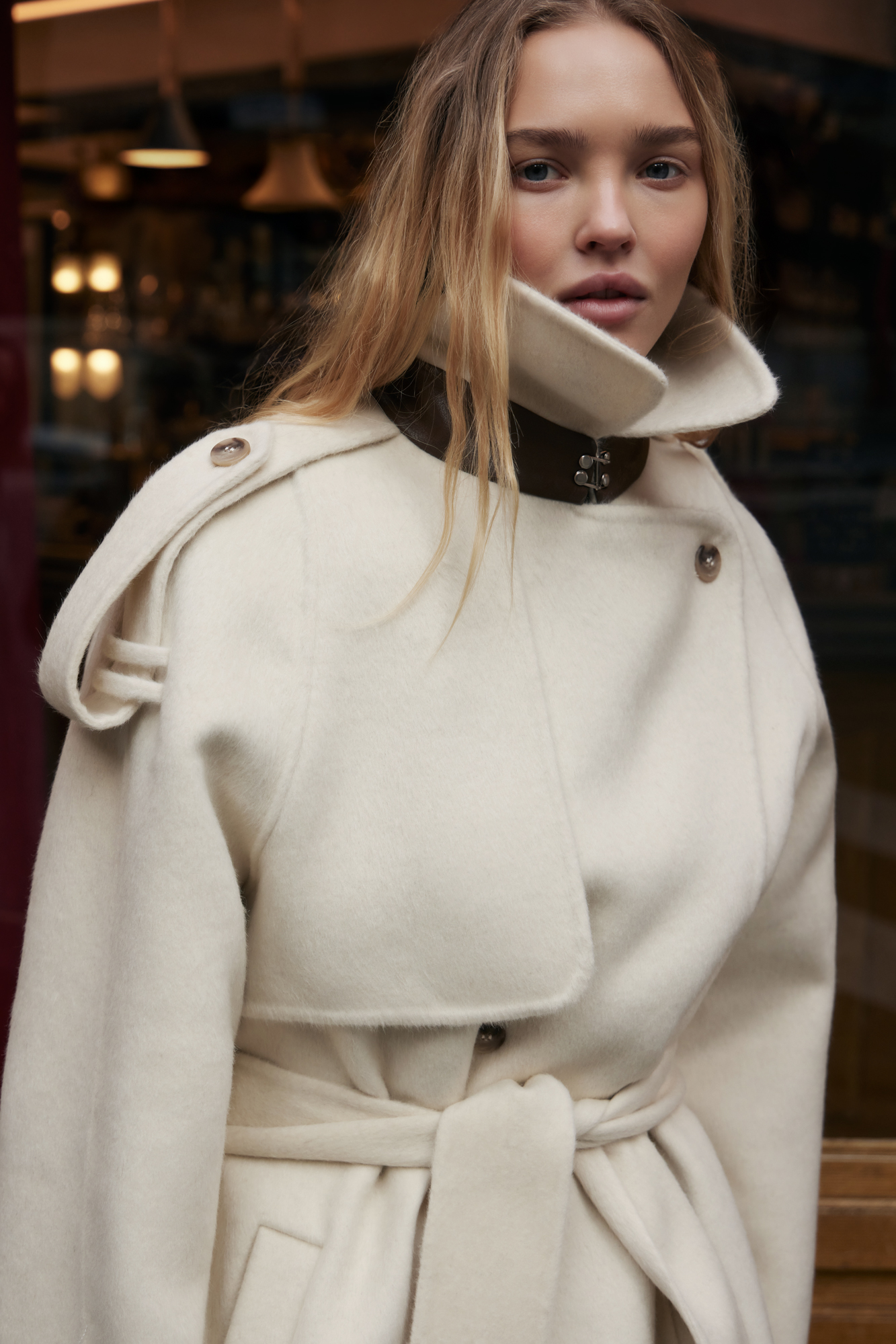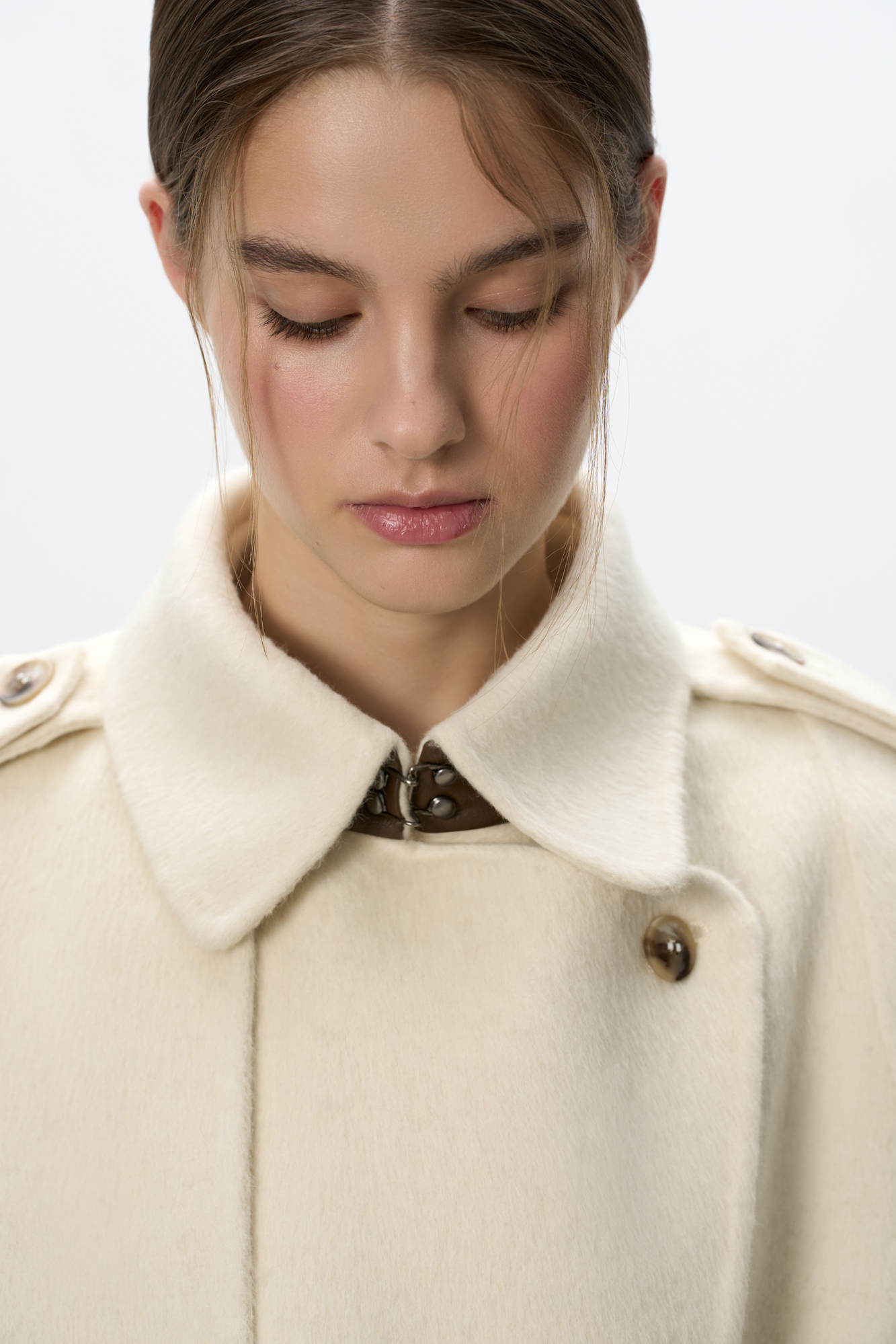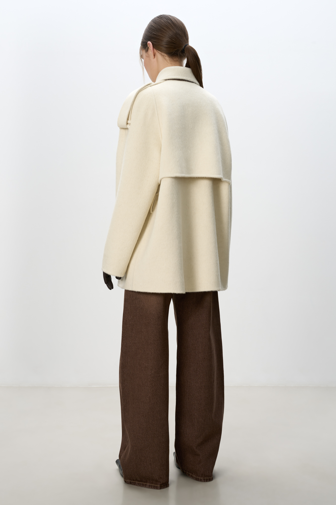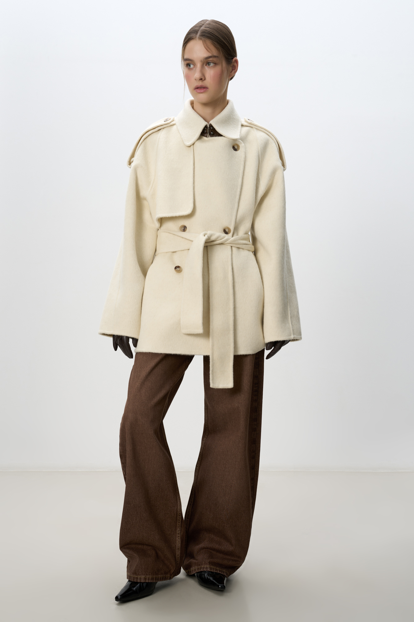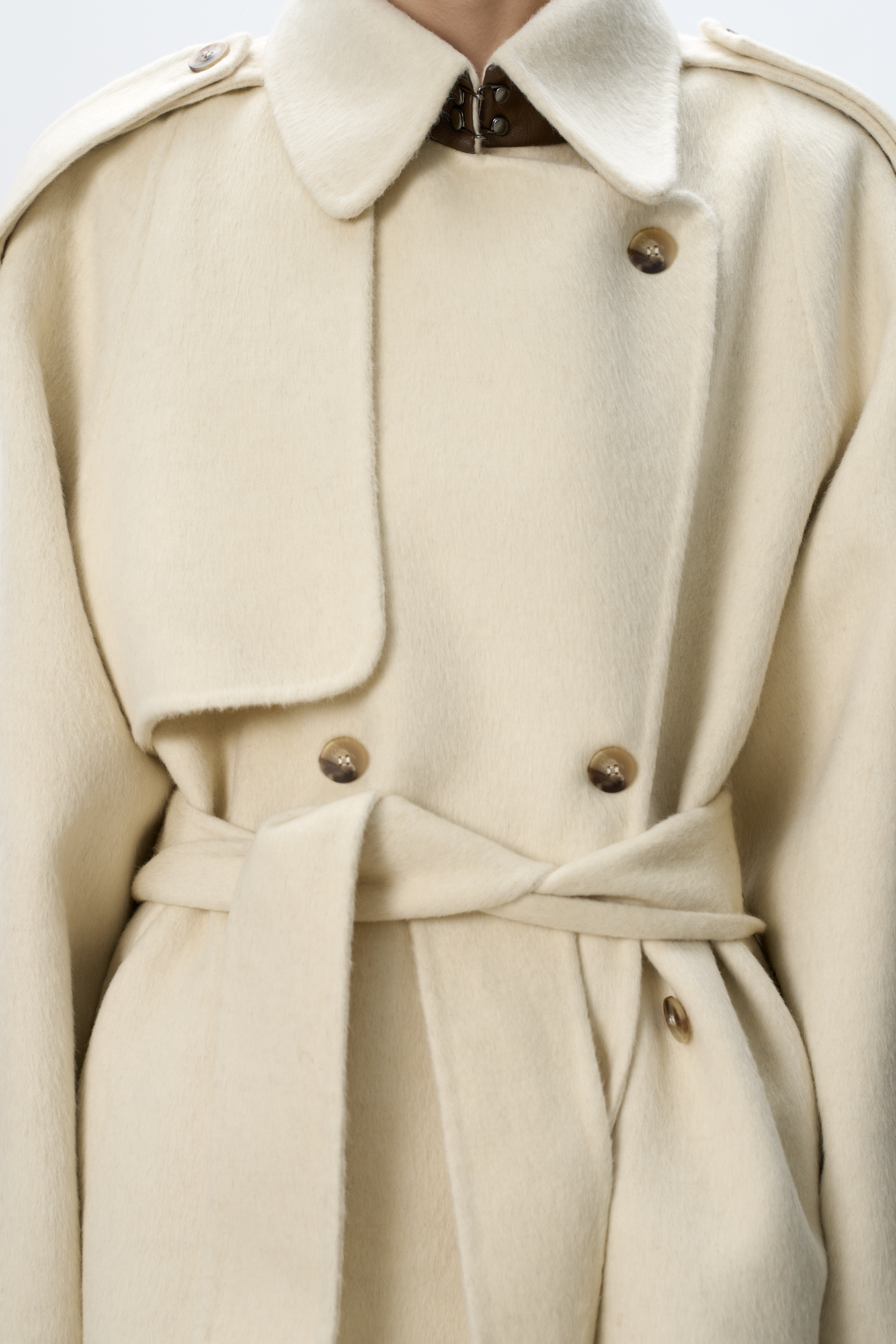 Двубортное пальто с добавлением верблюжьей шерсти. Модель прямого свободного силуэта с отложным воротником и боковыми карманами. Изделие декорировано отлетной кокеткой и широкими лацканами на плечах. На талии расположены шлевки, через которые продевается пояс, выполненный из того же материала, что и пальто. Без подкладки.