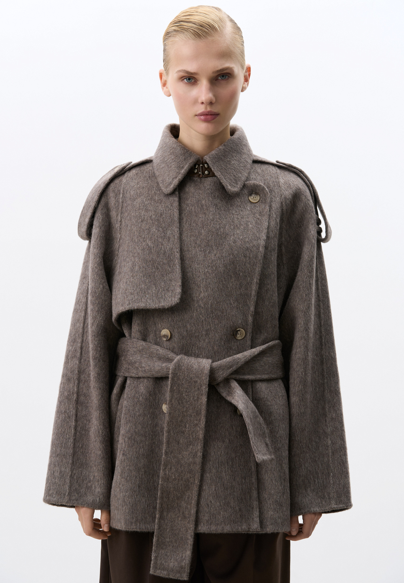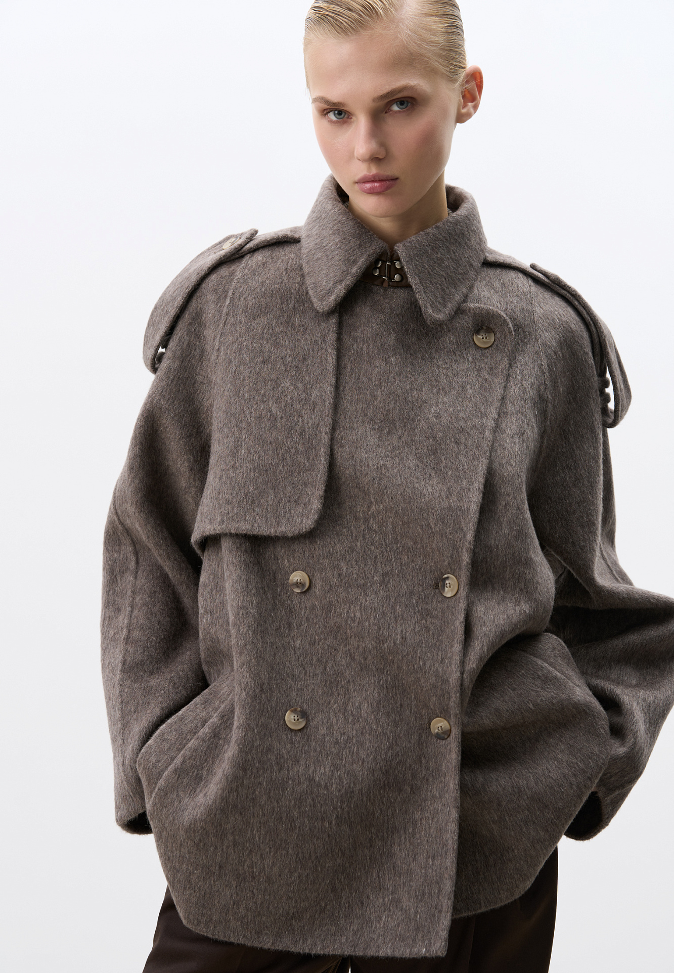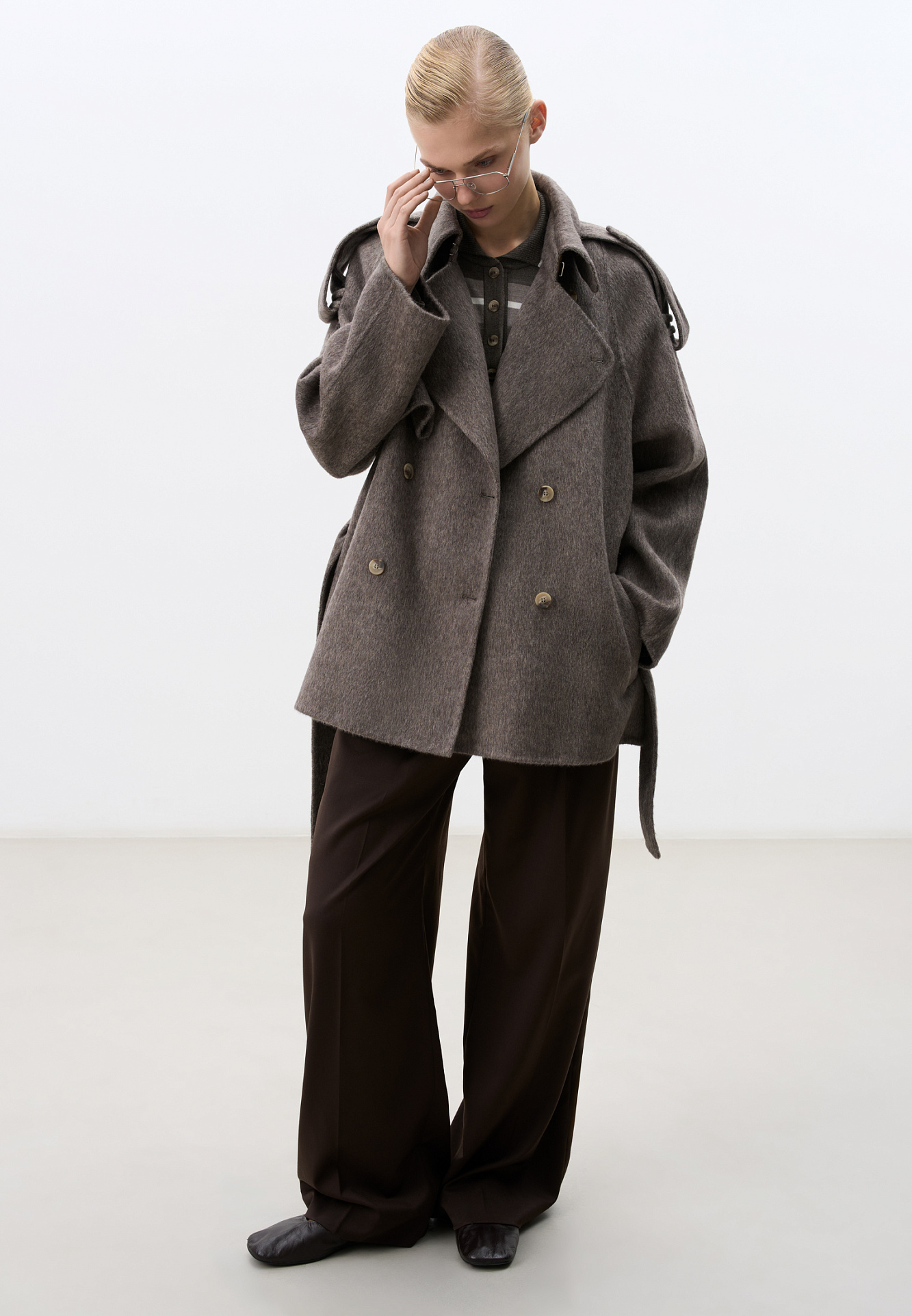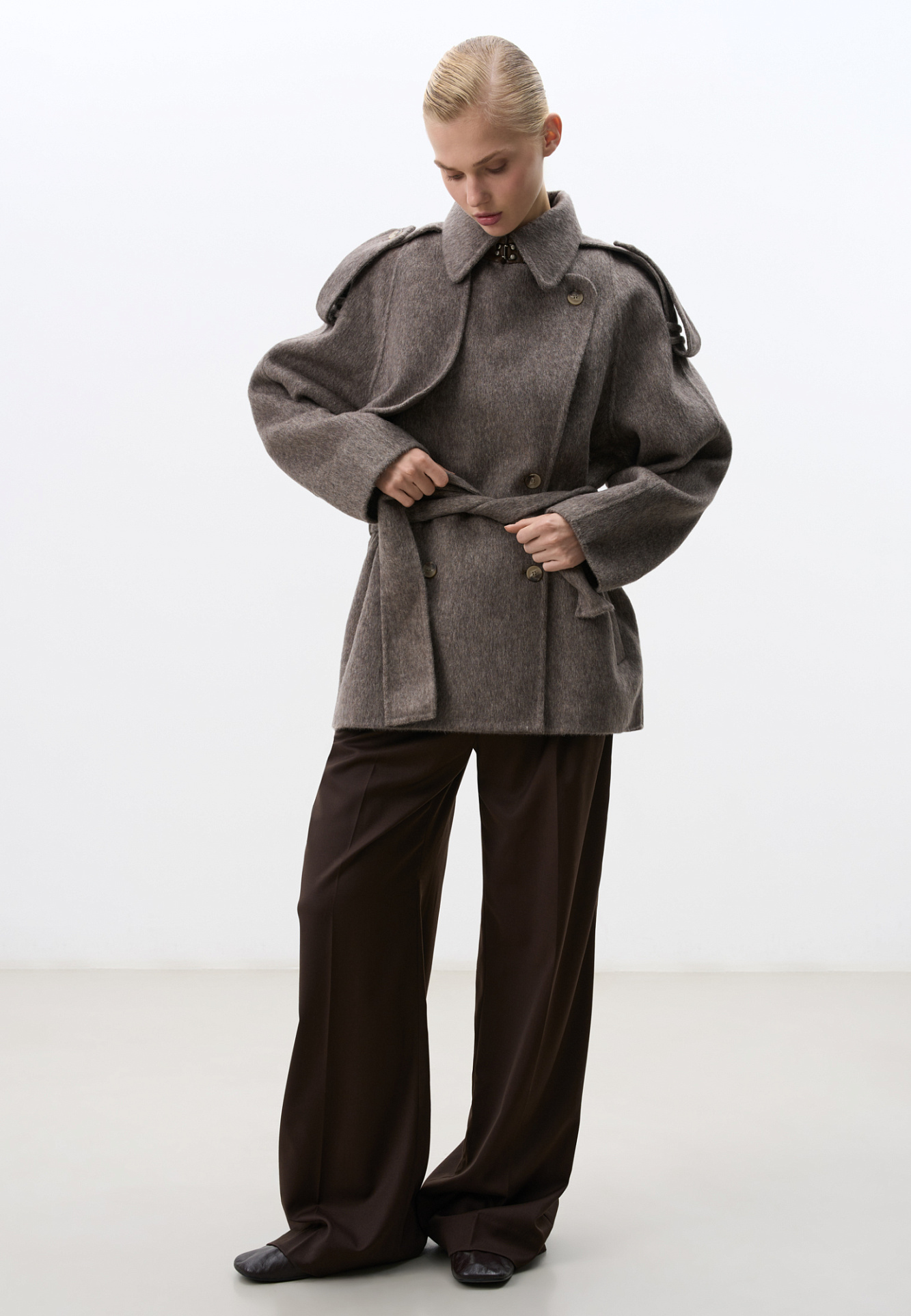 Двубортное пальто с добавлением верблюжьей шерсти. Модель прямого свободного силуэта с отложным воротником и боковыми карманами. Изделие декорировано отлетной кокеткой и широкими лацканами на плечах. На талии расположены шлевки, через которые продевается пояс, выполненный из того же материала, что и пальто. Без подкладки.