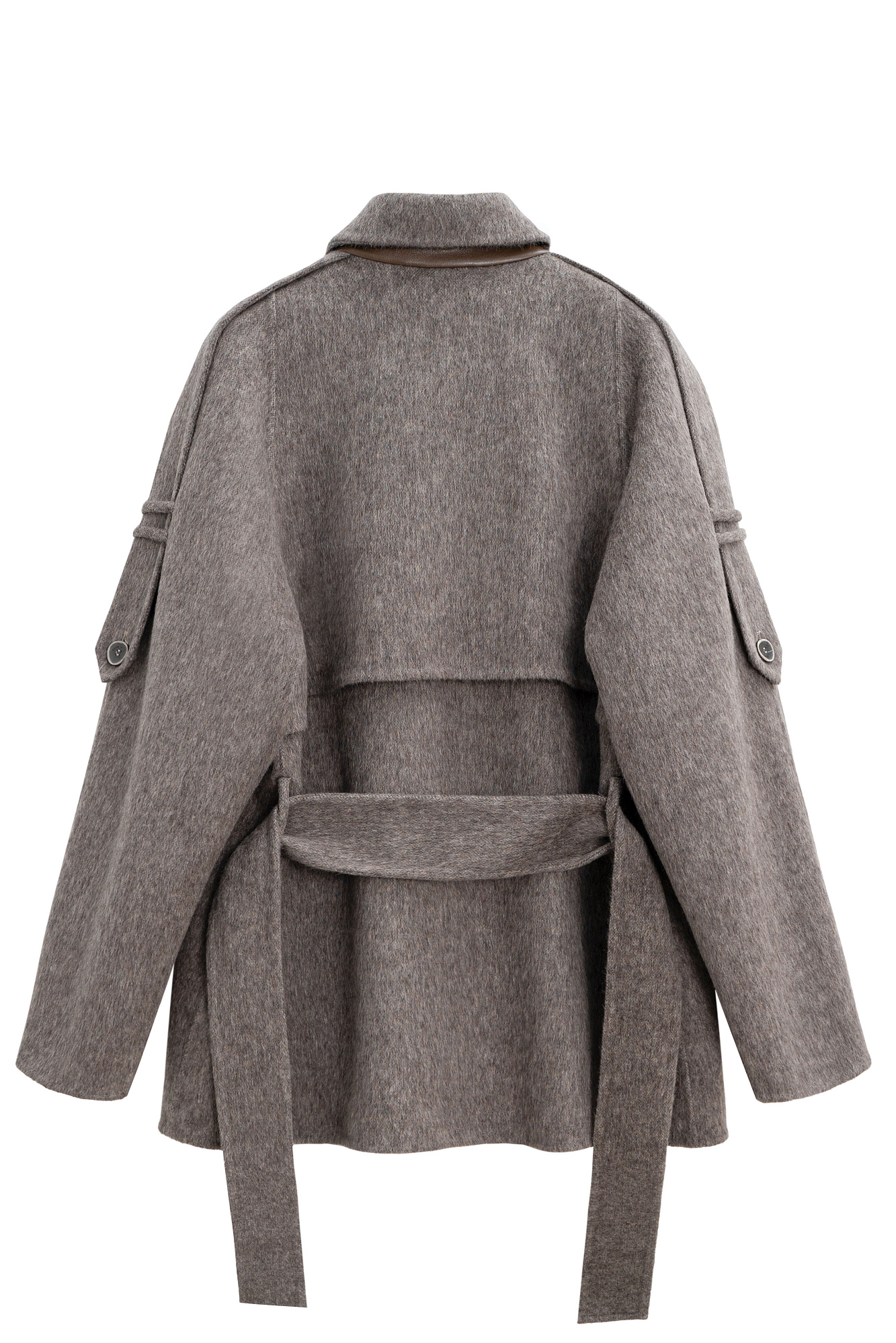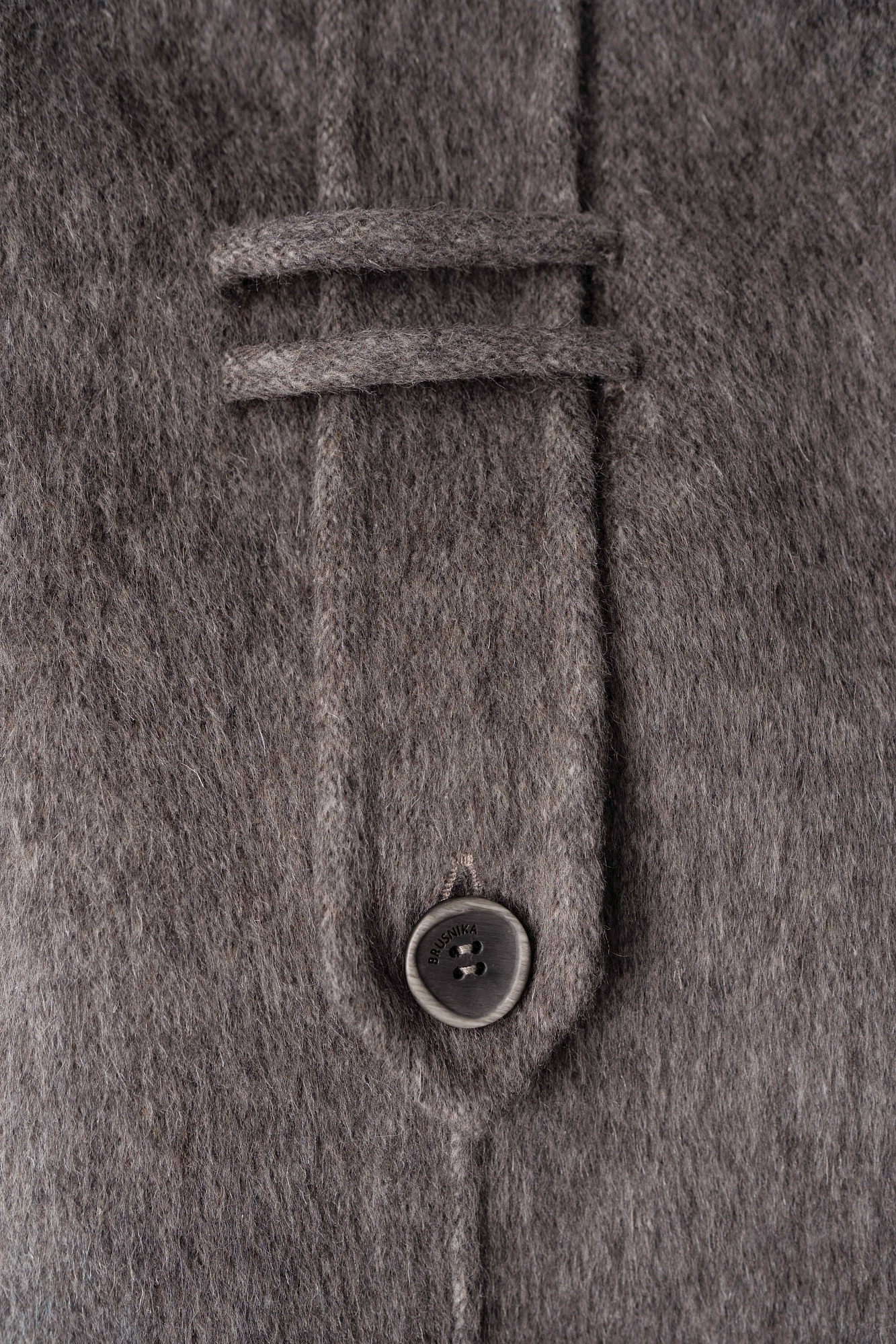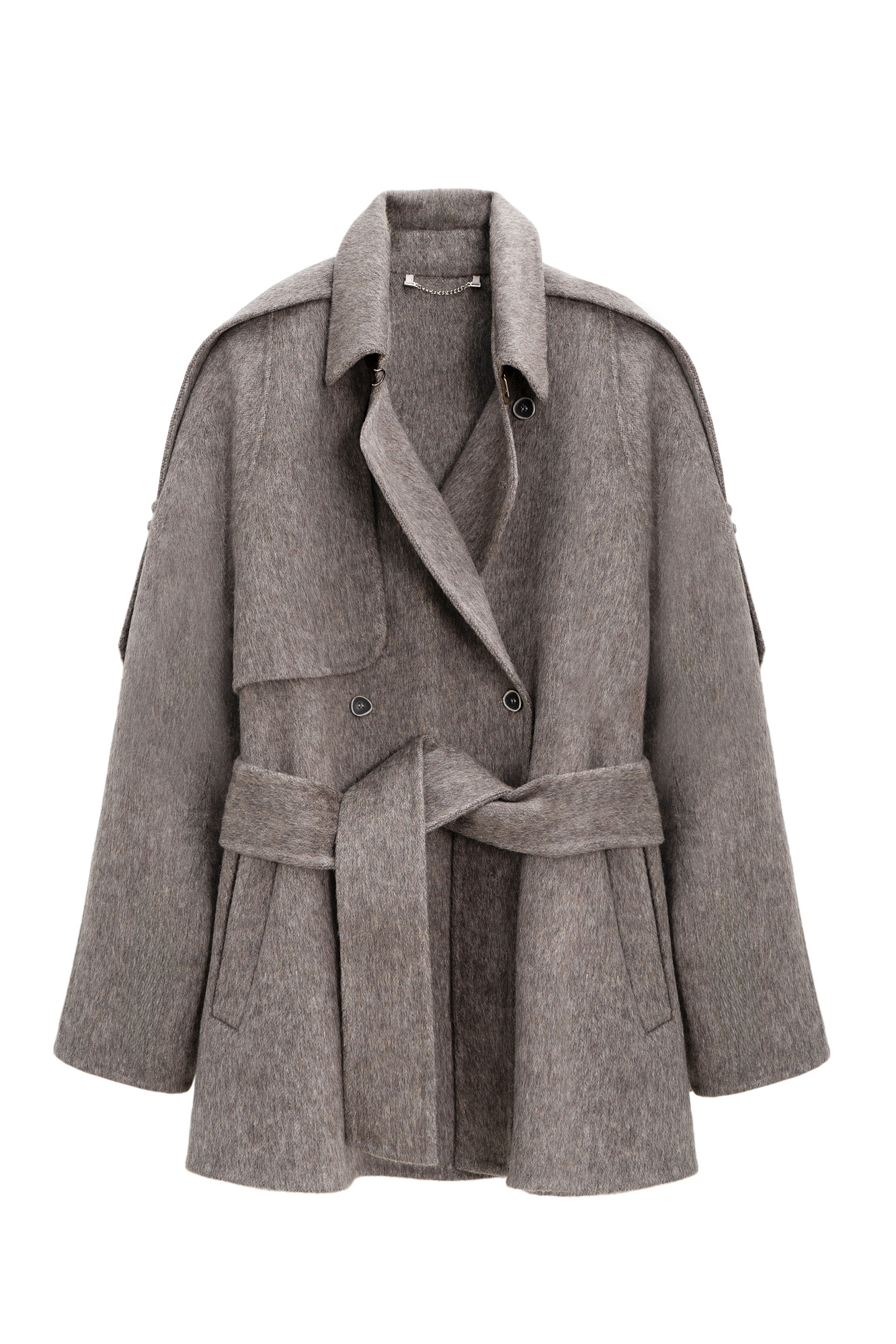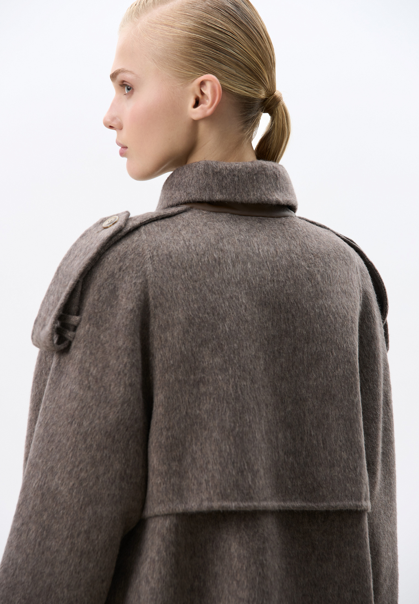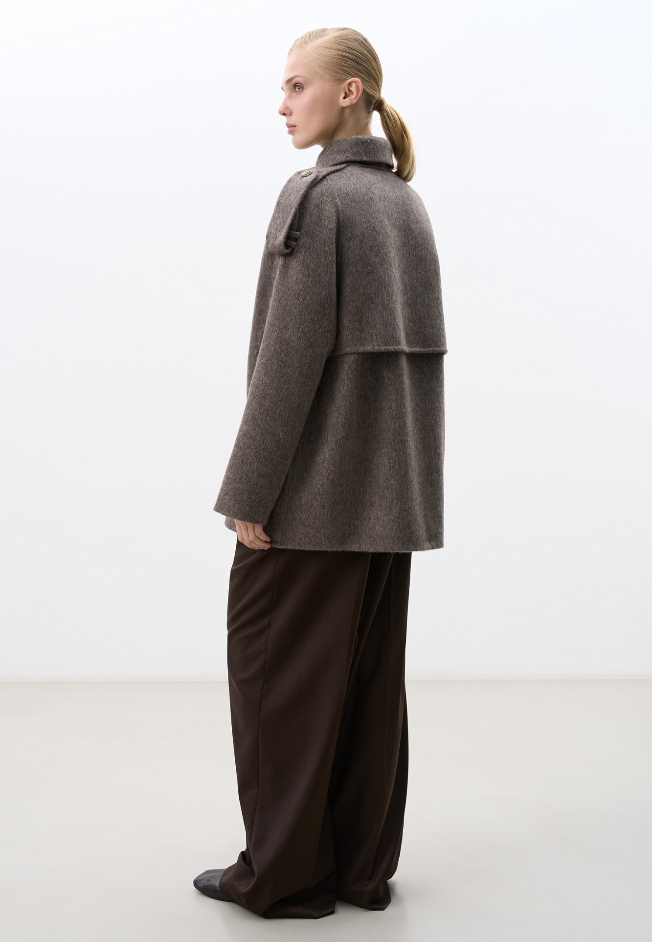 Двубортное пальто с добавлением верблюжьей шерсти. Модель прямого свободного силуэта с отложным воротником и боковыми карманами. Изделие декорировано отлетной кокеткой и широкими лацканами на плечах. На талии расположены шлевки, через которые продевается пояс, выполненный из того же материала, что и пальто. Без подкладки.