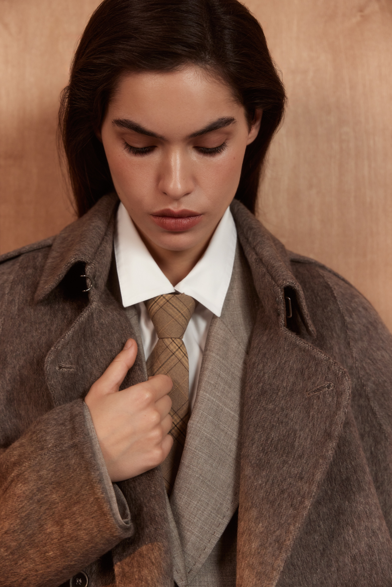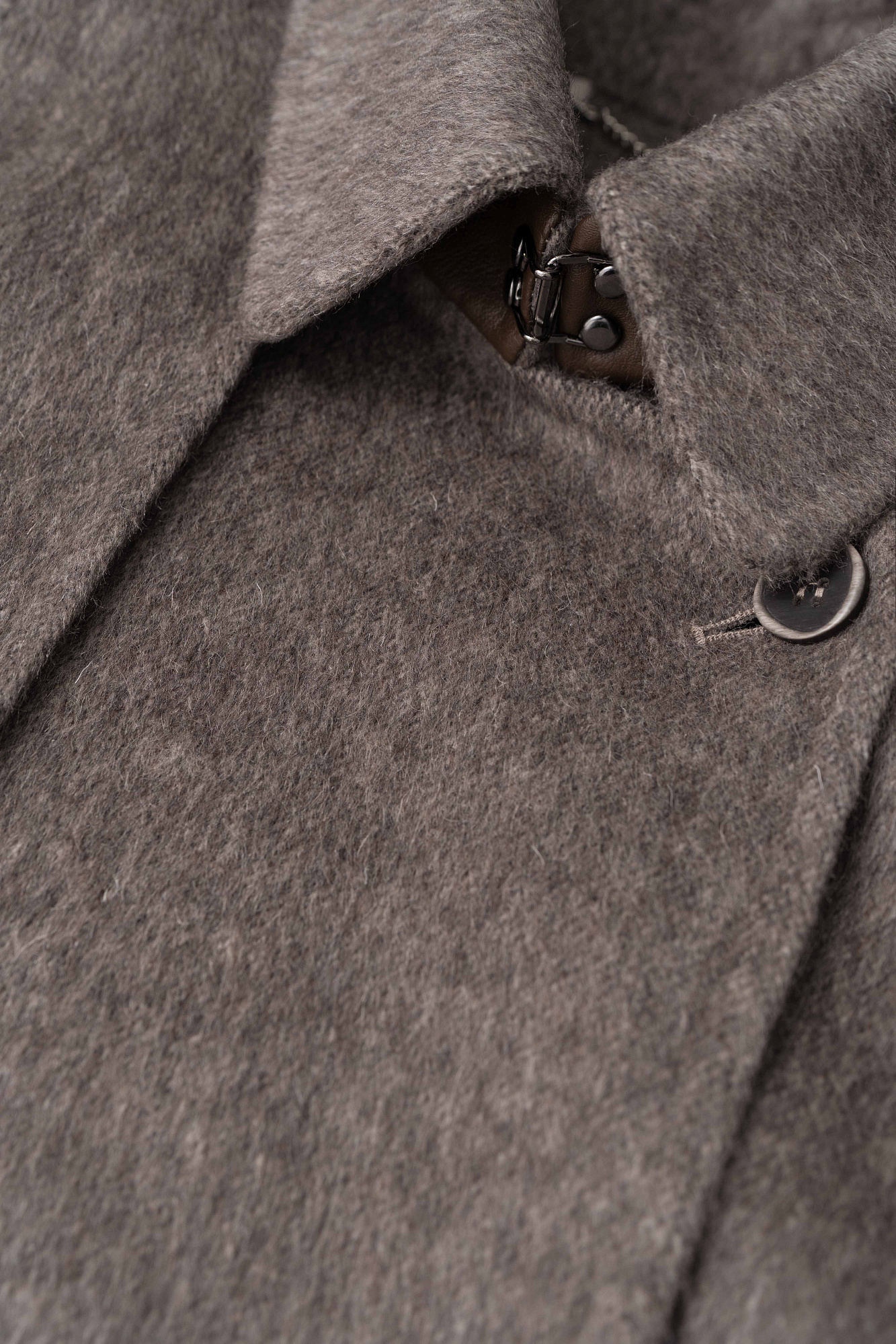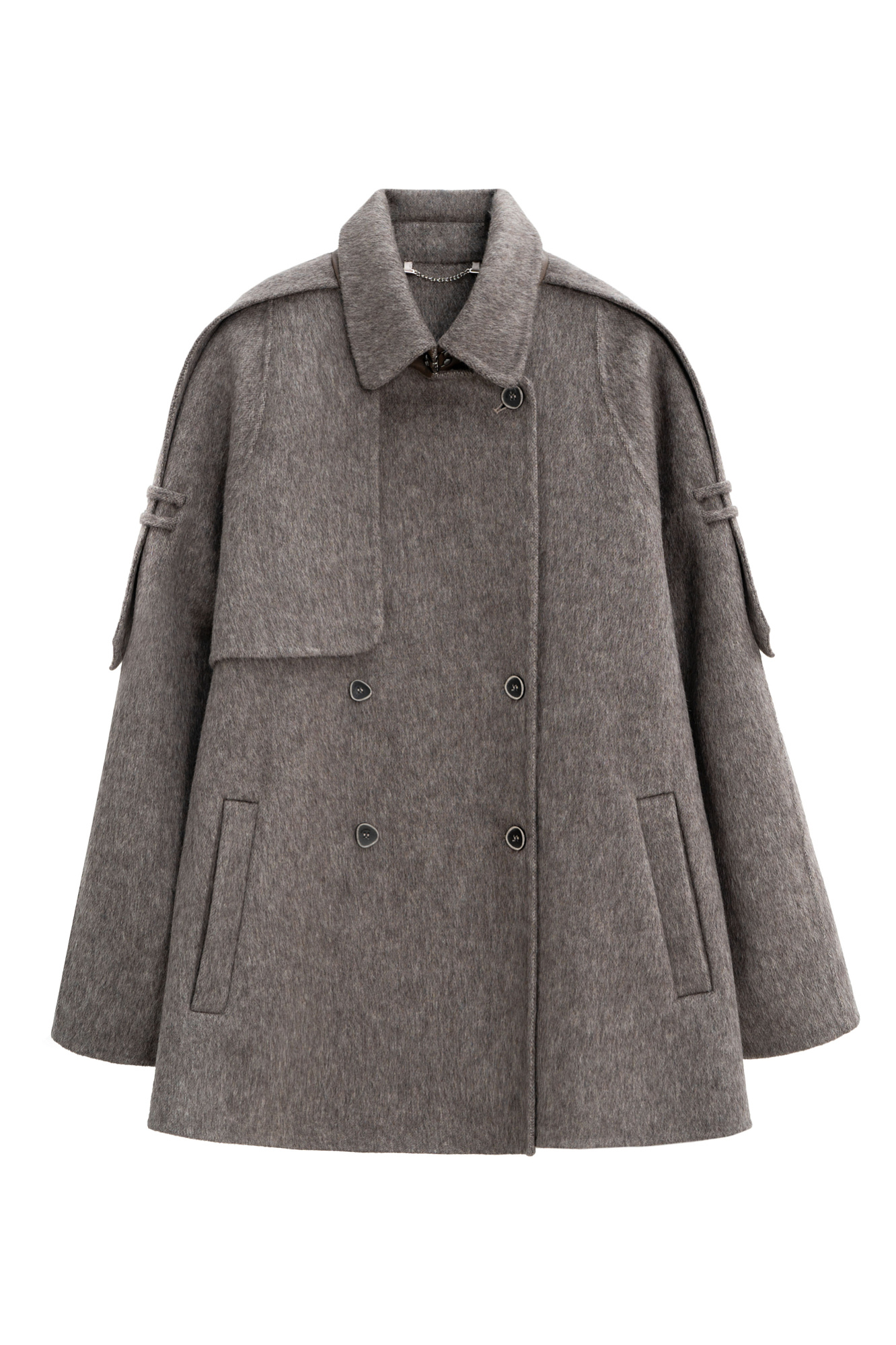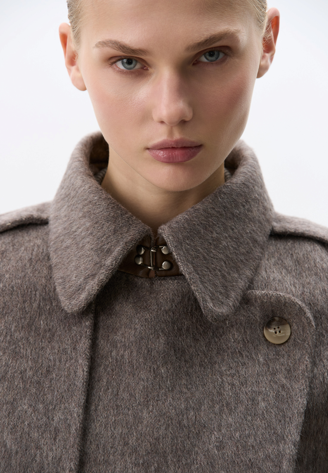 Двубортное пальто с добавлением верблюжьей шерсти. Модель прямого свободного силуэта с отложным воротником и боковыми карманами. Изделие декорировано отлетной кокеткой и широкими лацканами на плечах. На талии расположены шлевки, через которые продевается пояс, выполненный из того же материала, что и пальто. Без подкладки.