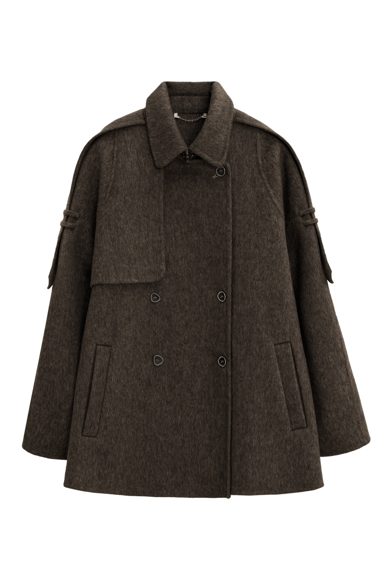 Двубортное пальто с добавлением верблюжьей шерсти. Модель прямого свободного силуэта с отложным воротником и боковыми карманами. Изделие декорировано отлетной кокеткой и широкими лацканами на плечах. На талии расположены шлевки, через которые продевается пояс, выполненный из того же материала, что и пальто. Без подкладки.