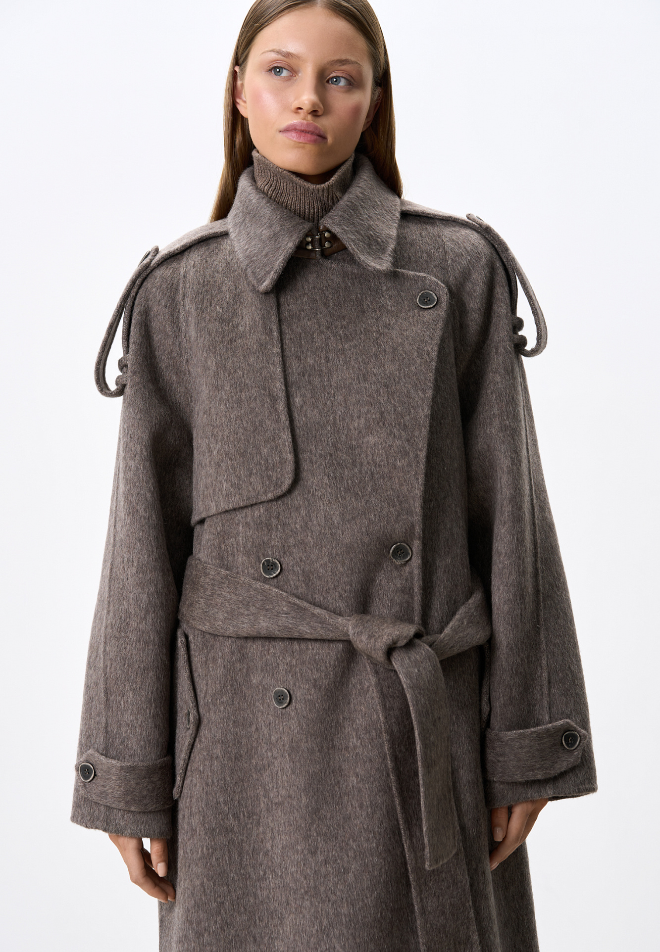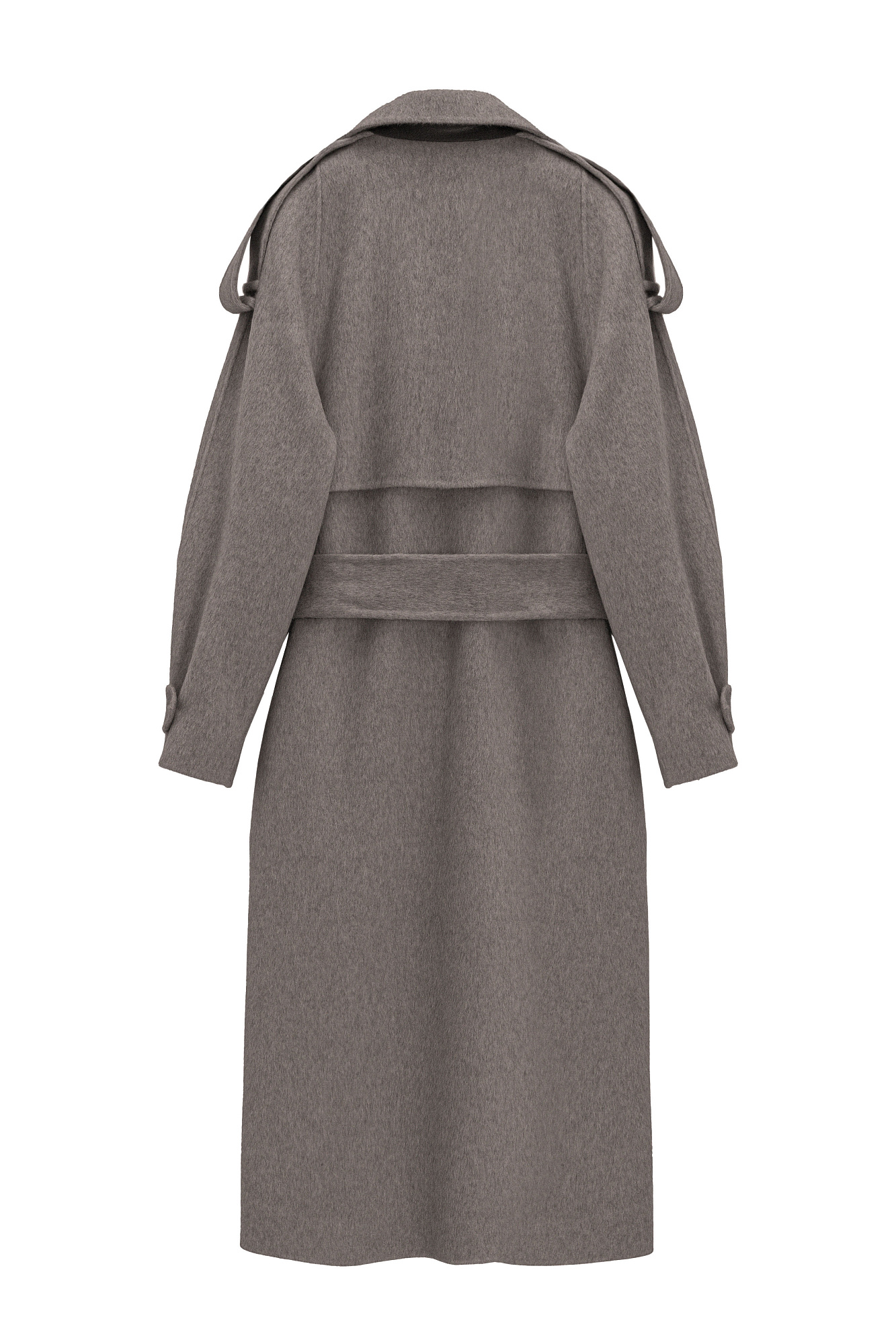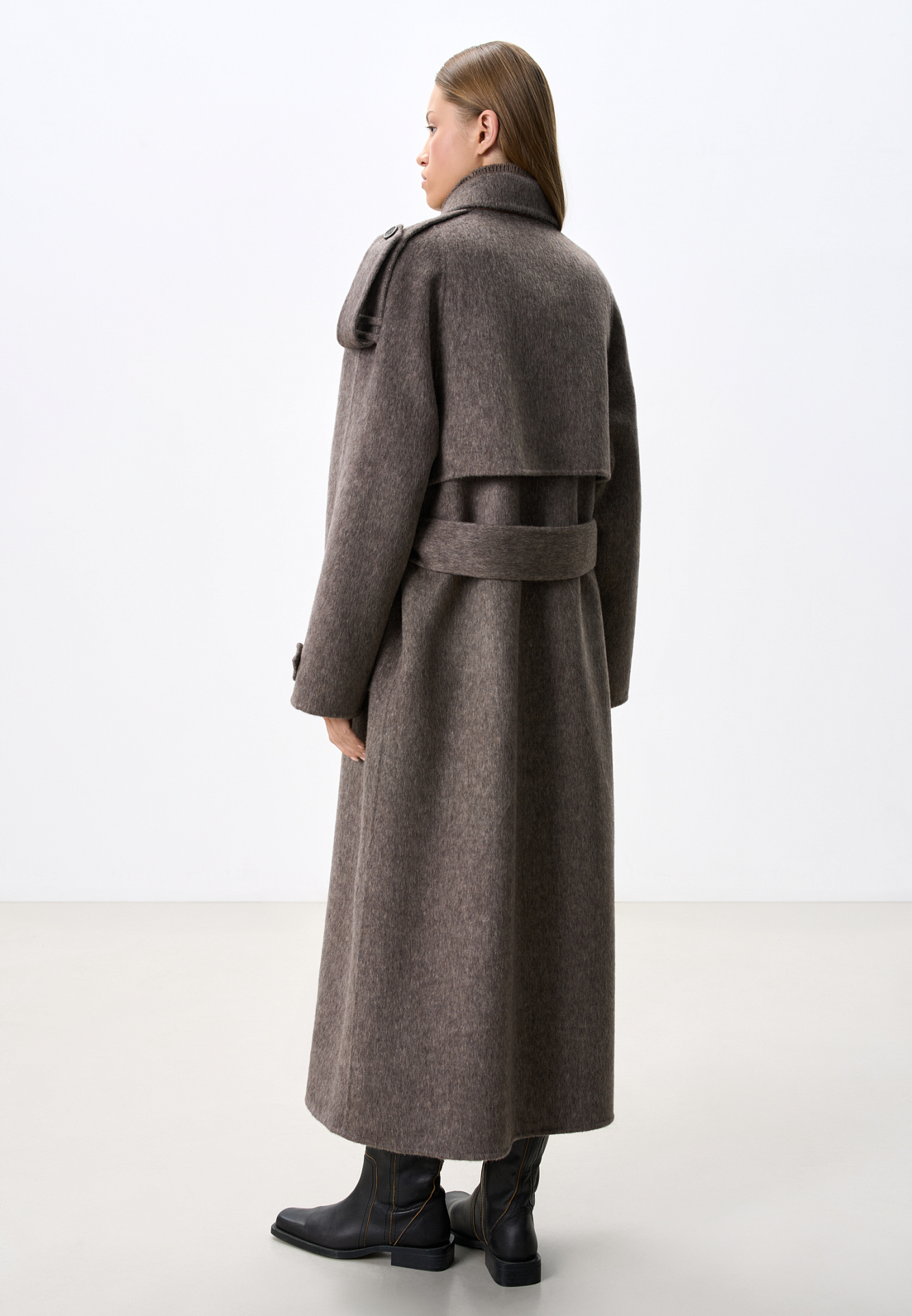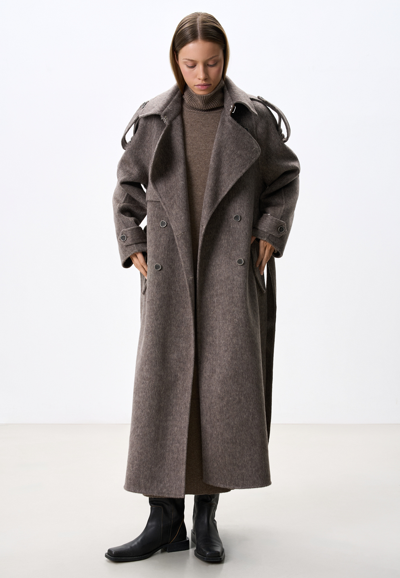 Длинное двубортное шерстяное пальто с добавлением верблюжьей шерсти. Модель прямого свободного силуэта с отложным воротником и боковыми карманами. Изделие декорировано отлетной кокеткой и широкими лацканами на плечах. На талии расположены шлевки, через которые продевается пояс, выполненный из того же материала, что и пальто. Без подкладки.
