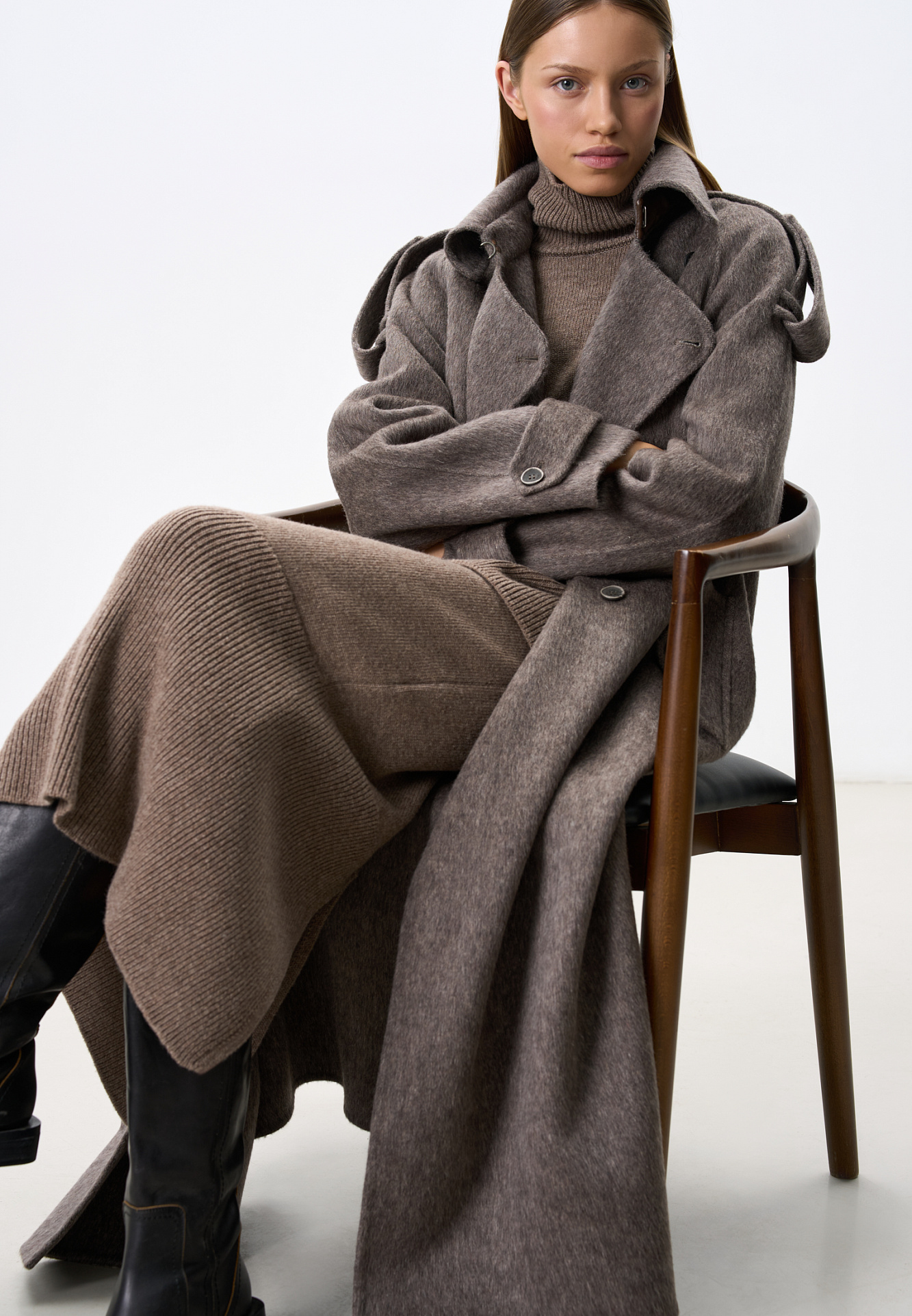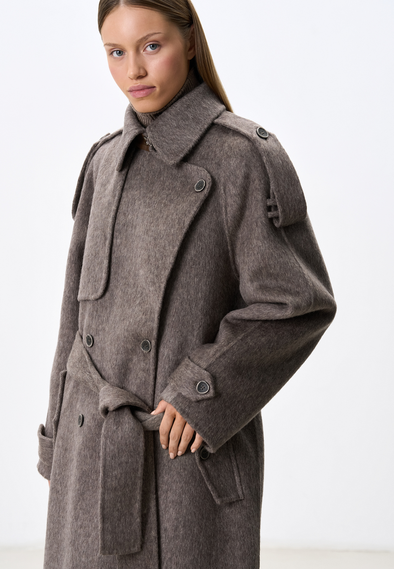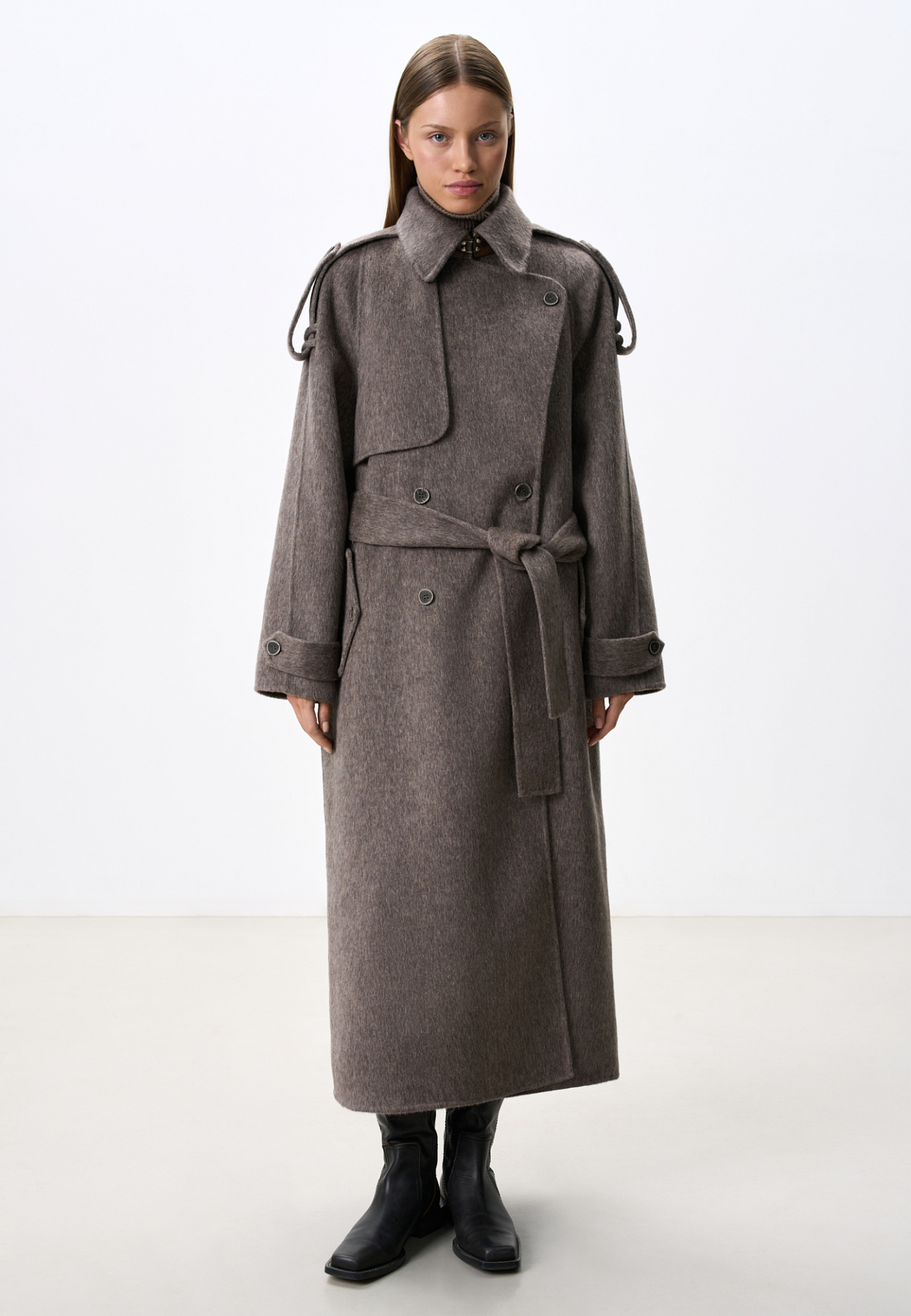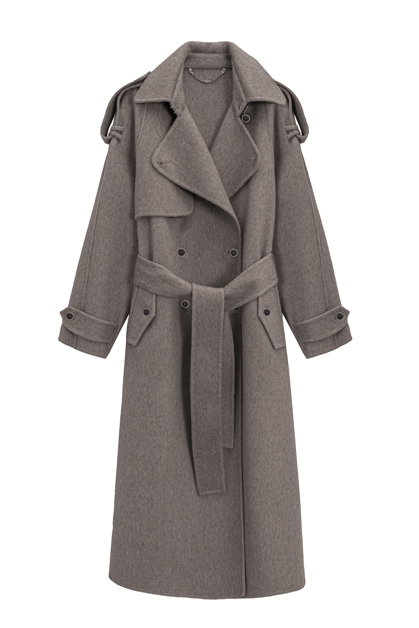 Длинное двубортное шерстяное пальто с добавлением верблюжьей шерсти. Модель прямого свободного силуэта с отложным воротником и боковыми карманами. Изделие декорировано отлетной кокеткой и широкими лацканами на плечах. На талии расположены шлевки, через которые продевается пояс, выполненный из того же материала, что и пальто. Без подкладки.