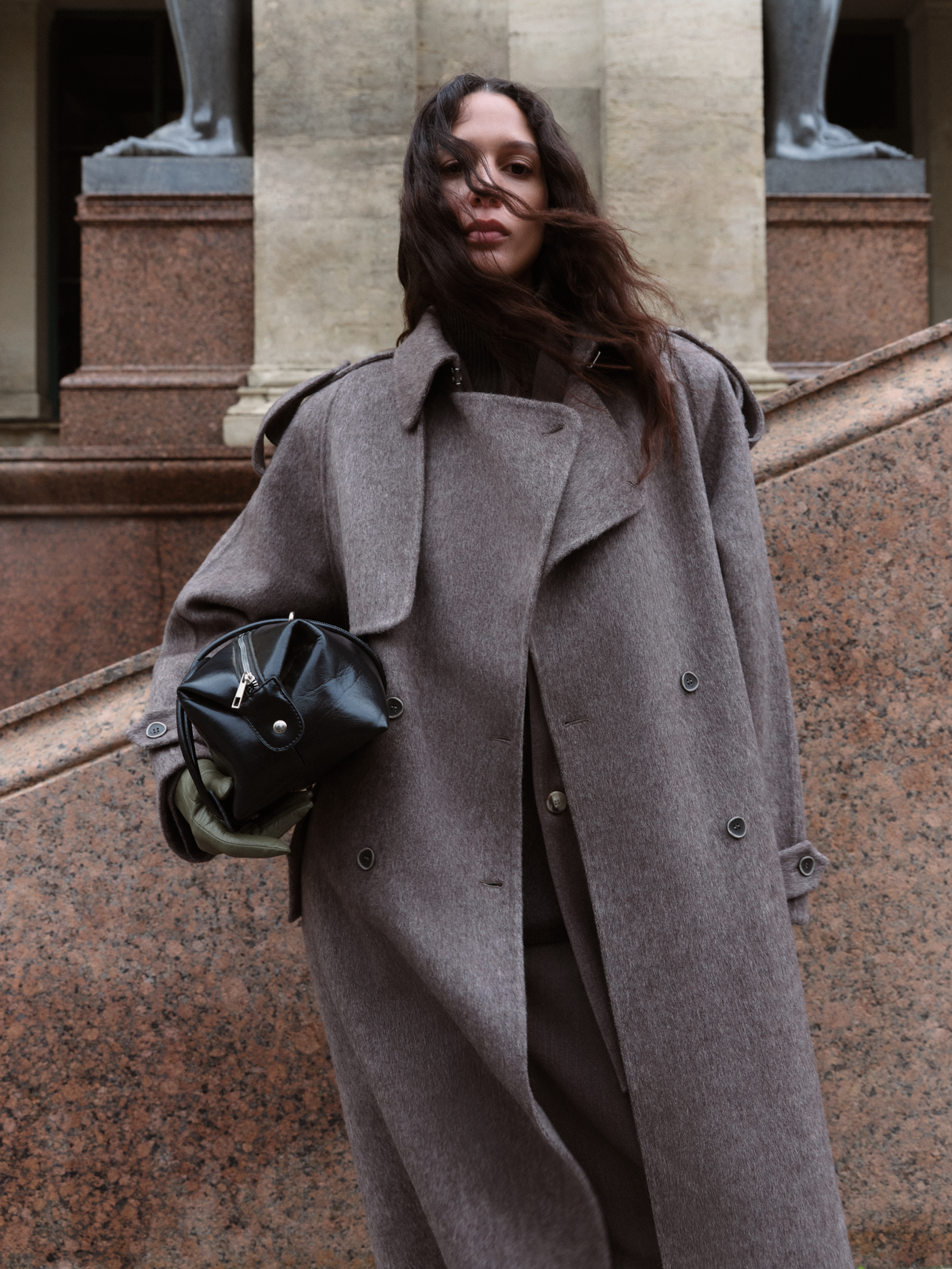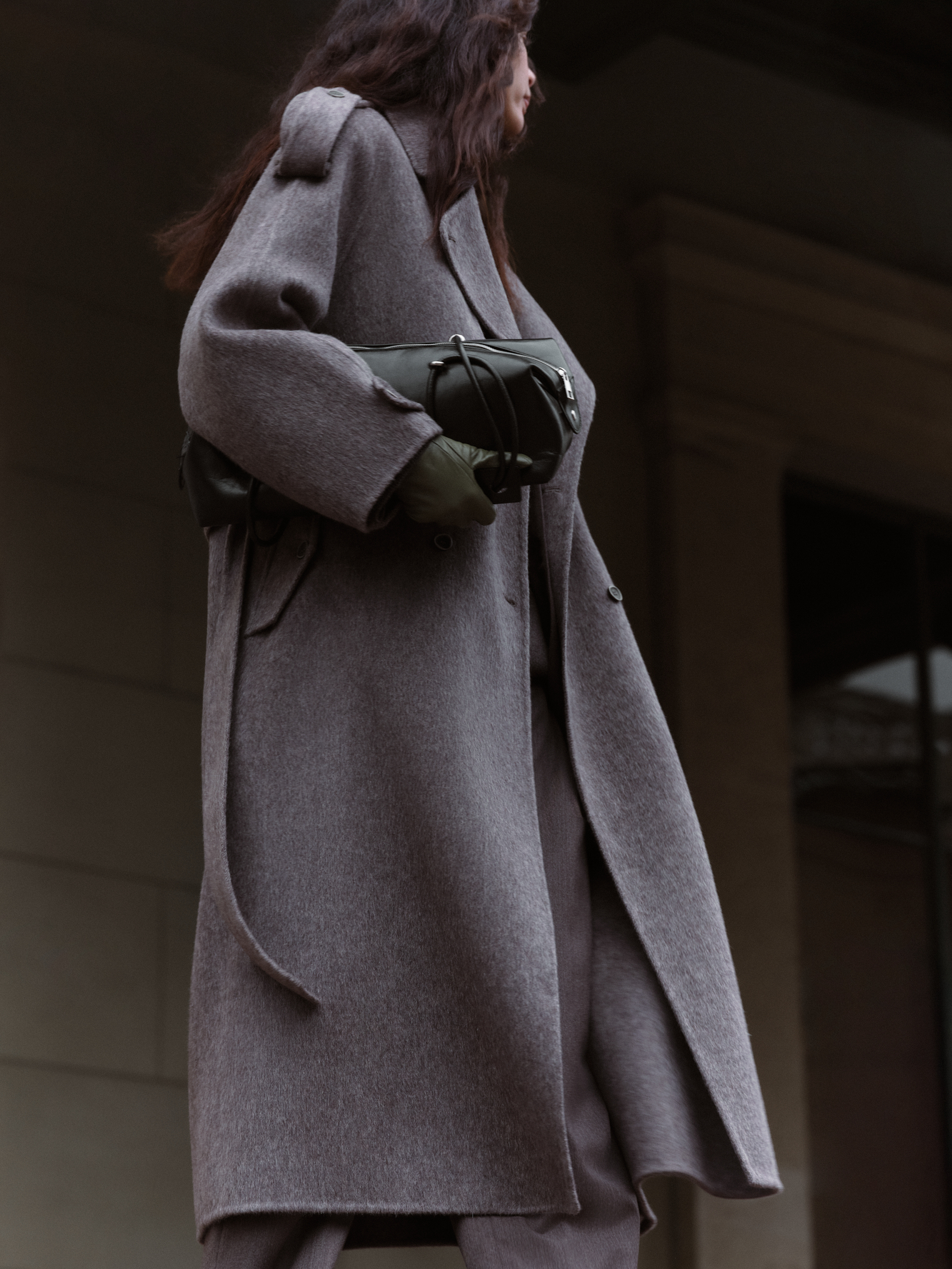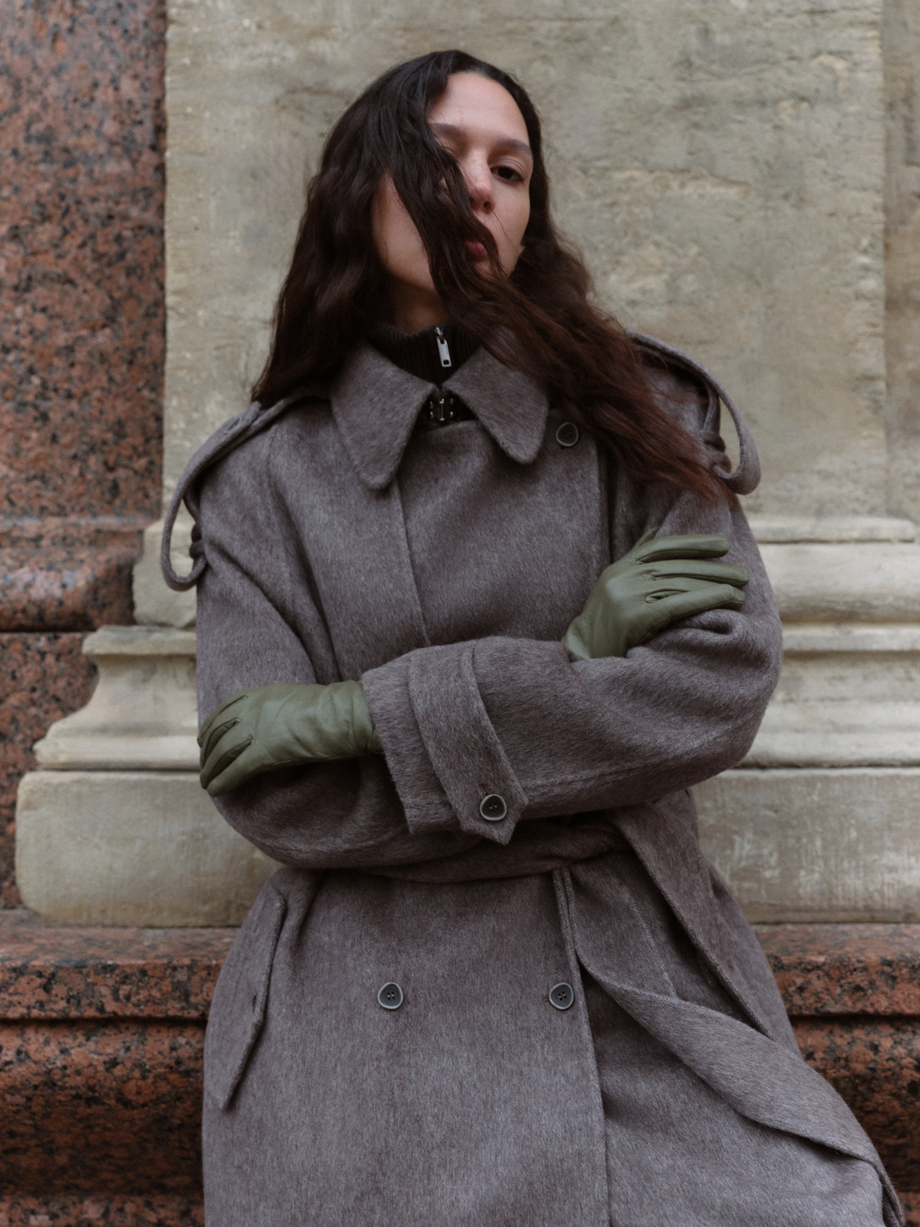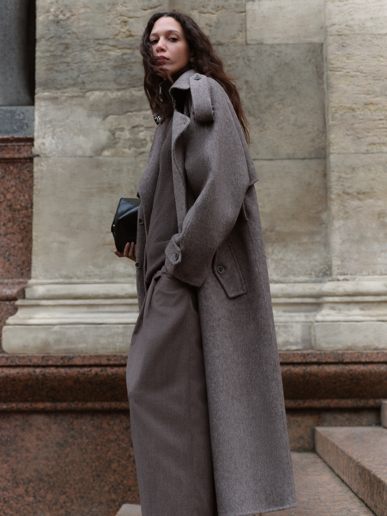 Длинное двубортное шерстяное пальто с добавлением верблюжьей шерсти. Модель прямого свободного силуэта с отложным воротником и боковыми карманами. Изделие декорировано отлетной кокеткой и широкими лацканами на плечах. На талии расположены шлевки, через которые продевается пояс, выполненный из того же материала, что и пальто. Без подкладки.