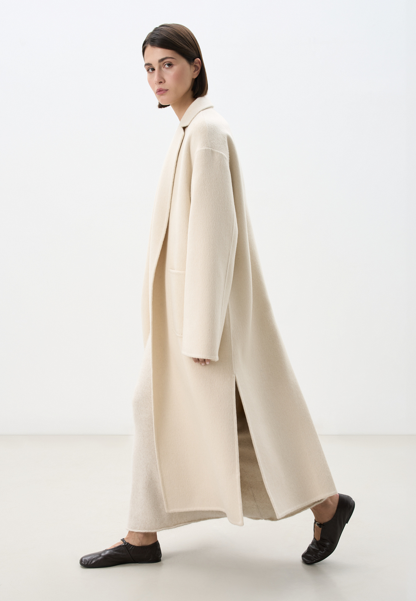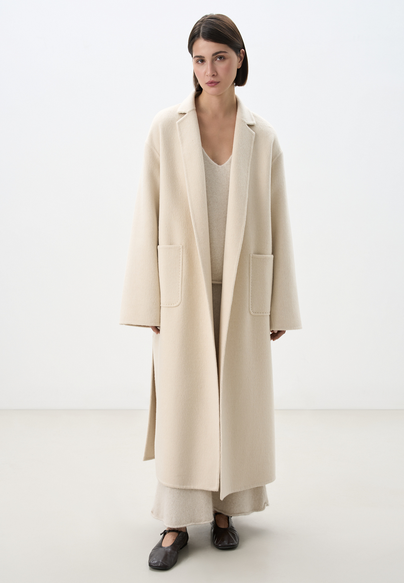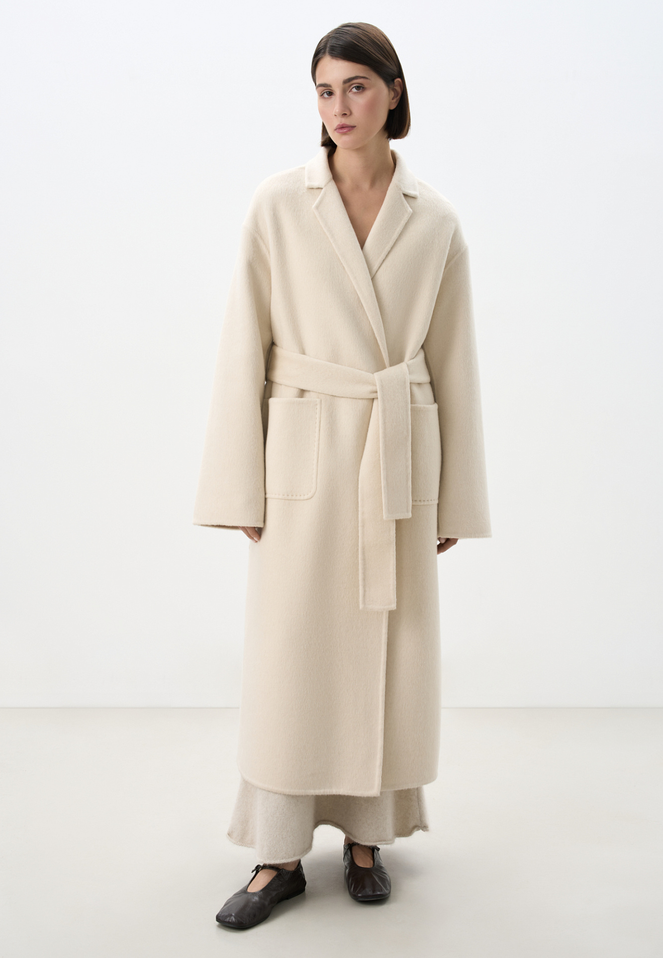 Классическое длинное пальто из шерсти и кашемира. Модель прямого кроя, с узкими лацканами, глубокими накладными карманами и высокими разрезами по бокам. Пояс в комплекте.