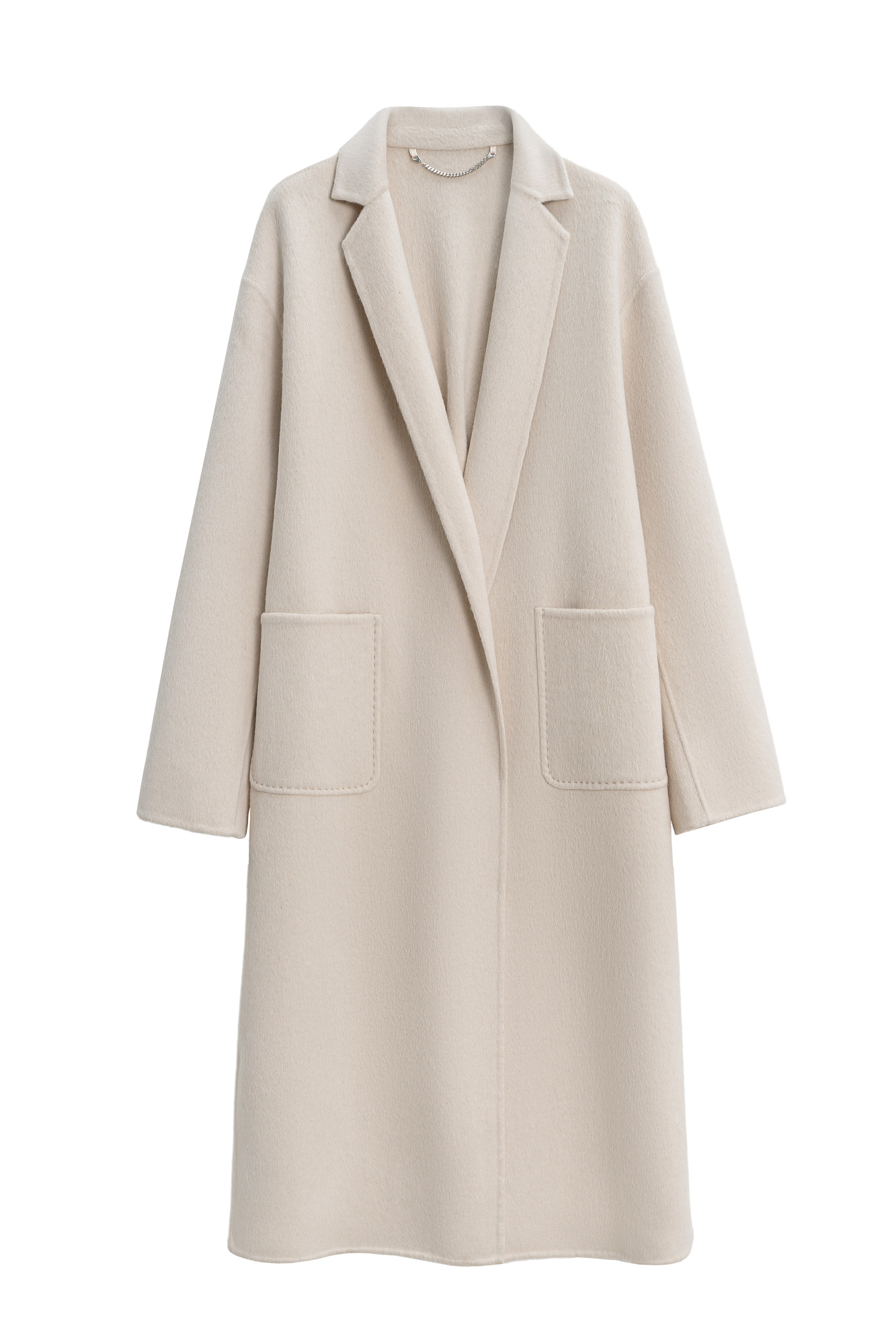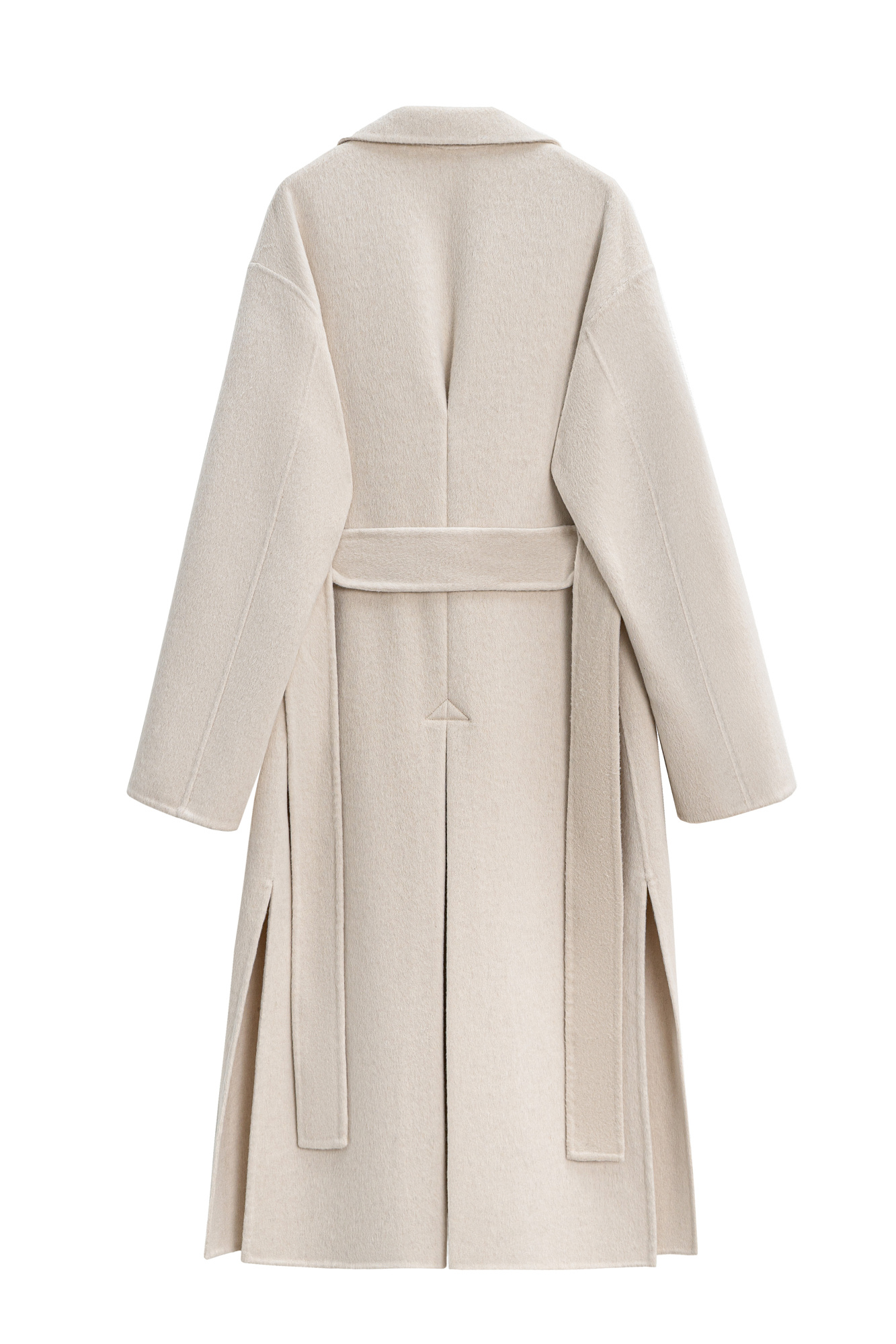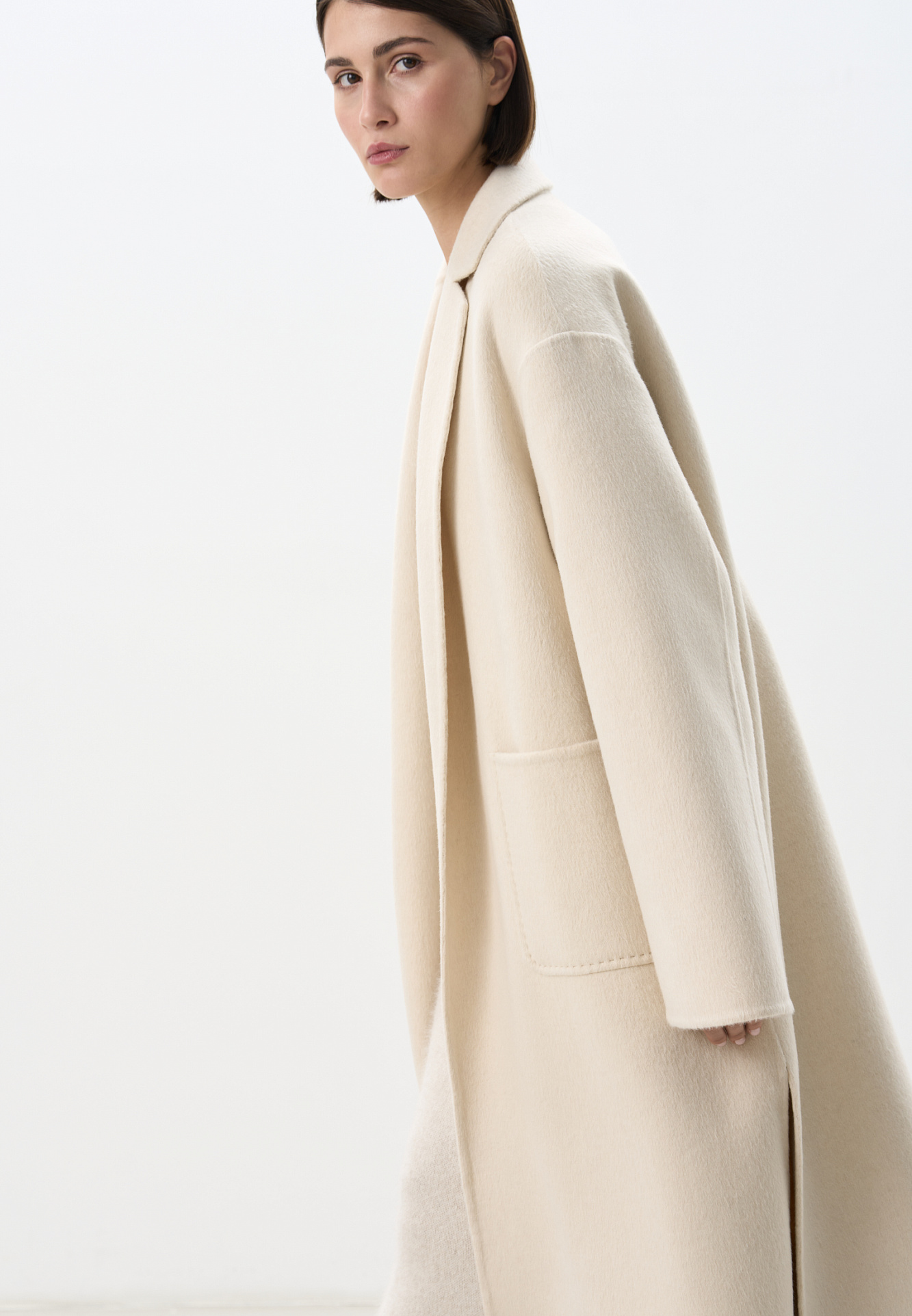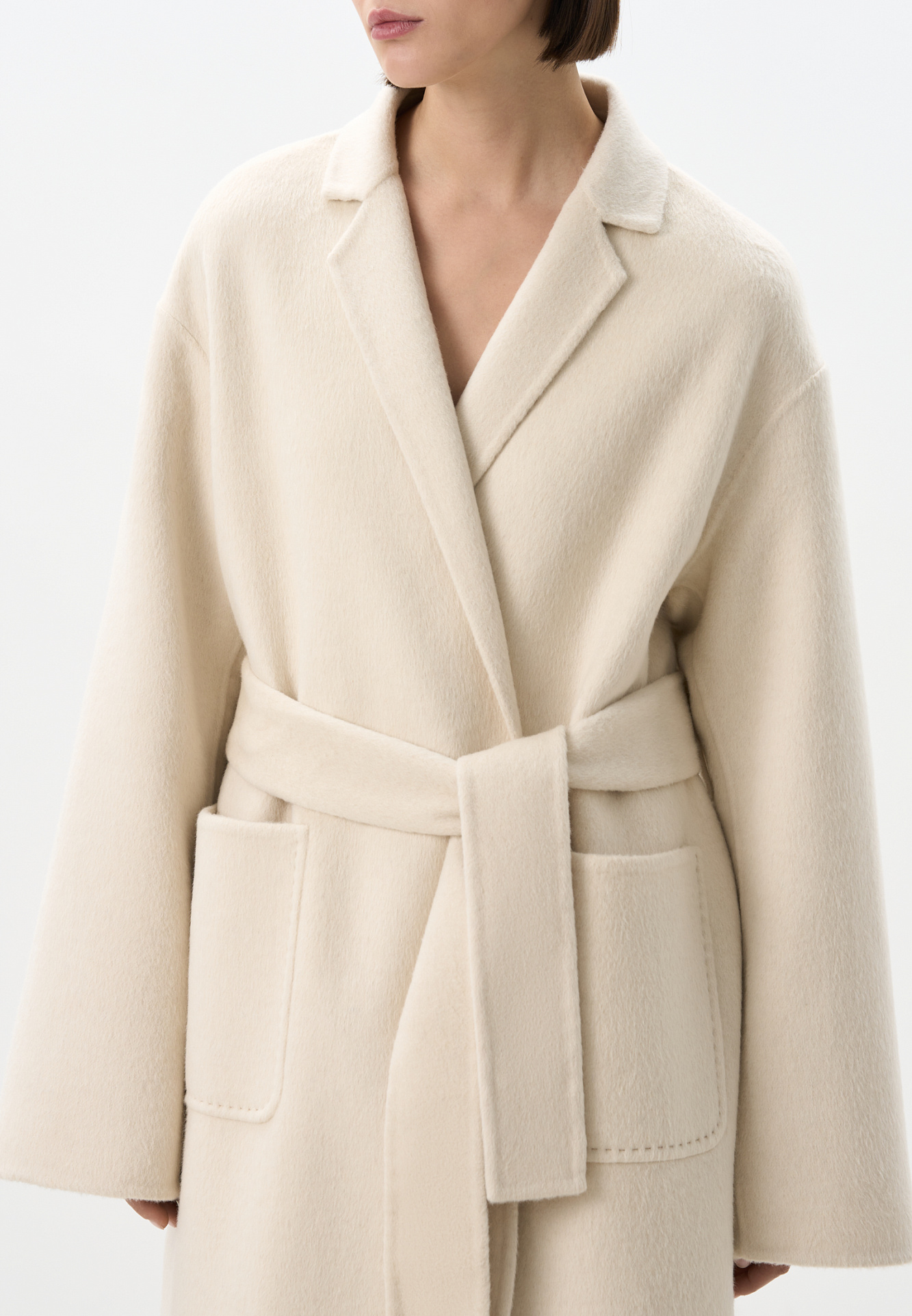 Классическое длинное пальто из шерсти и кашемира. Модель прямого кроя, с узкими лацканами, глубокими накладными карманами и высокими разрезами по бокам. Пояс в комплекте.
