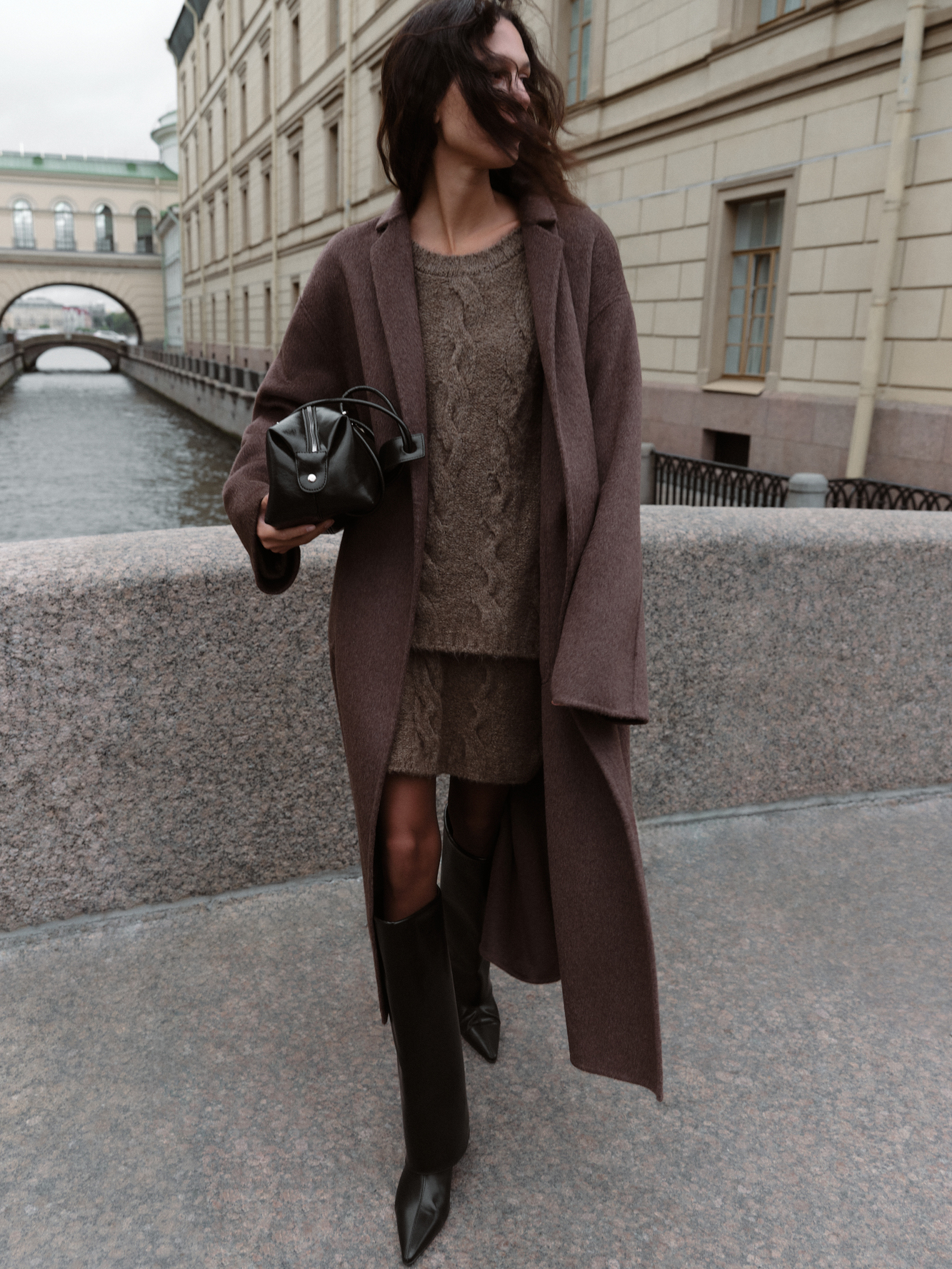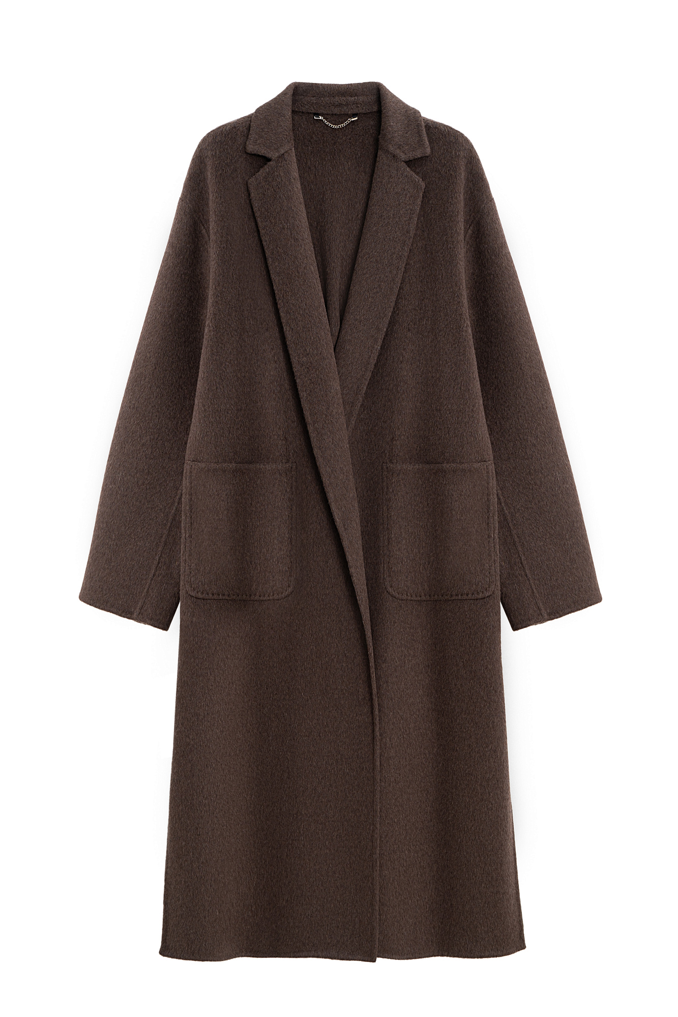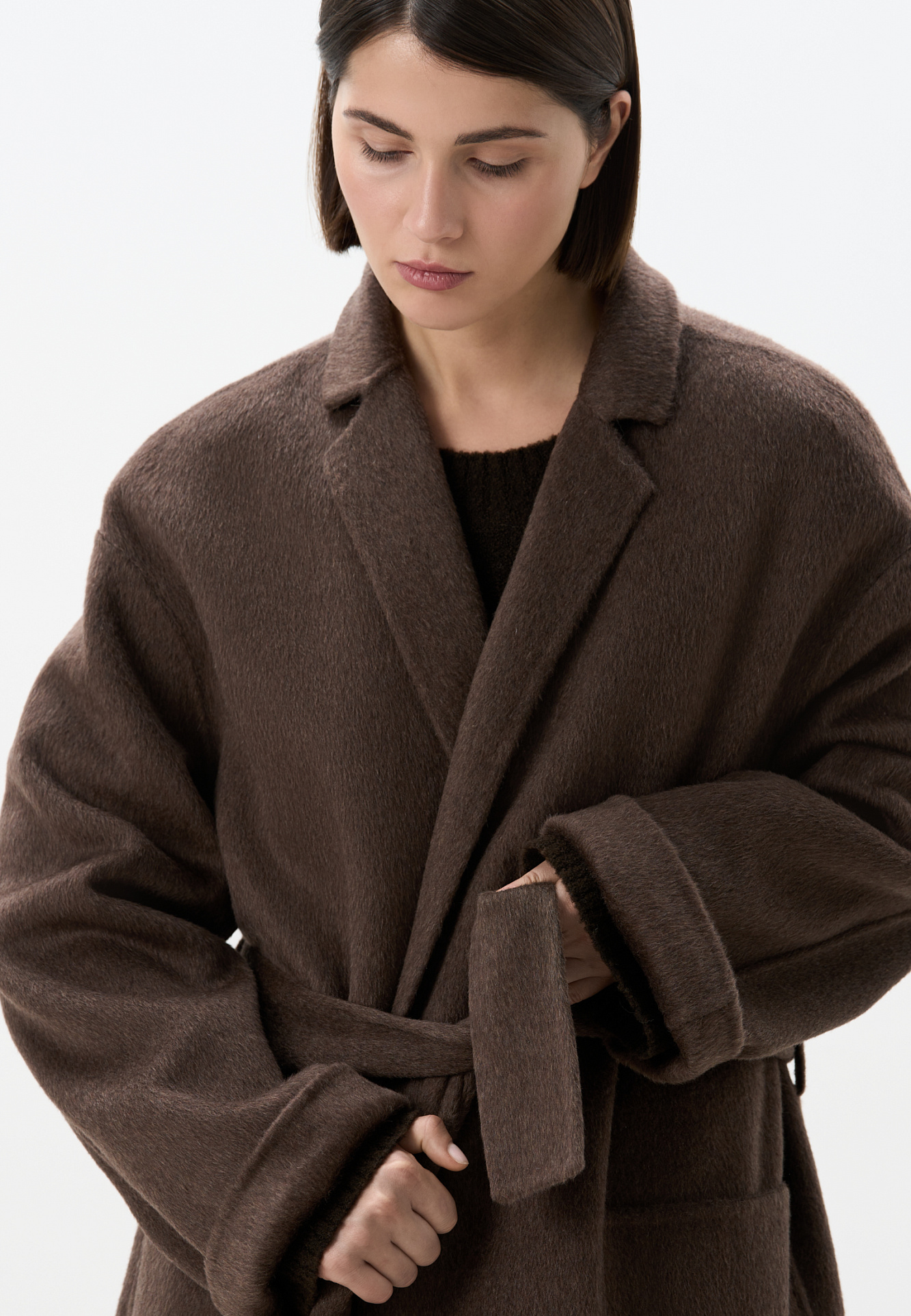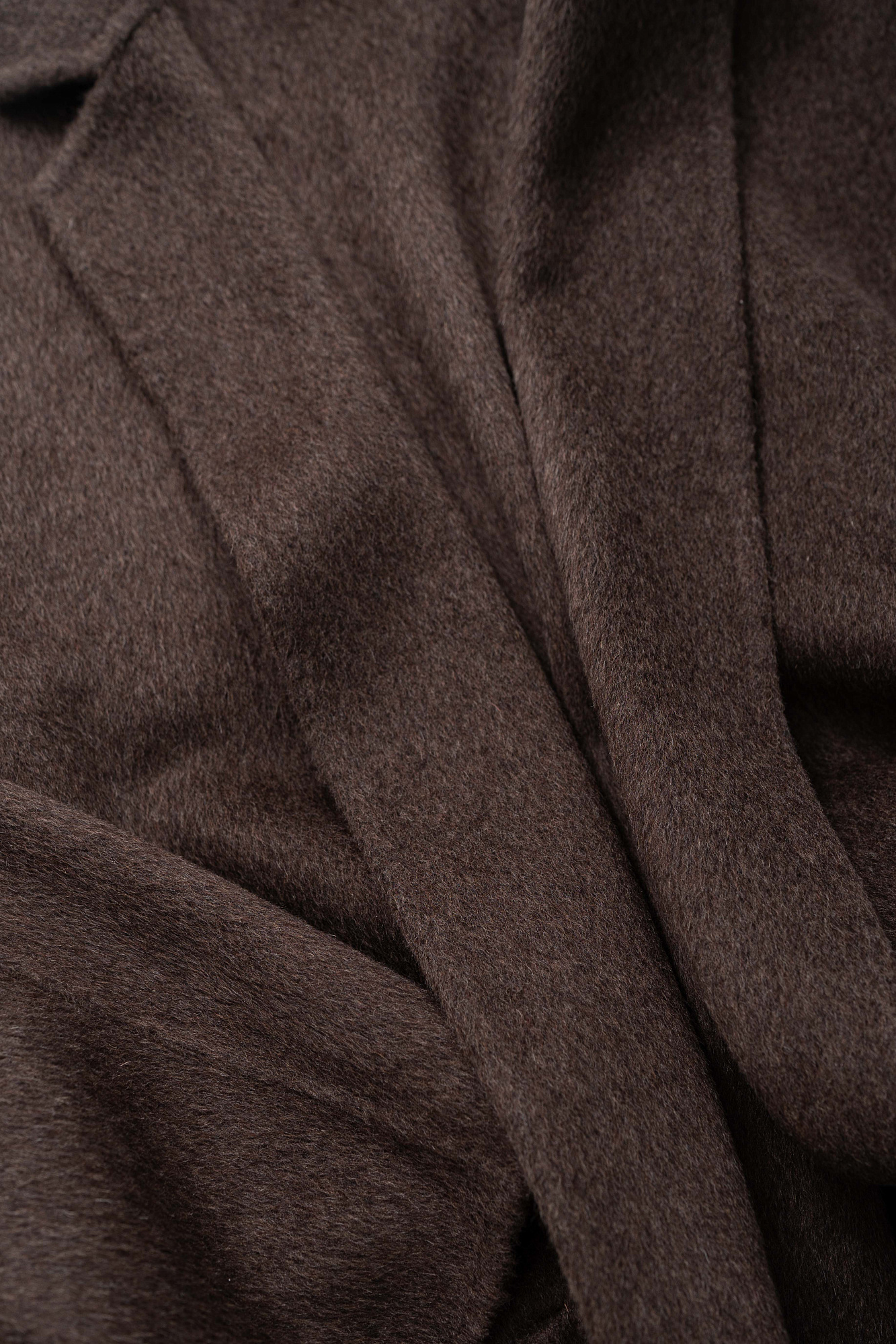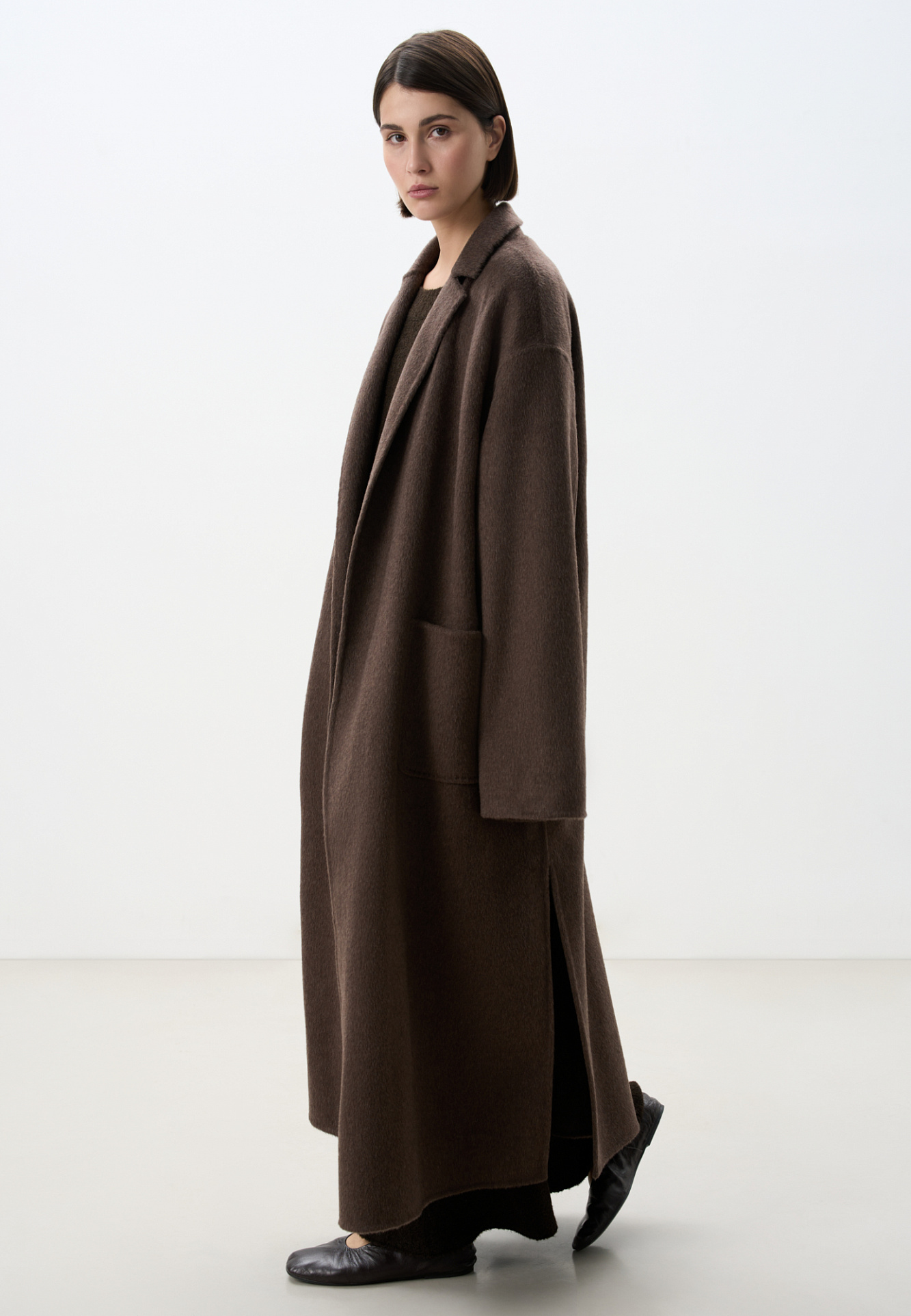 Классическое длинное пальто из шерсти и кашемира. Модель прямого кроя, с узкими лацканами, глубокими накладными карманами и высокими разрезами по бокам. Пояс в комплекте.
