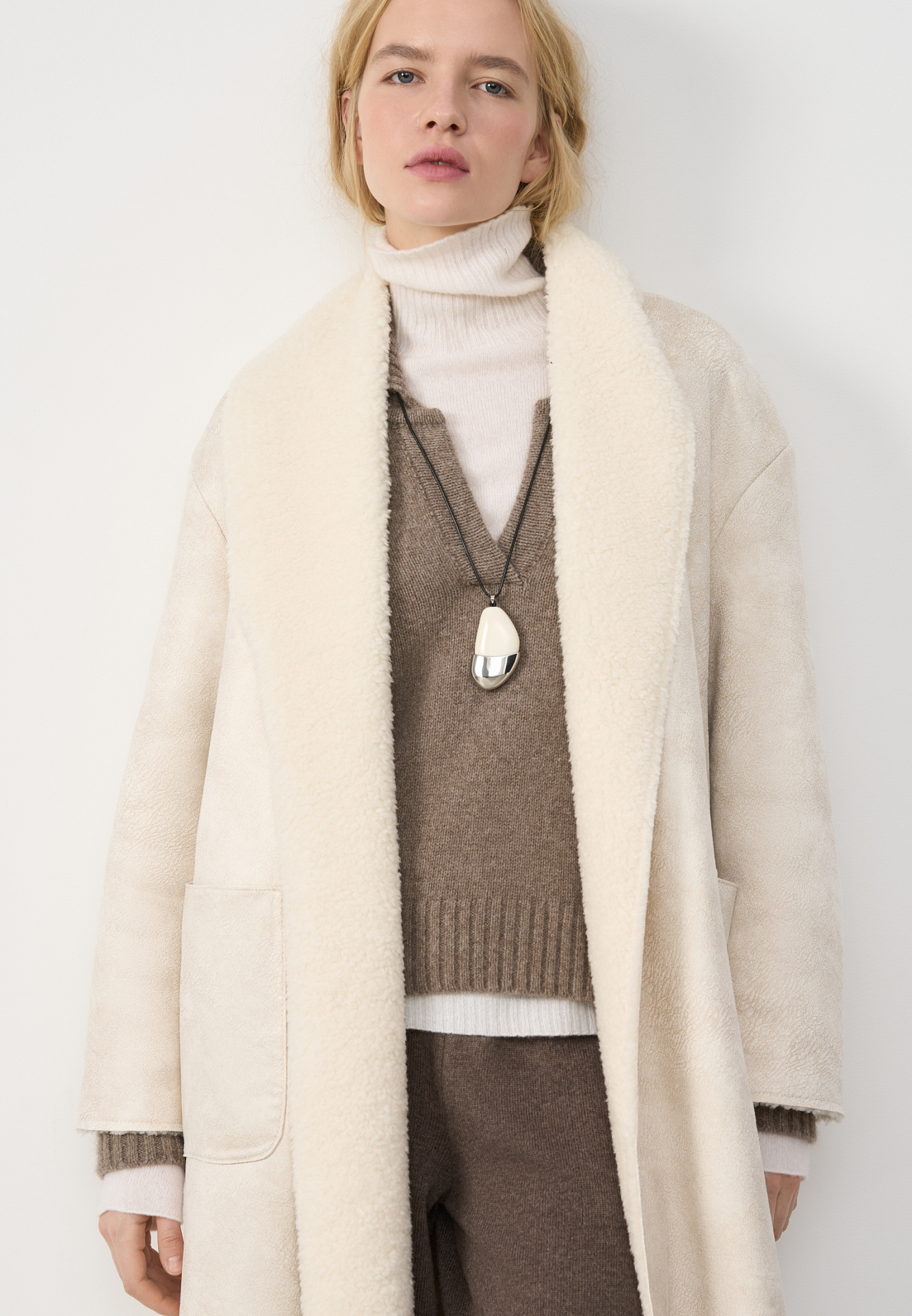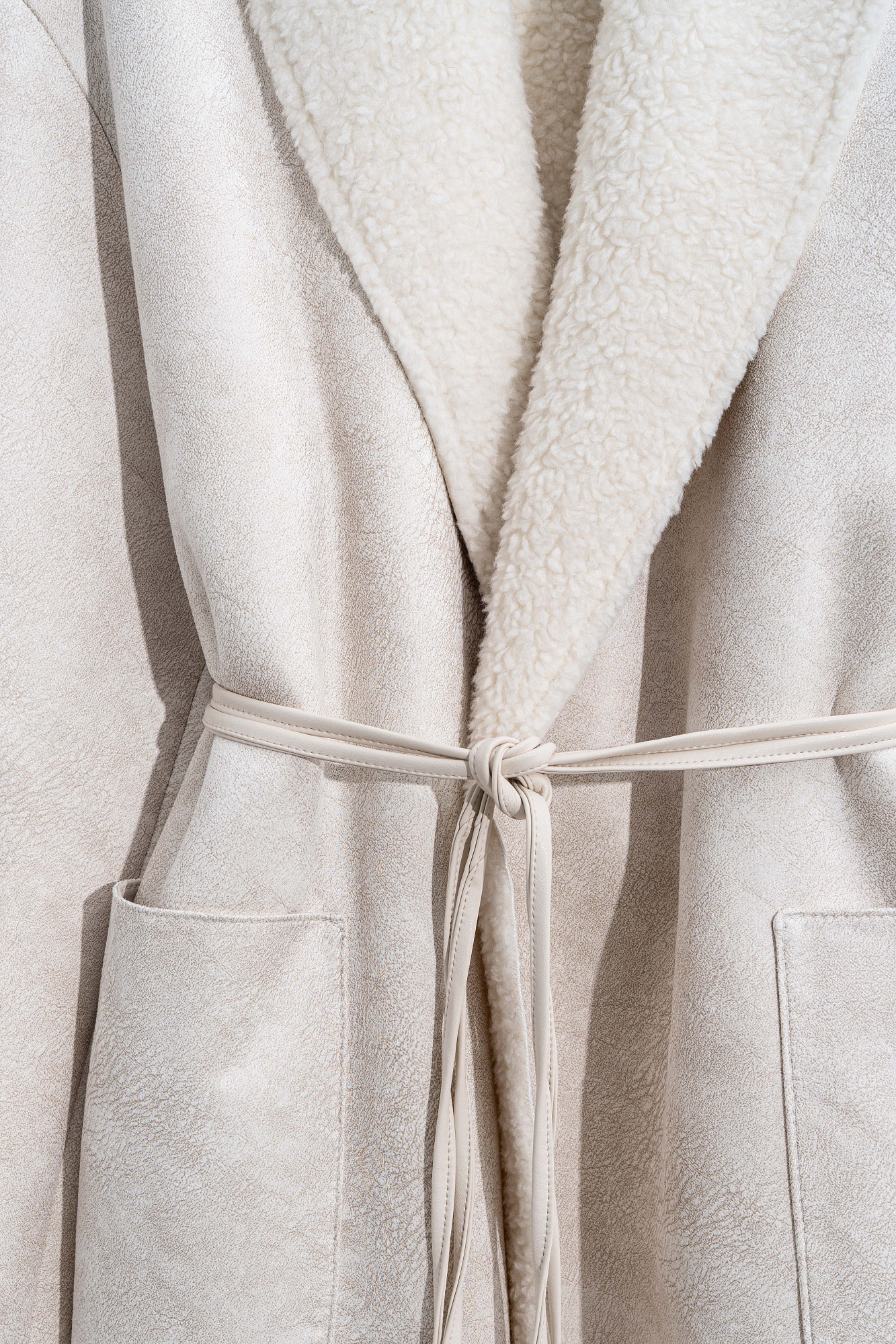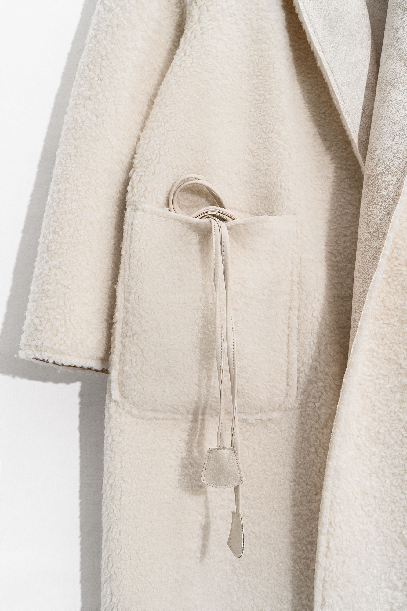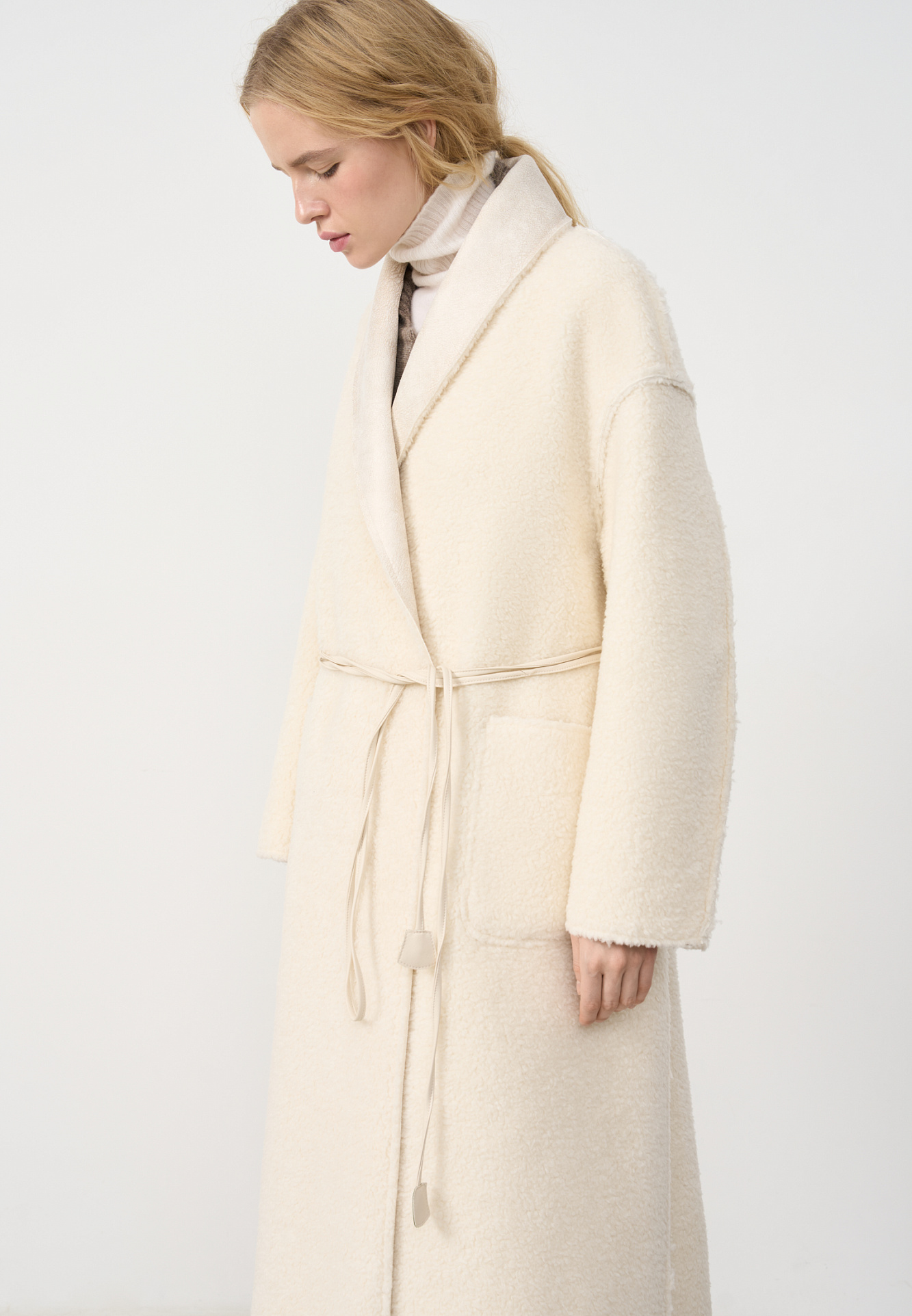 Двустороннее пальто-дубленка из шерсти. Модель прямого кроя на запах с узкими лацканами, большими накладными карманами и тонким поясом из экокожи.