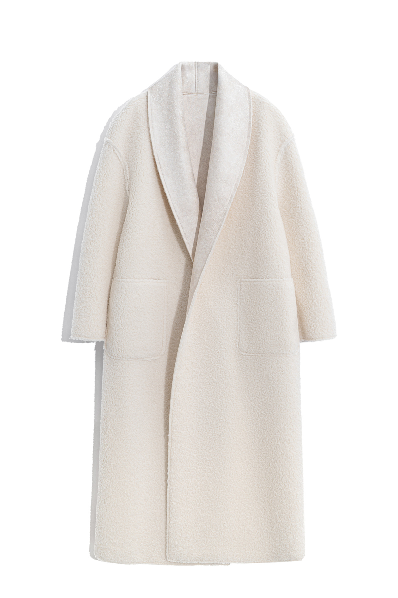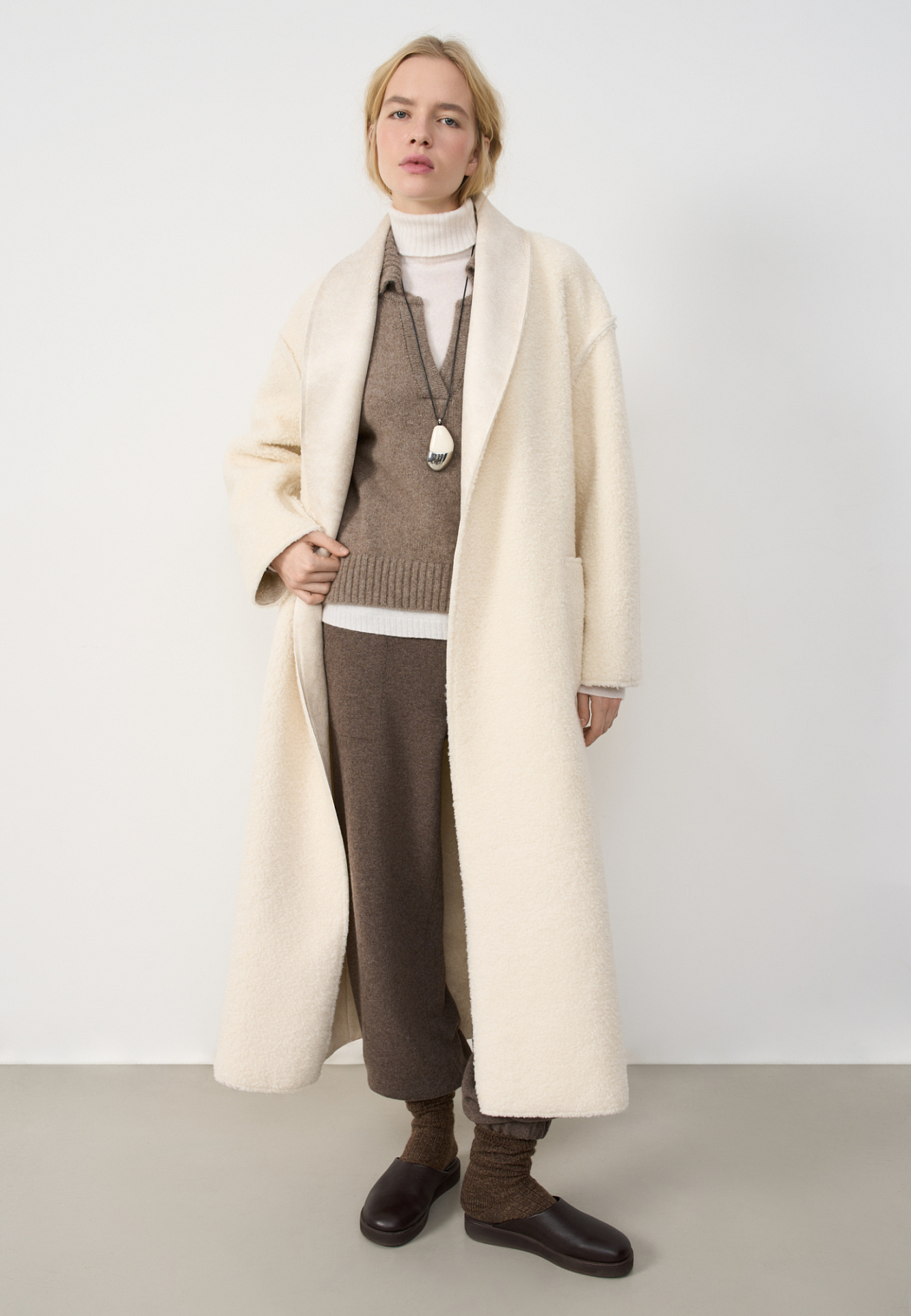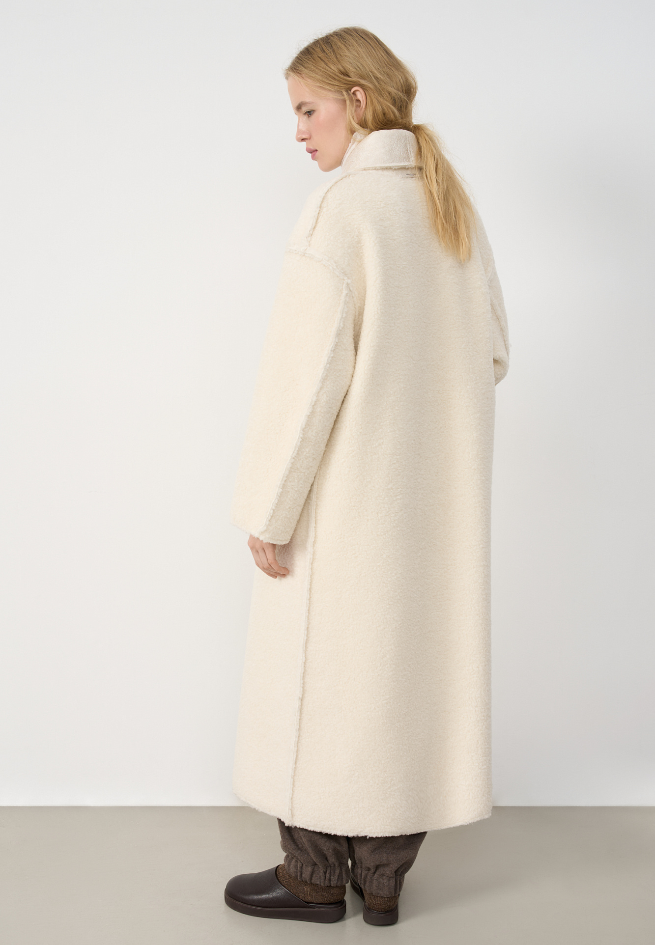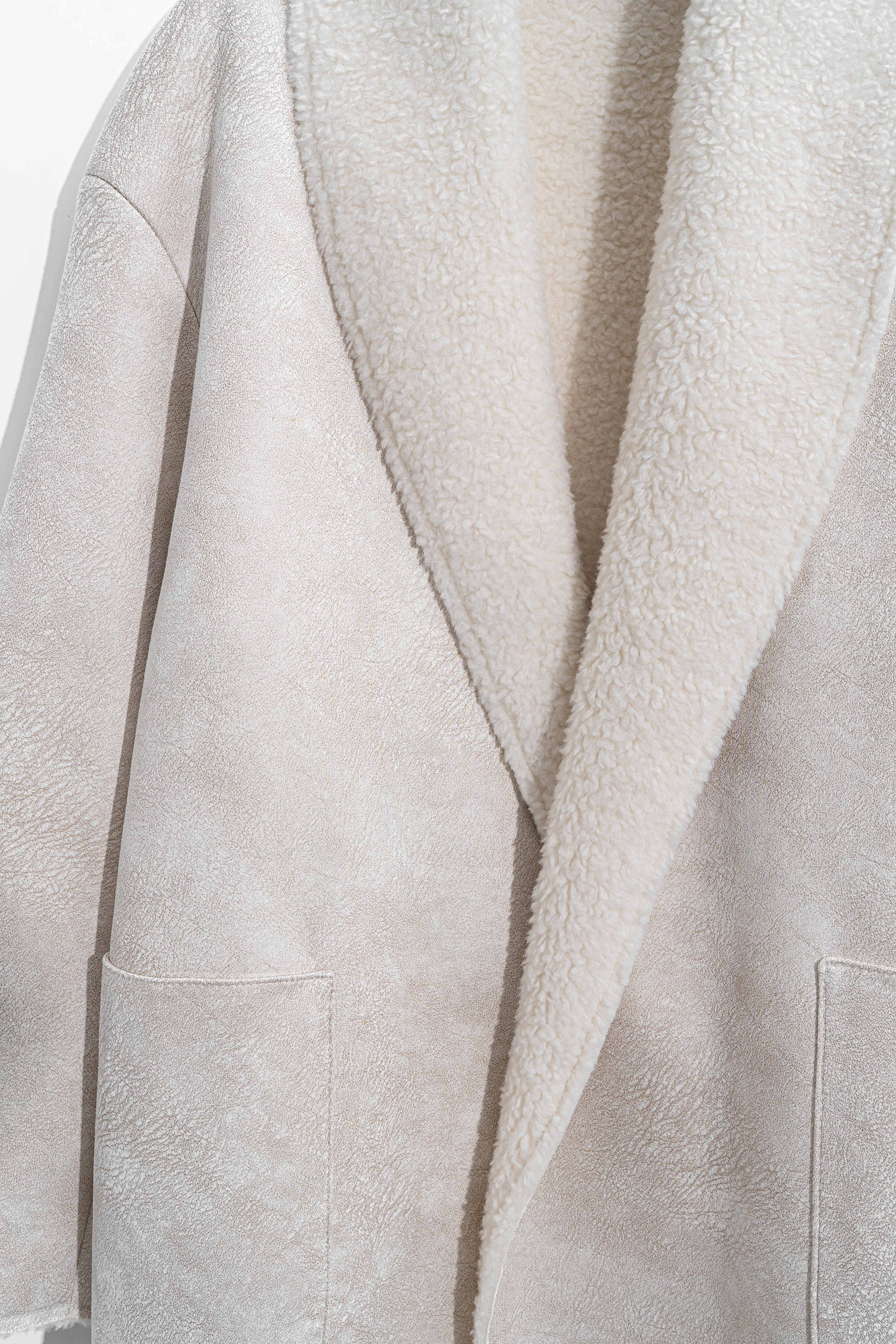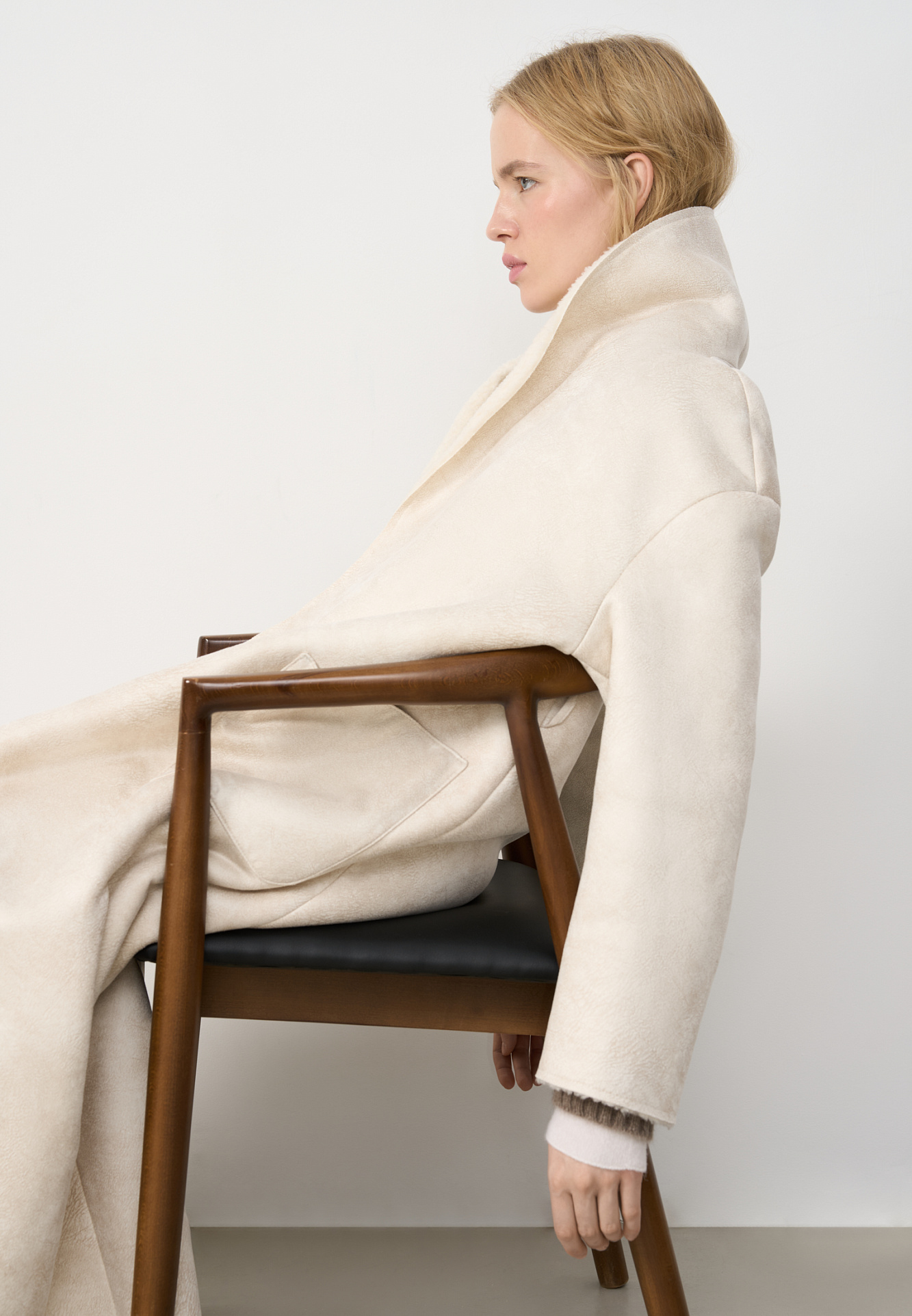 Двустороннее пальто-дубленка из шерсти. Модель прямого кроя на запах с узкими лацканами, большими накладными карманами и тонким поясом из экокожи.