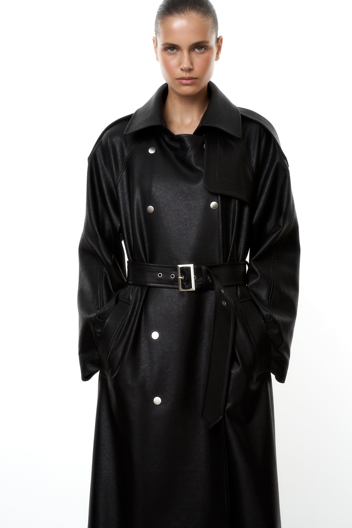 Тренч из экокожи на подкладке. Модель свободного силуэта с боковыми карманами и длинными рукавами. В комплекте съемный пояс из основного материала. Ворот и пояс застегиваются на металлическую пряжку. Застежка тренча на кнопки.