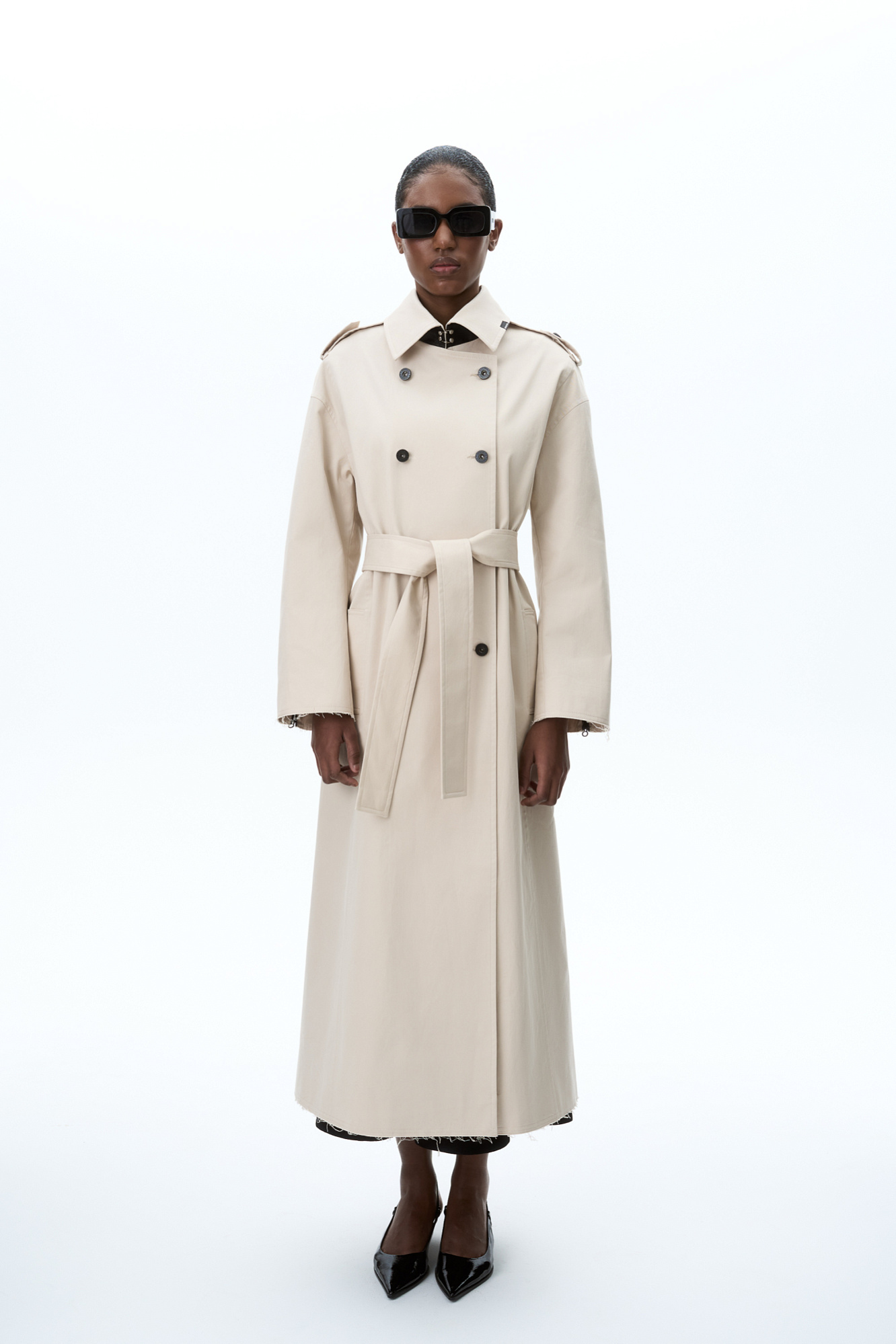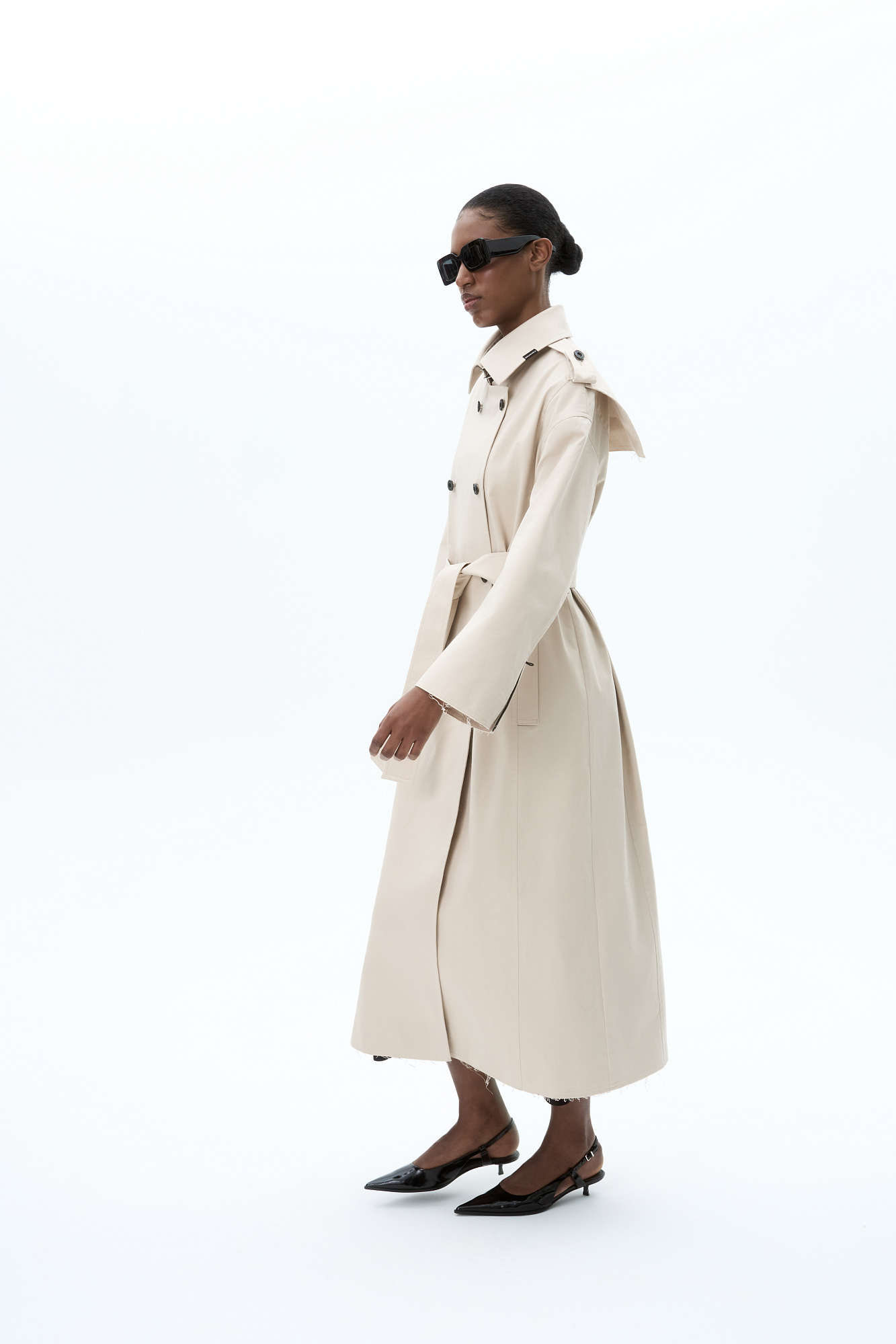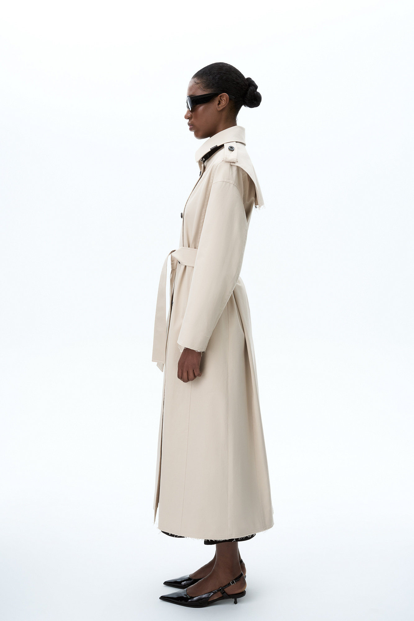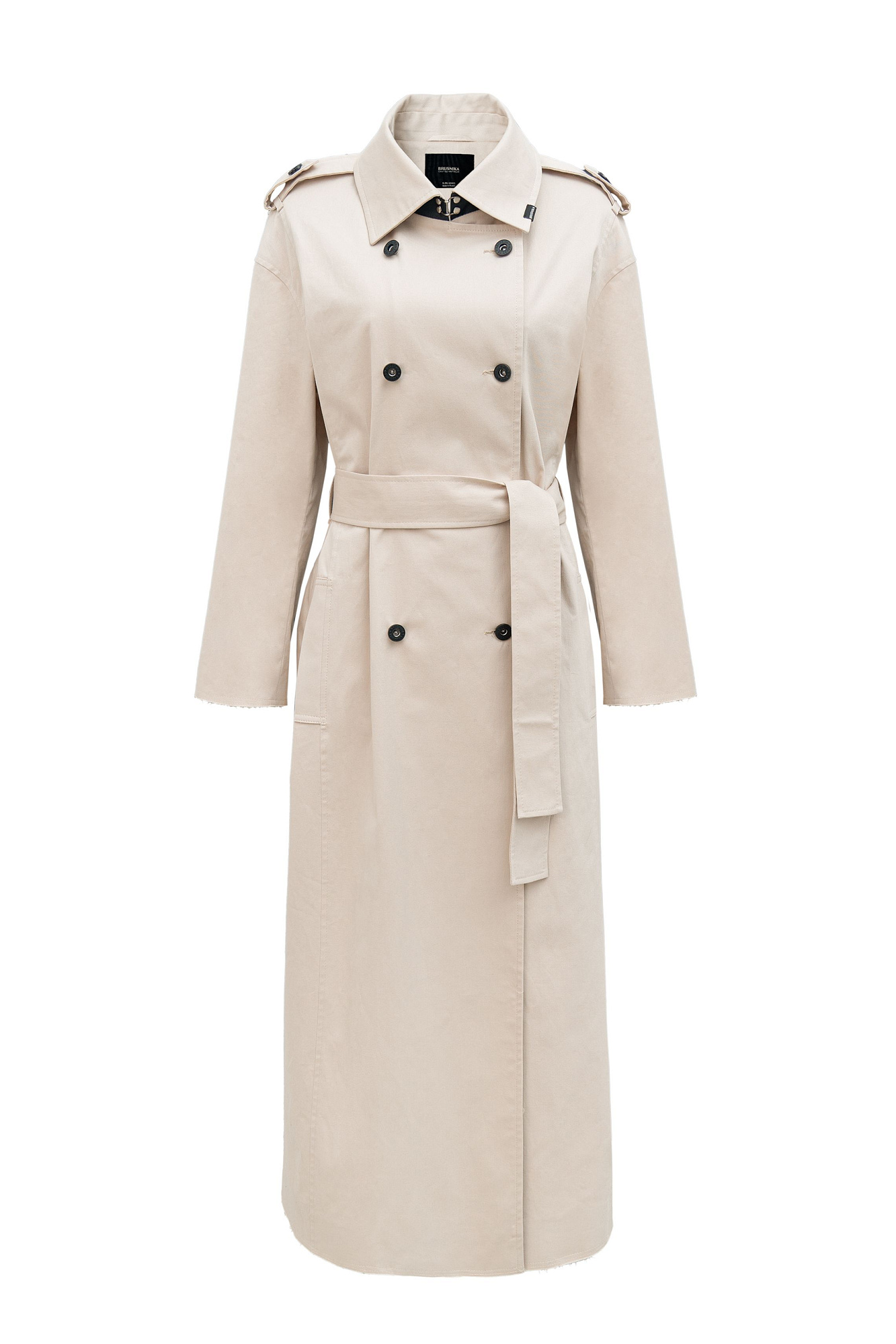 Двубортный тренч с необработанными краями и застежкой на воротнике. Модель свободного кроя с широким поясом из основного материала, боковыми карманами. Паты на плечах. На подкладке. Застежка на пуговицы.