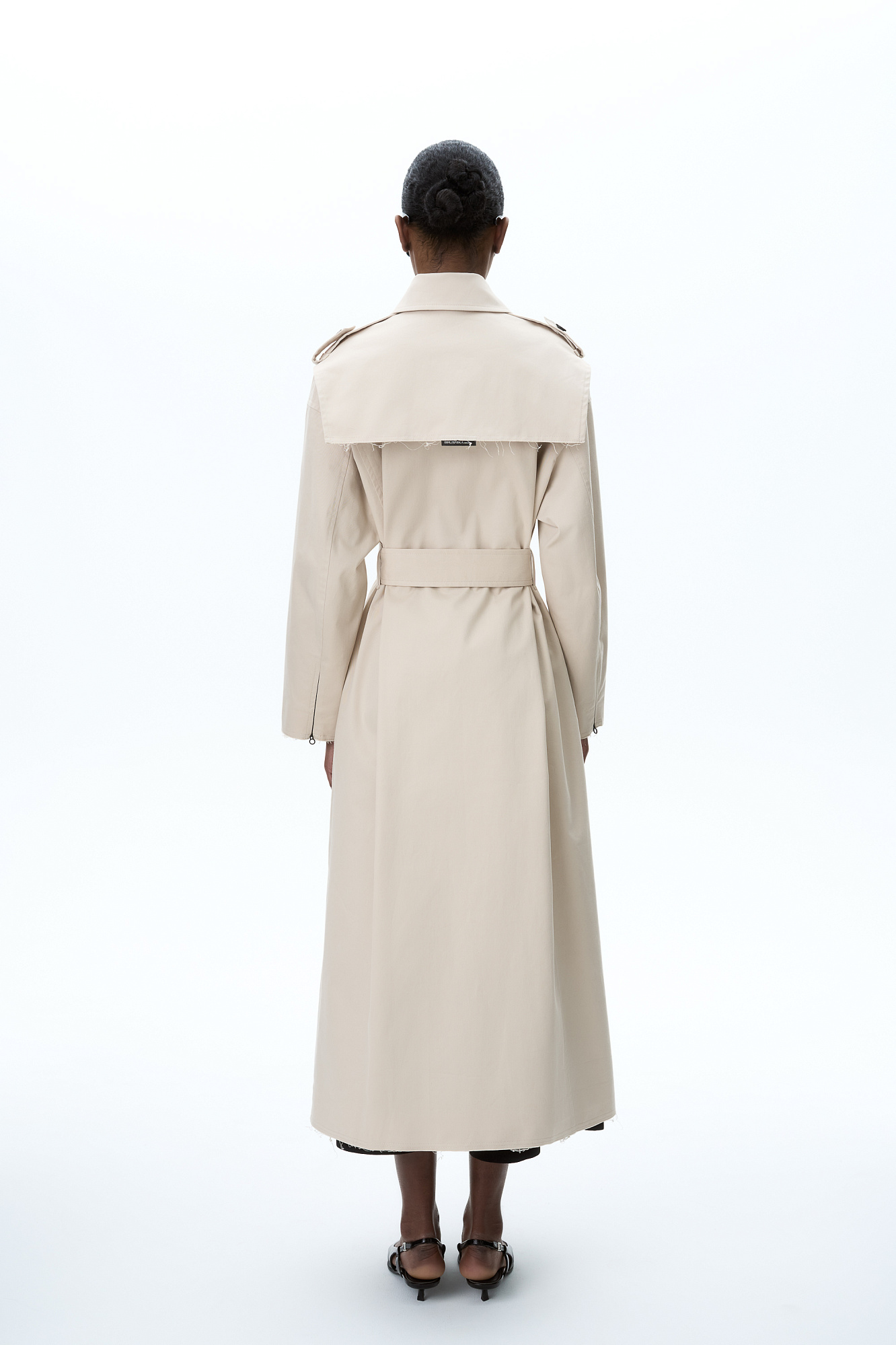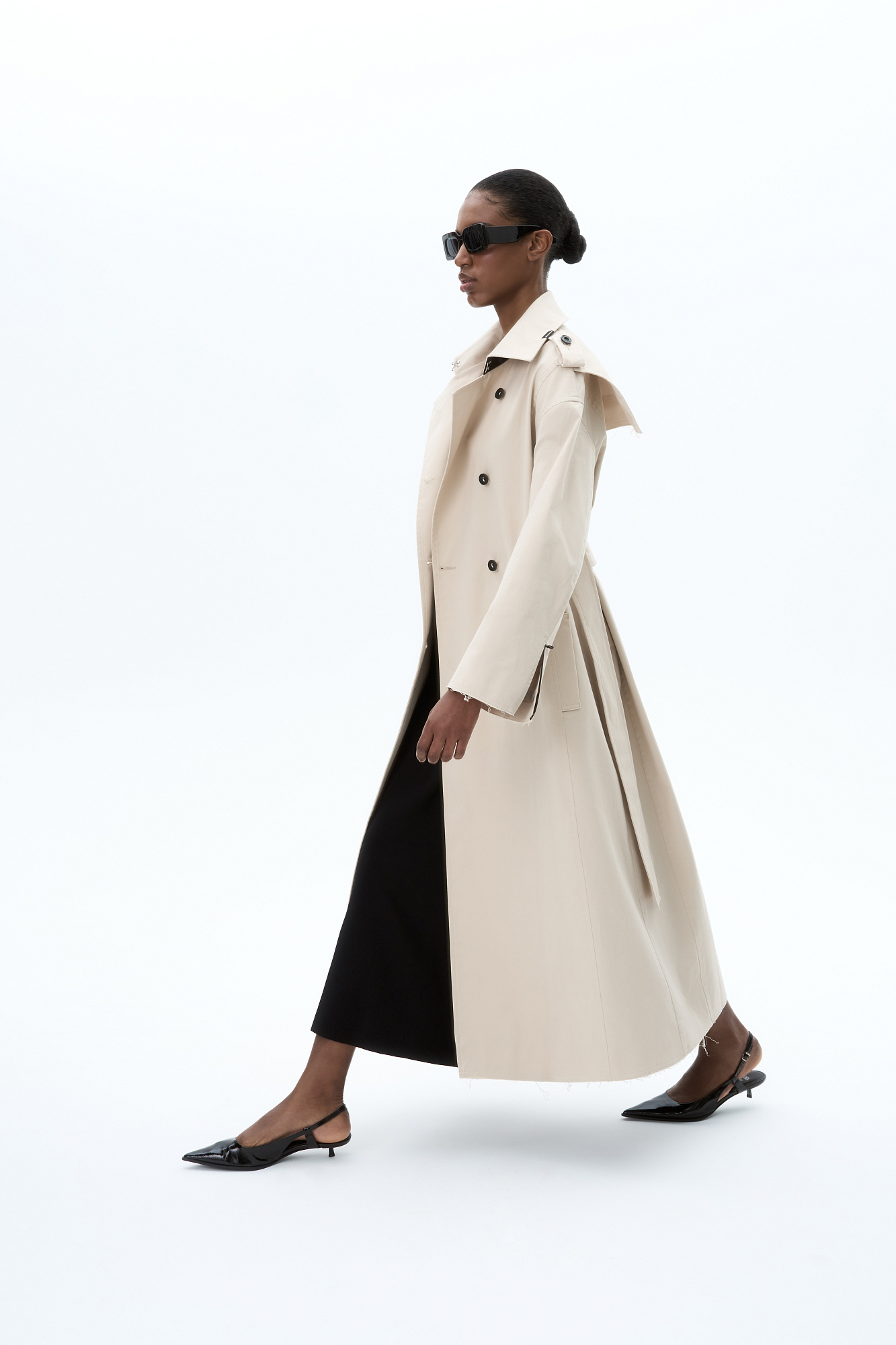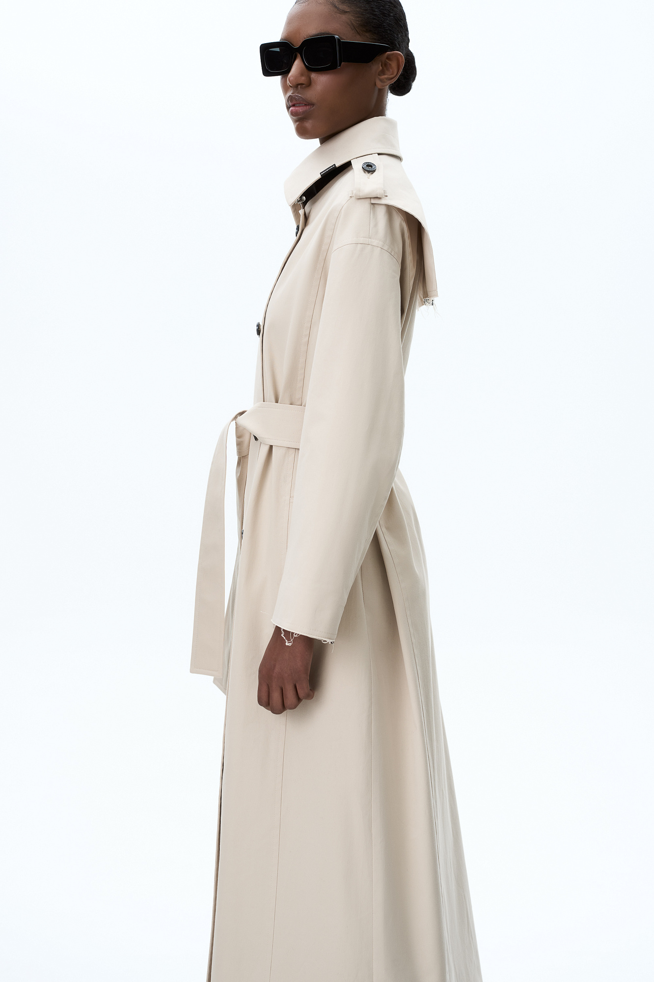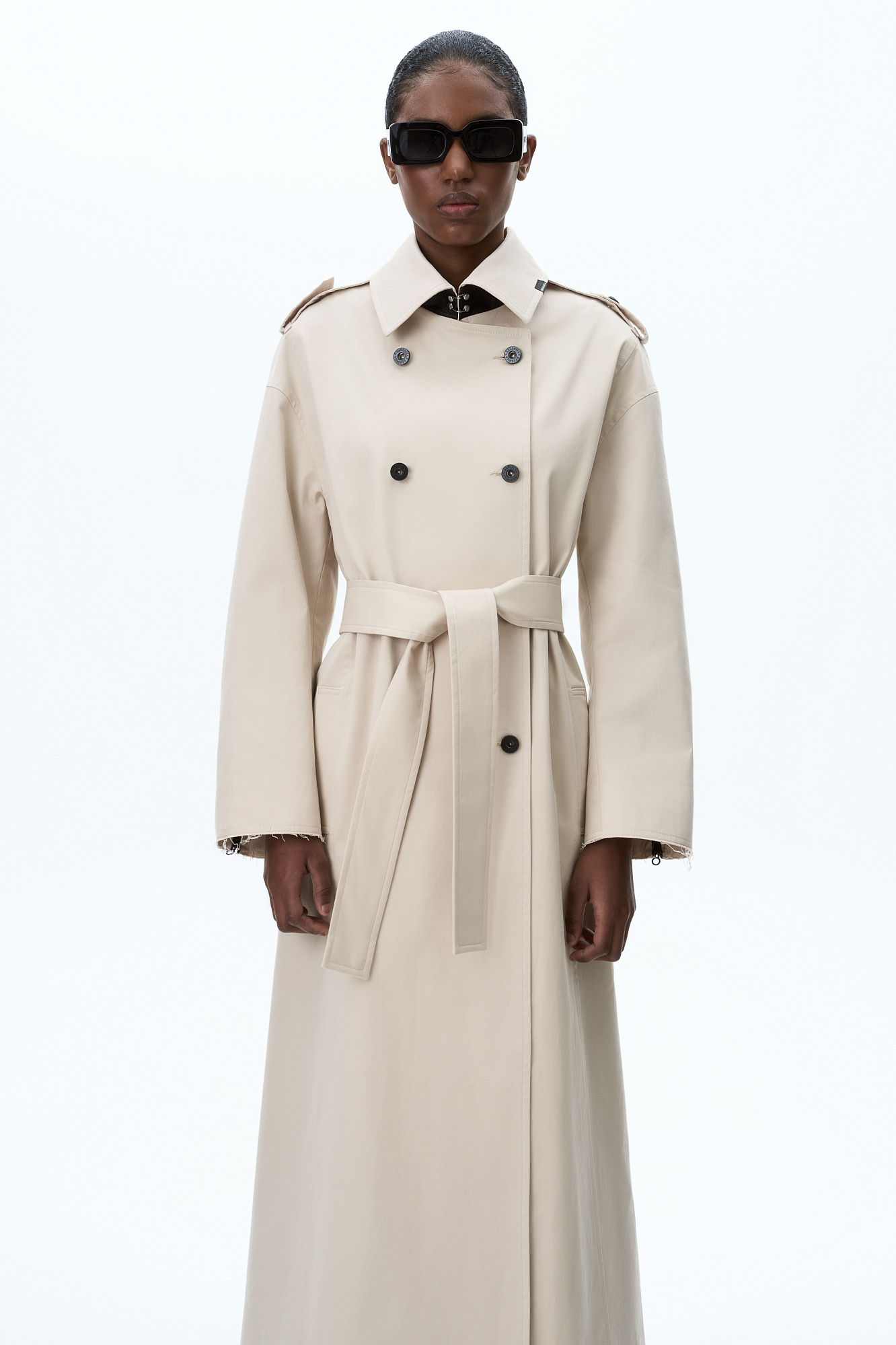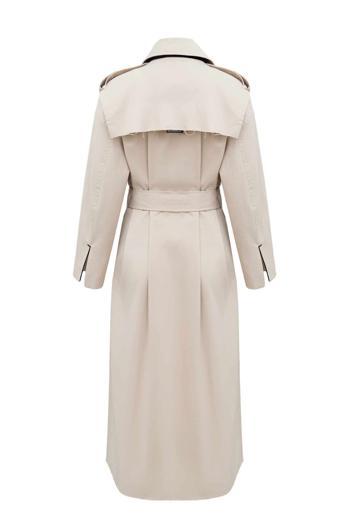 Двубортный тренч с необработанными краями и застежкой на воротнике. Модель свободного кроя с широким поясом из основного материала, боковыми карманами. Паты на плечах. На подкладке. Застежка на пуговицы.