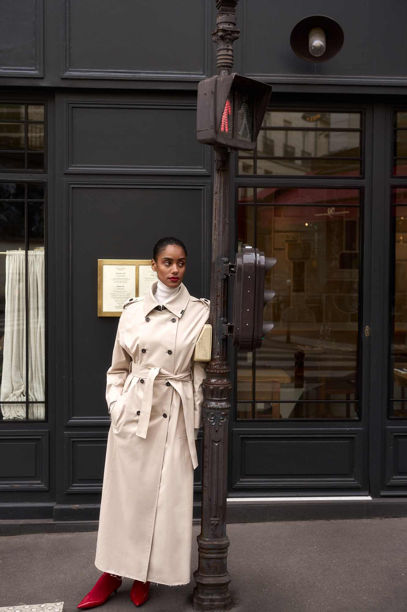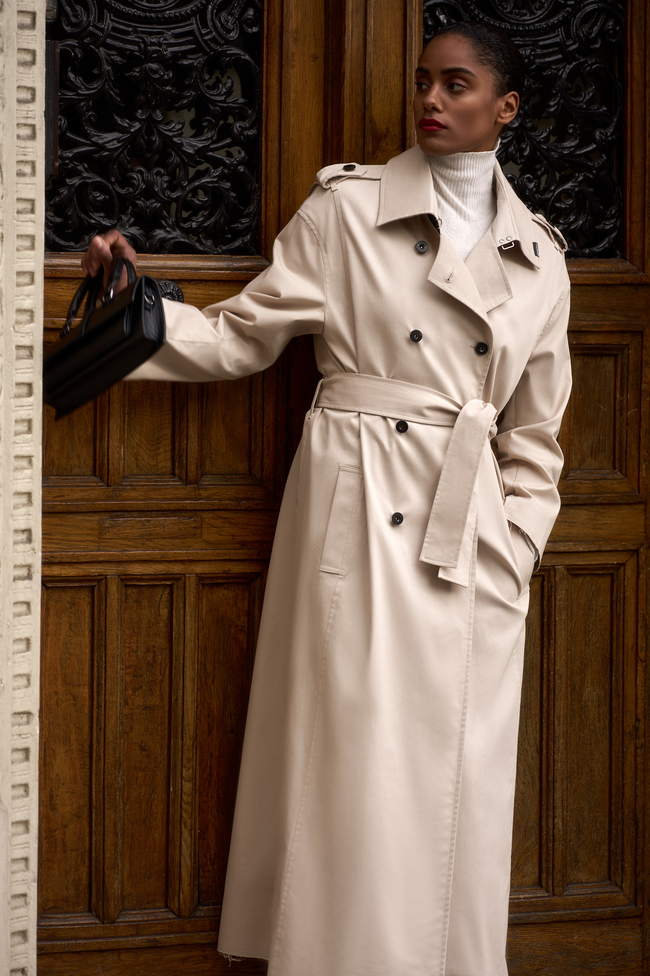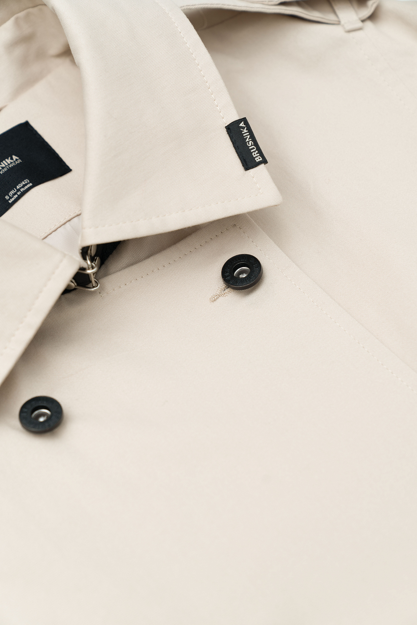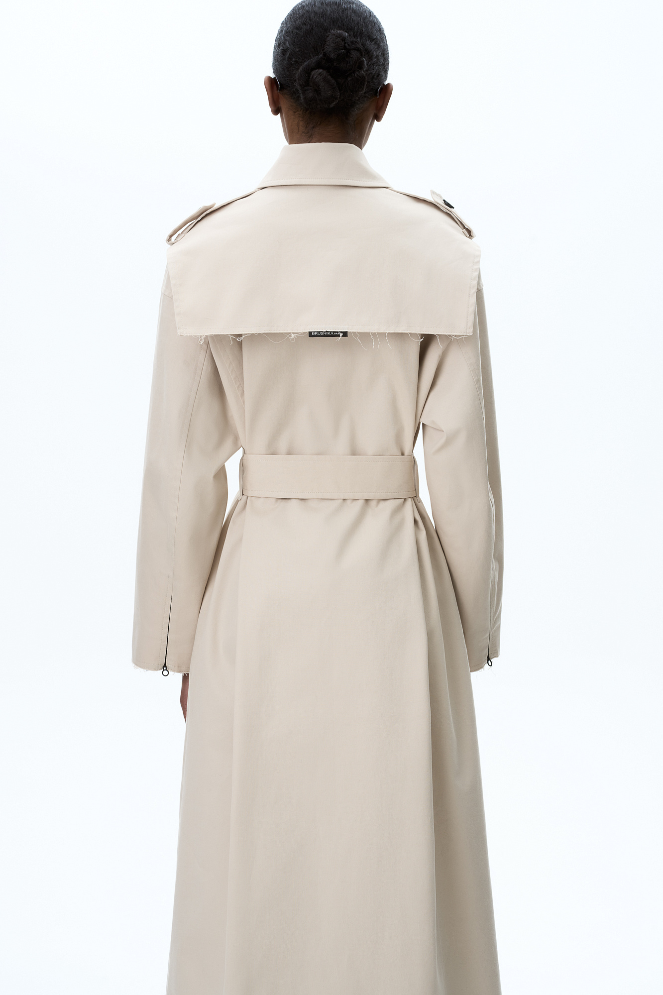 Двубортный тренч с необработанными краями и застежкой на воротнике. Модель свободного кроя с широким поясом из основного материала, боковыми карманами. Паты на плечах. На подкладке. Застежка на пуговицы.