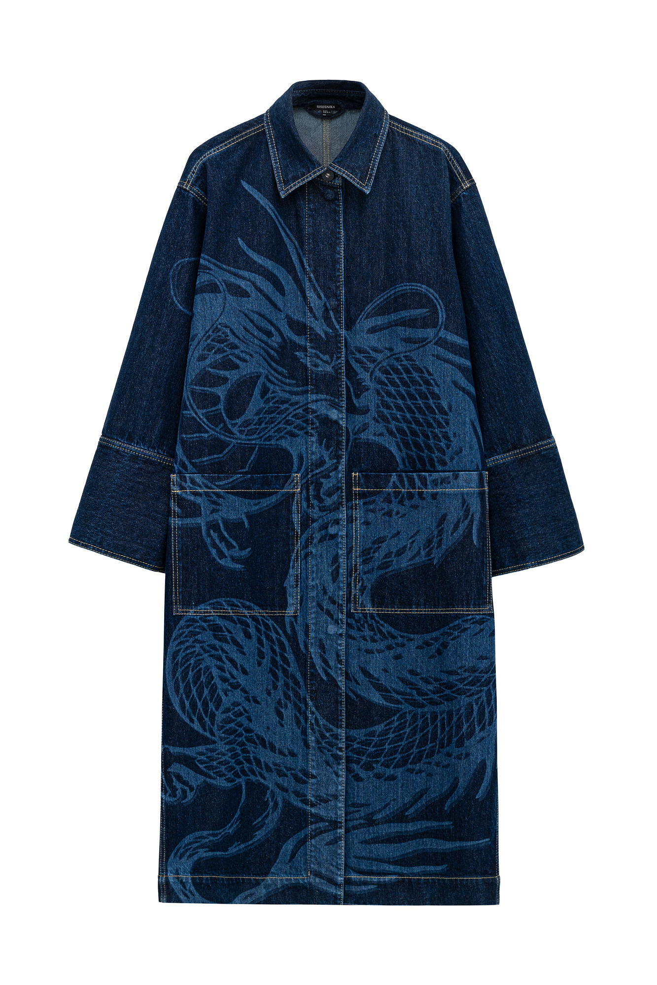 Свободный джинсовый плащ с принтом из 100% хлопка. Модель со спущенной линией плеча и накладными карманами. Застежка на кнопки. Дополнить образ можно рубашкой и джинсами в таком же стиле.