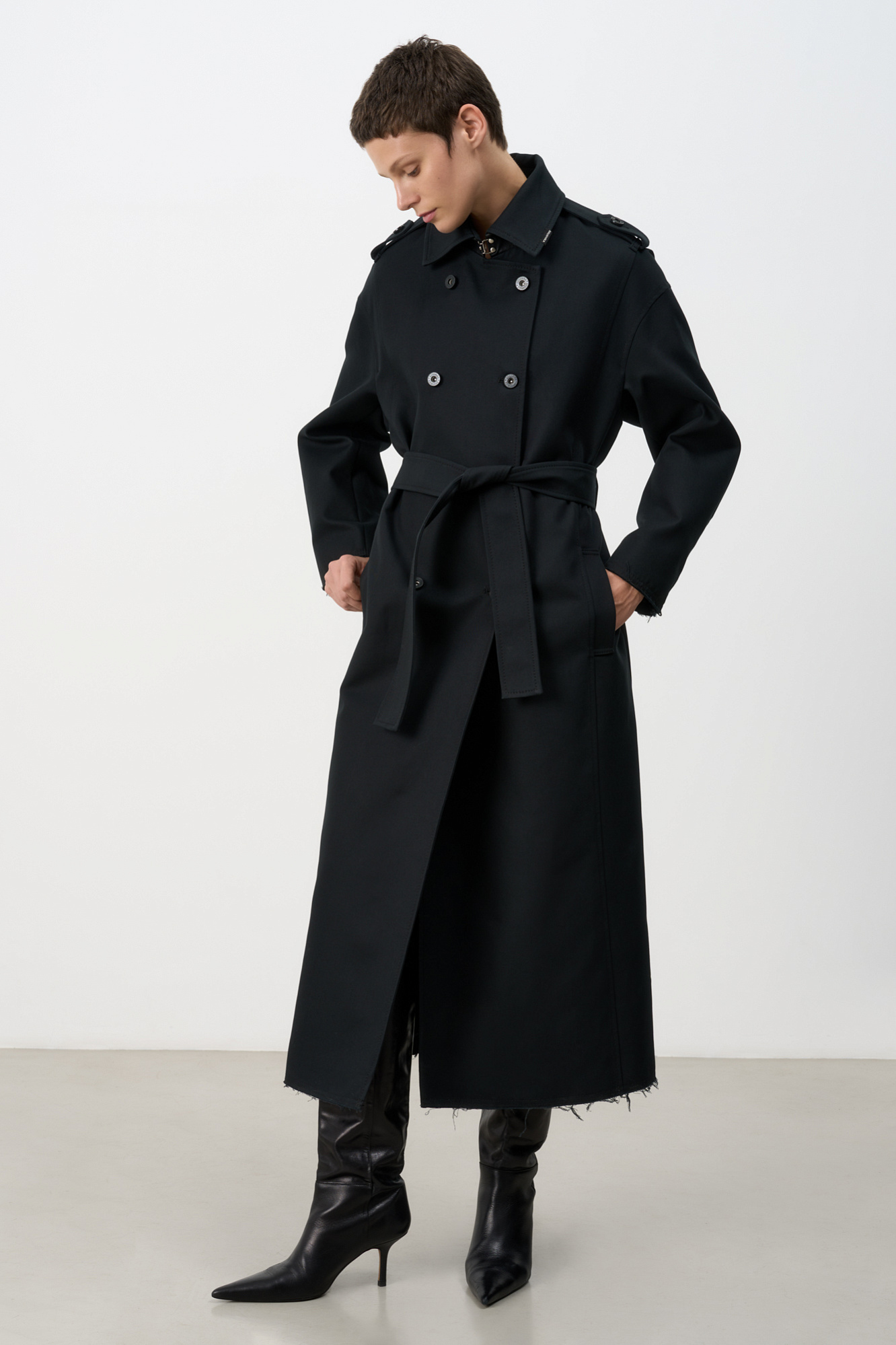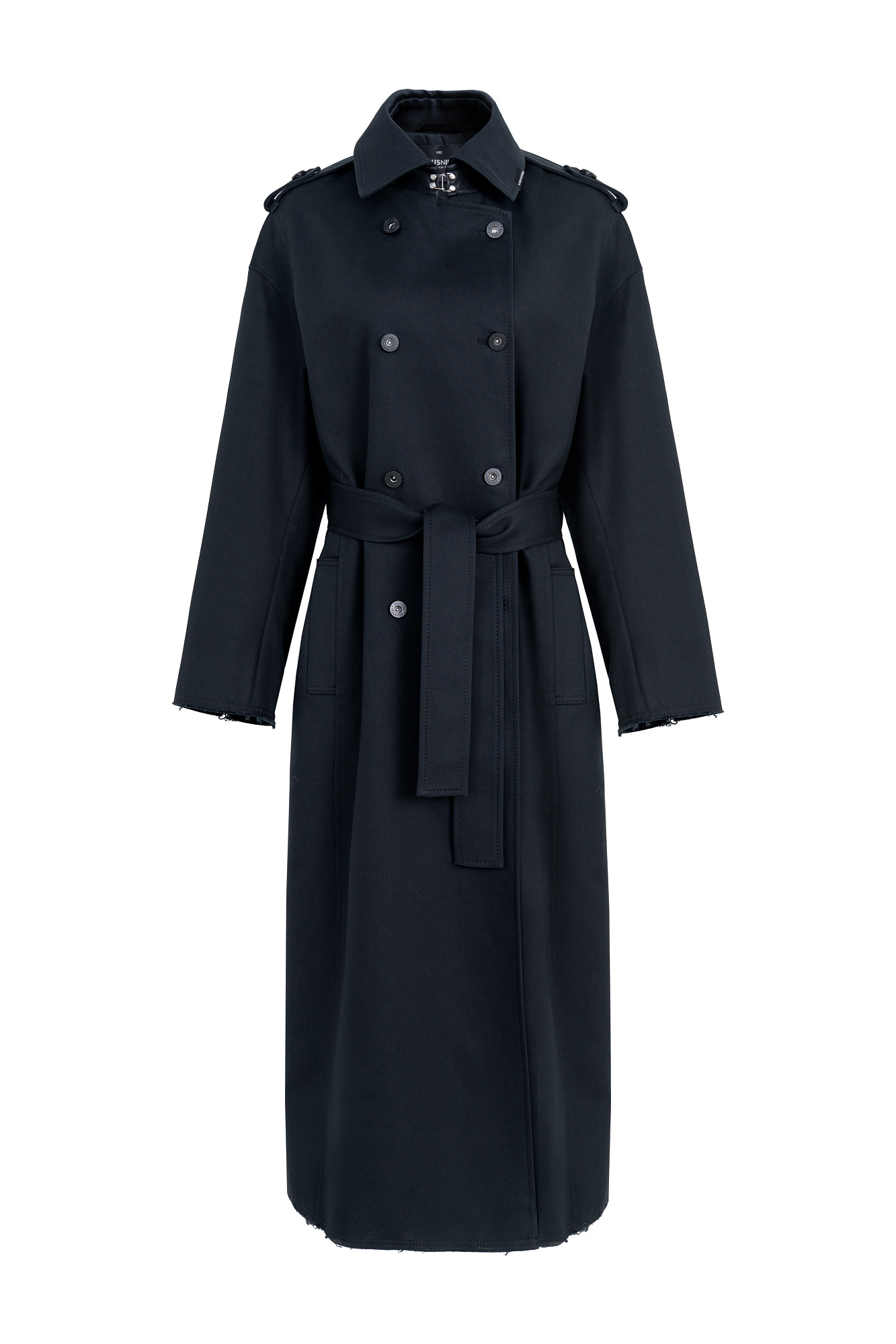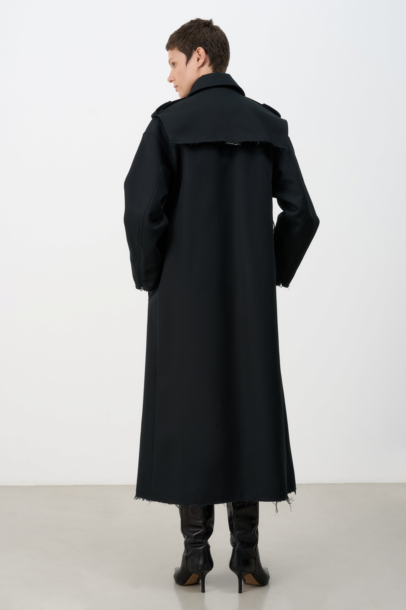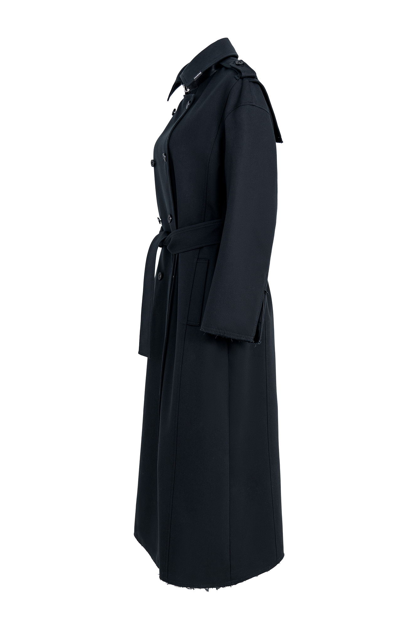Двубортный oversize плащ с необработанными краями. Асимметричная отлетная кокетка, отложной воротник и широкий пояс из основного материала. На подкладке.