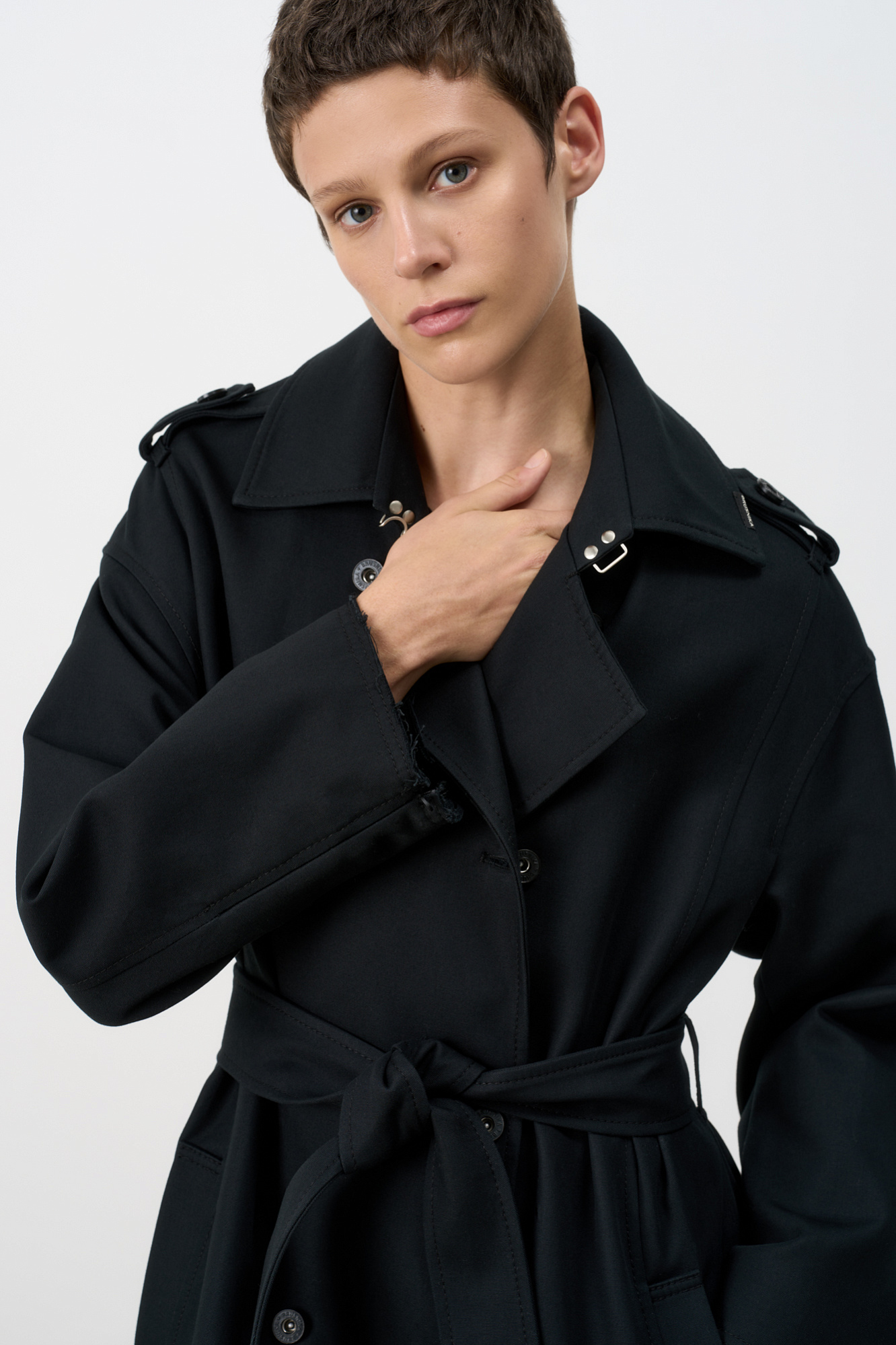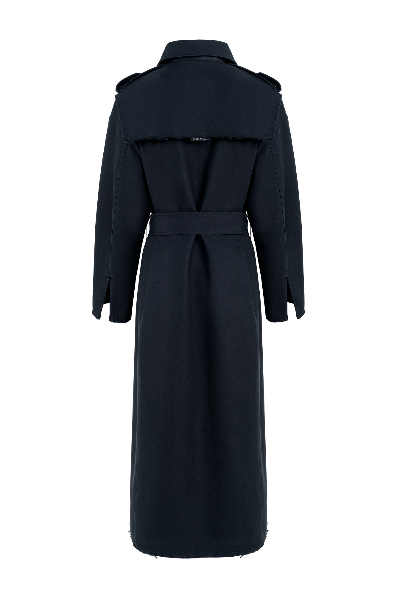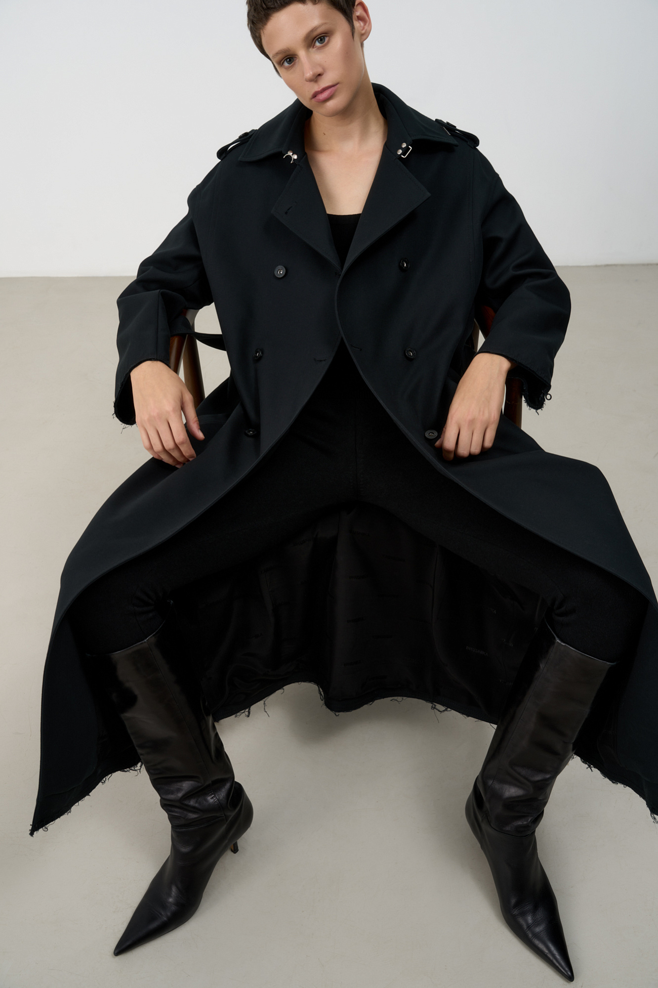 Двубортный oversize плащ с необработанными краями. Асимметричная отлетная кокетка, отложной воротник и широкий пояс из основного материала. На подкладке.