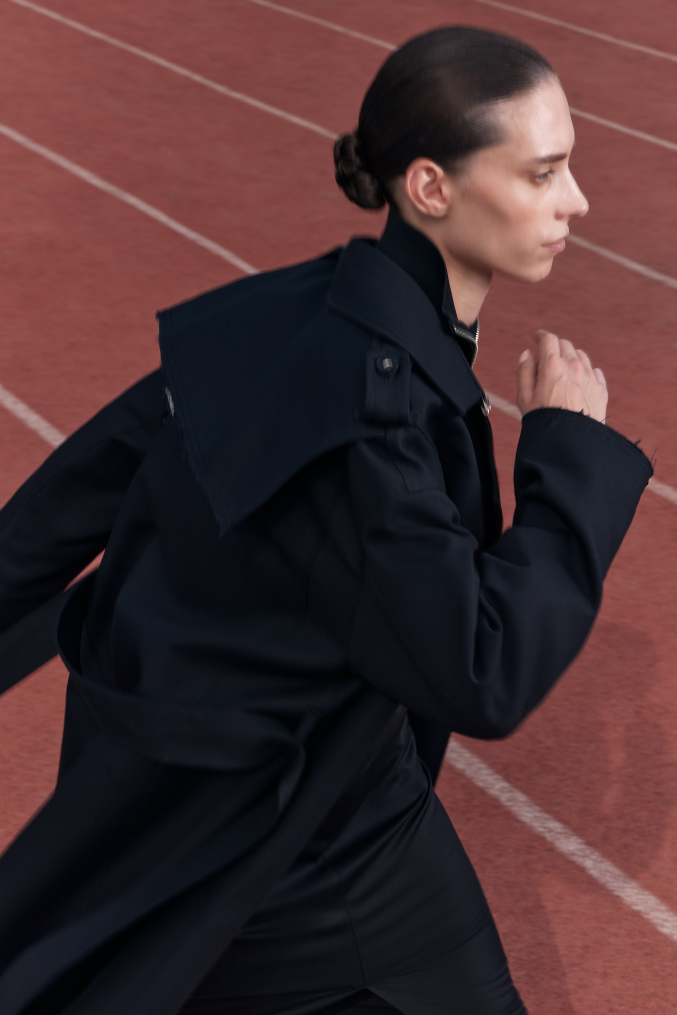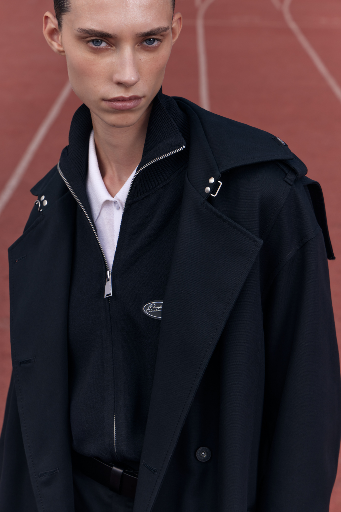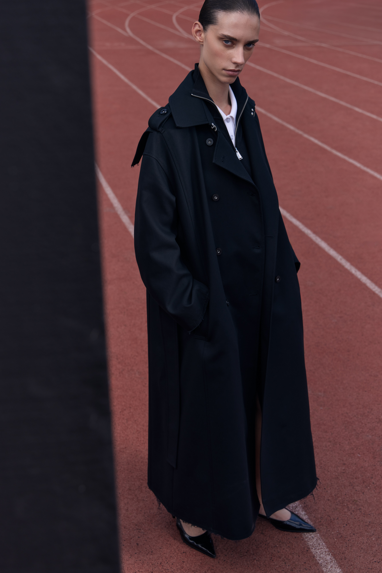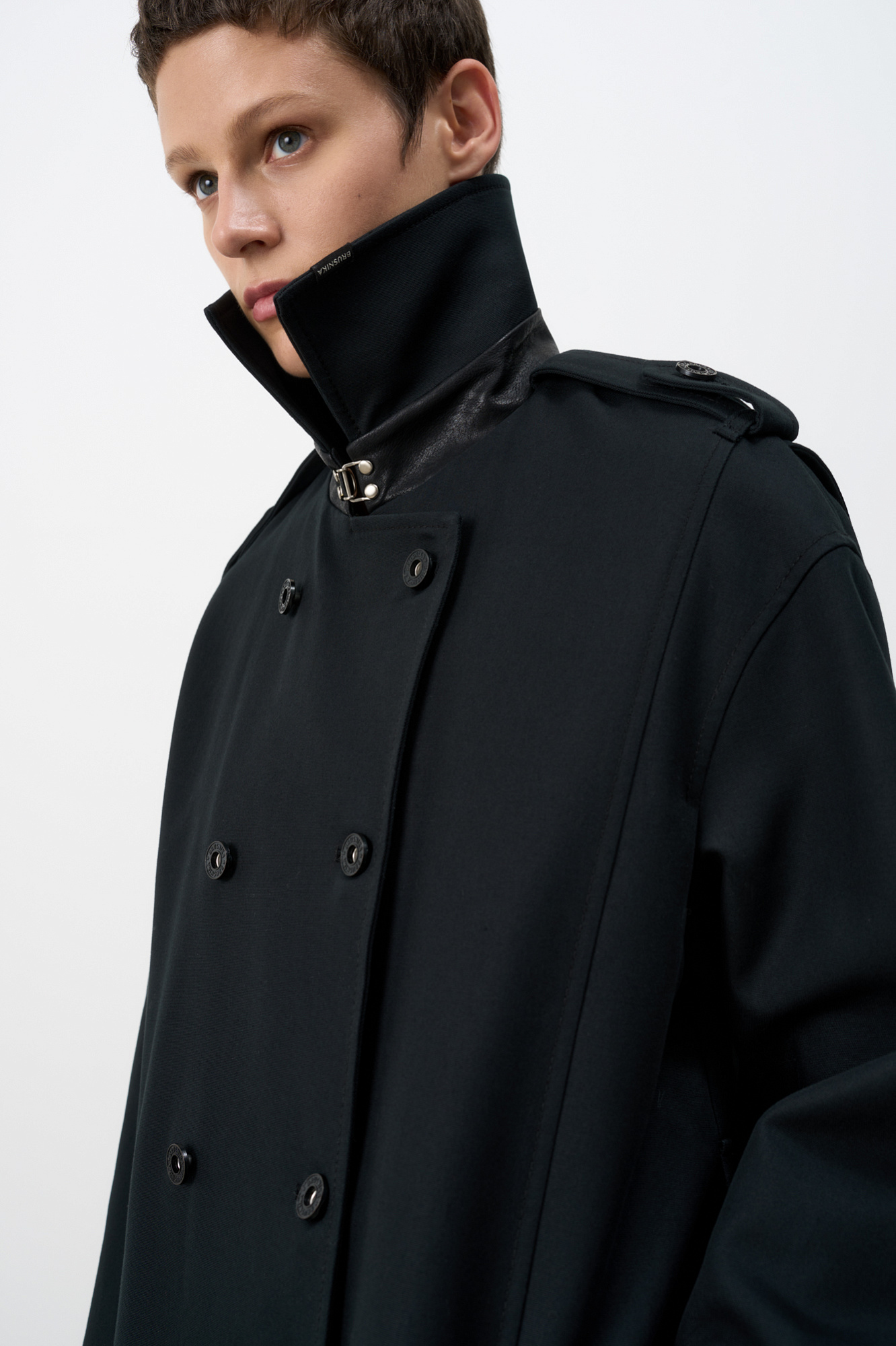 Двубортный oversize плащ с необработанными краями. Асимметричная отлетная кокетка, отложной воротник и широкий пояс из основного материала. На подкладке.