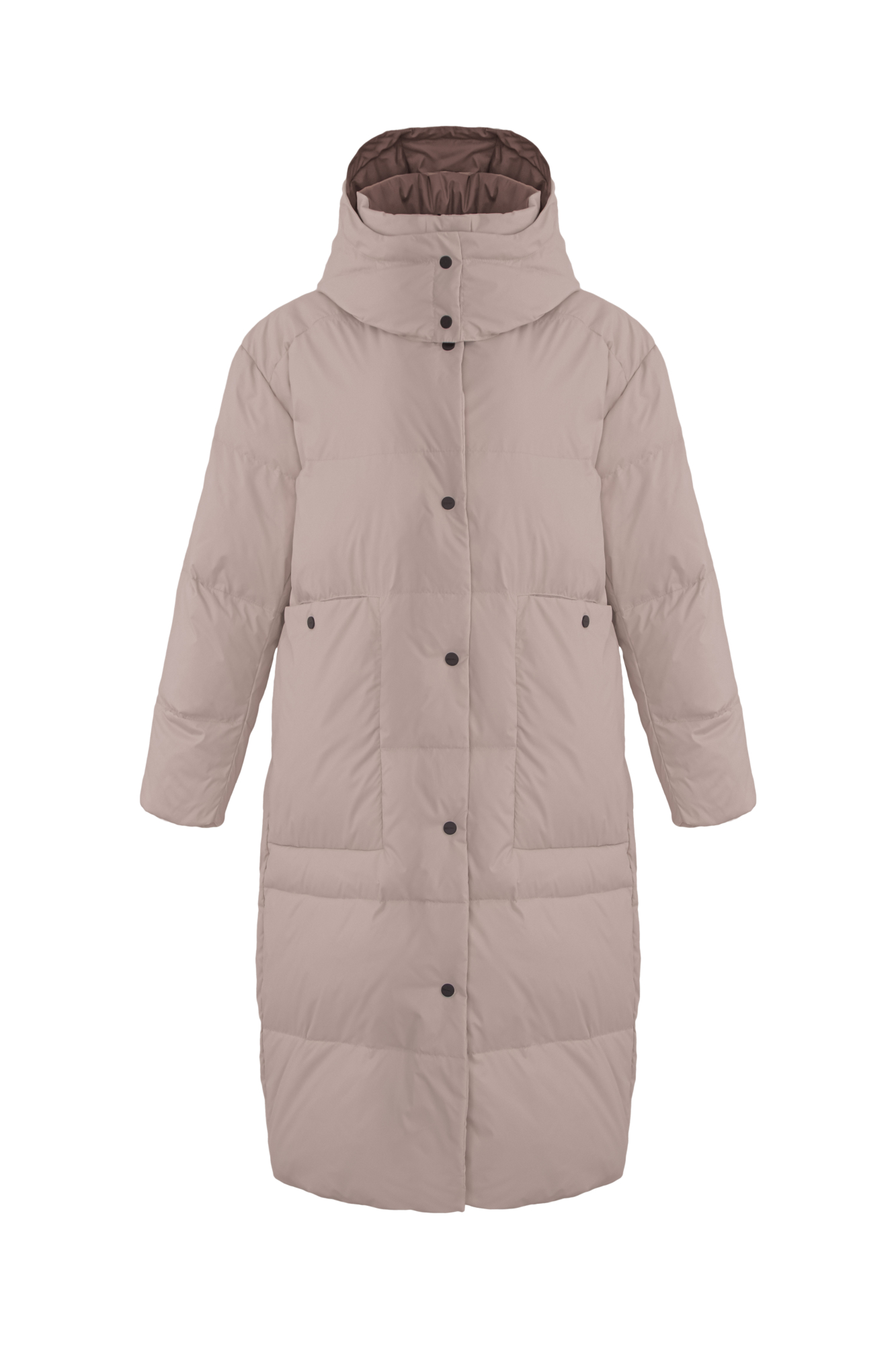 Удлиненный пуховик с капюшоном. Средний показатель водонепроницаемости, можно носить в сухую погоду или моросящий дождик.