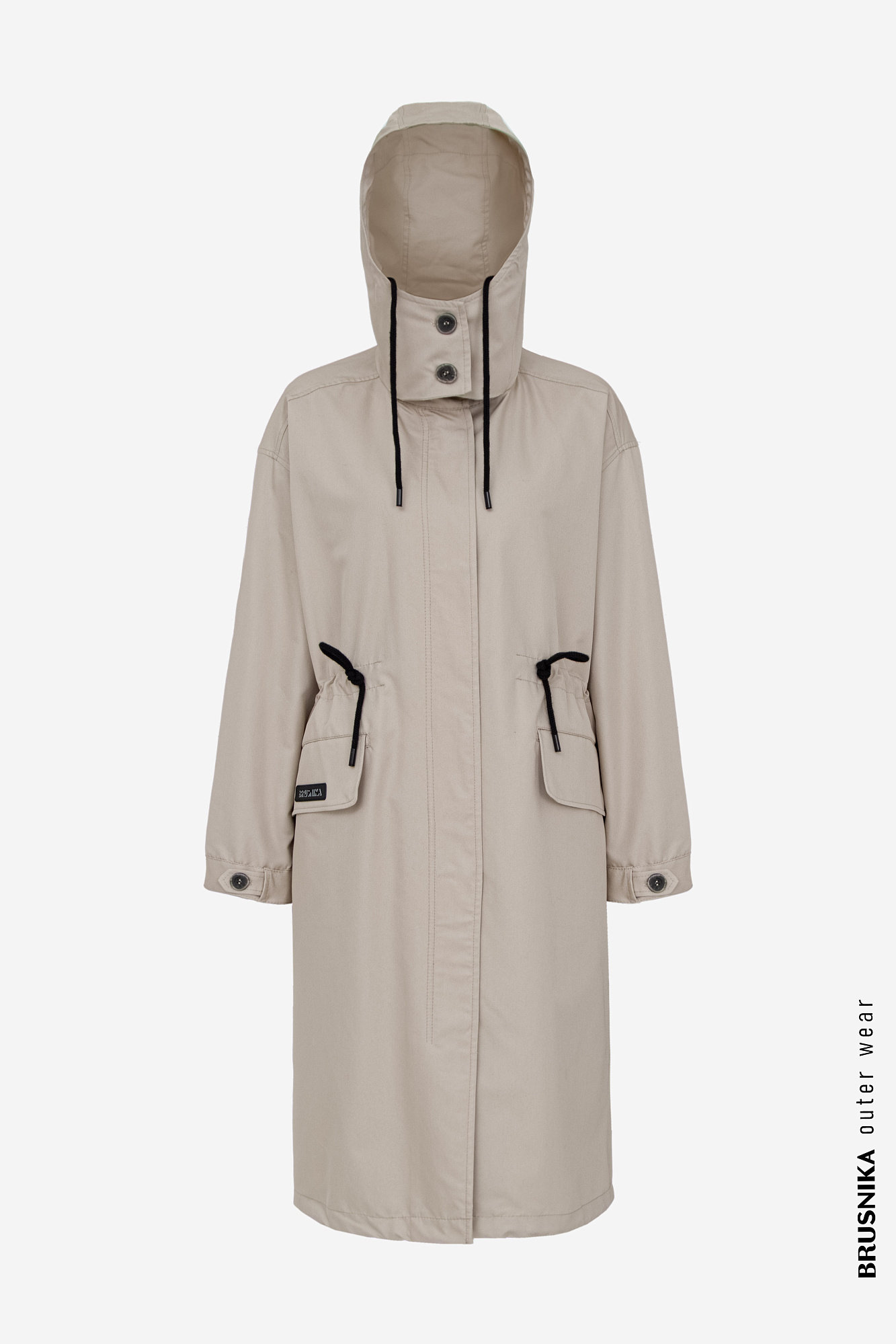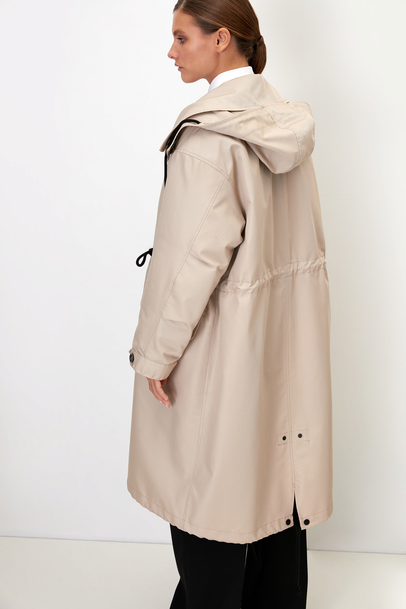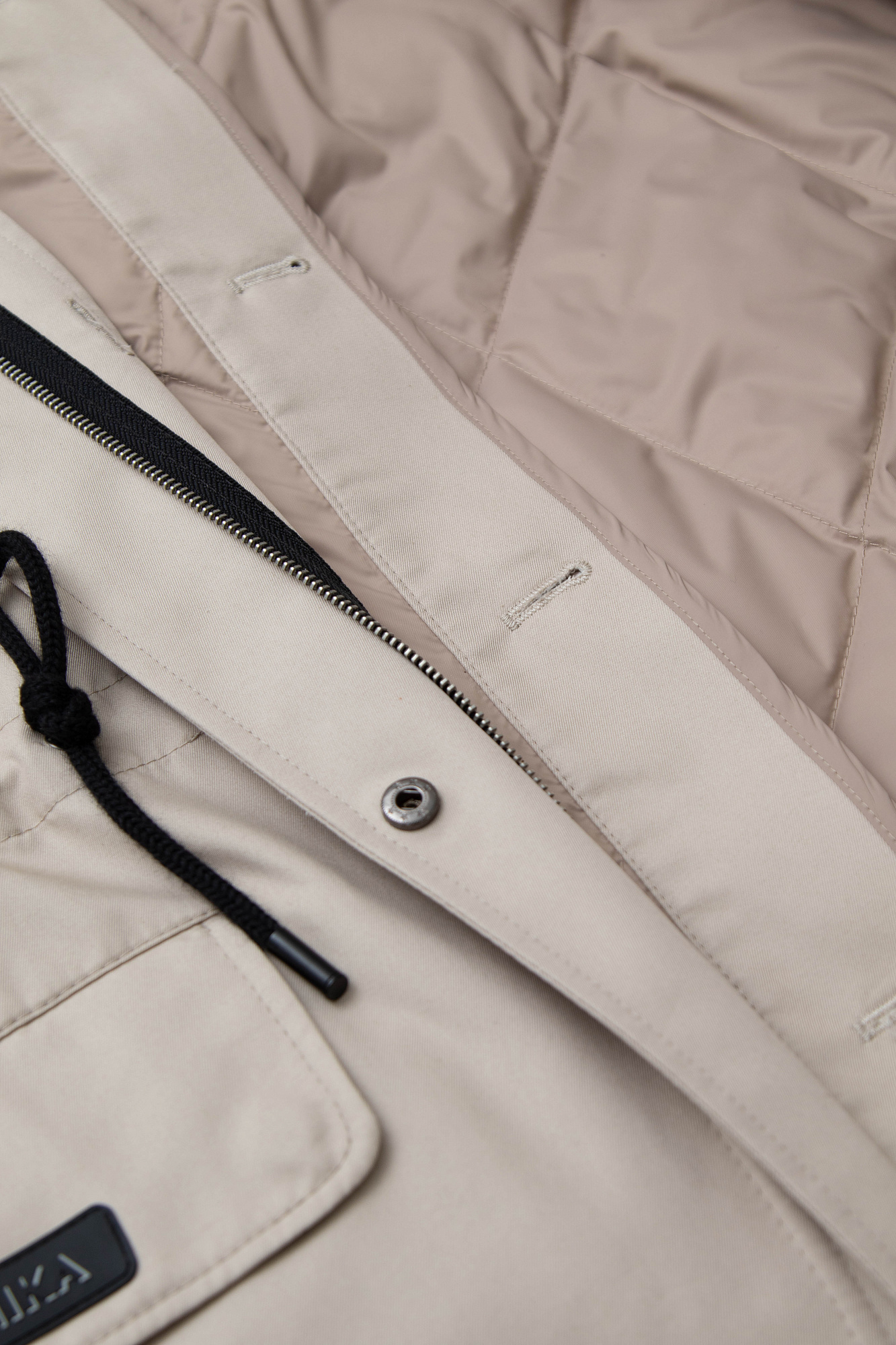 Парка с накладными карманами, воротником-стойка и капюшоном на пуговицах. Съемная стеганая подкладка, выполненаная из натурального пух-пера. Потайная застежка на молнии и кнопках. Для фиксации кулиска на поясе и капюшоне. Средний показатель водонепроницаемости, можно носить в сухую погоду или моросящий дождик.