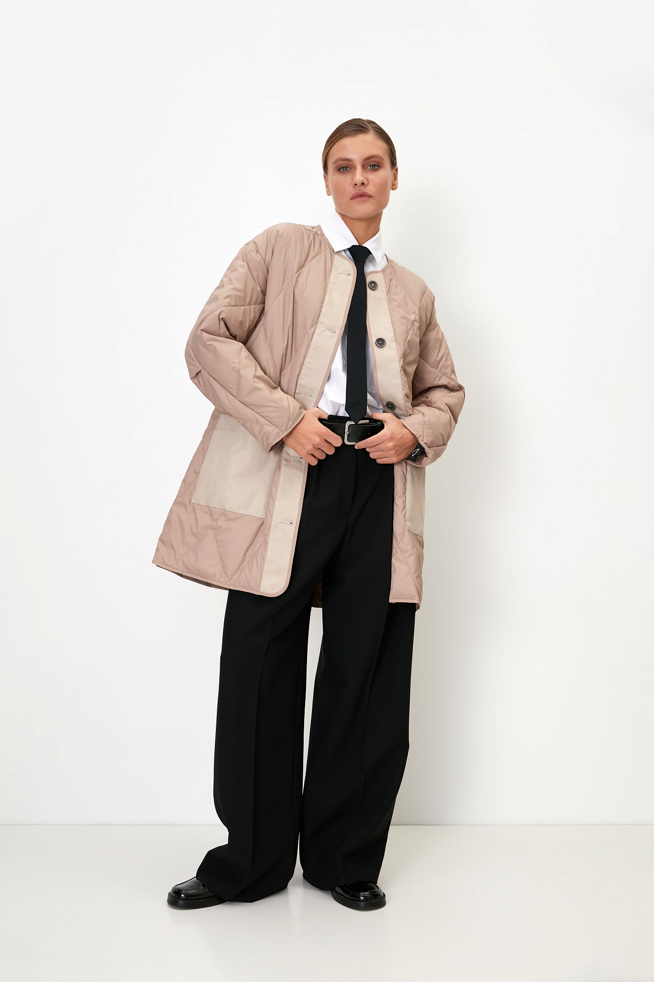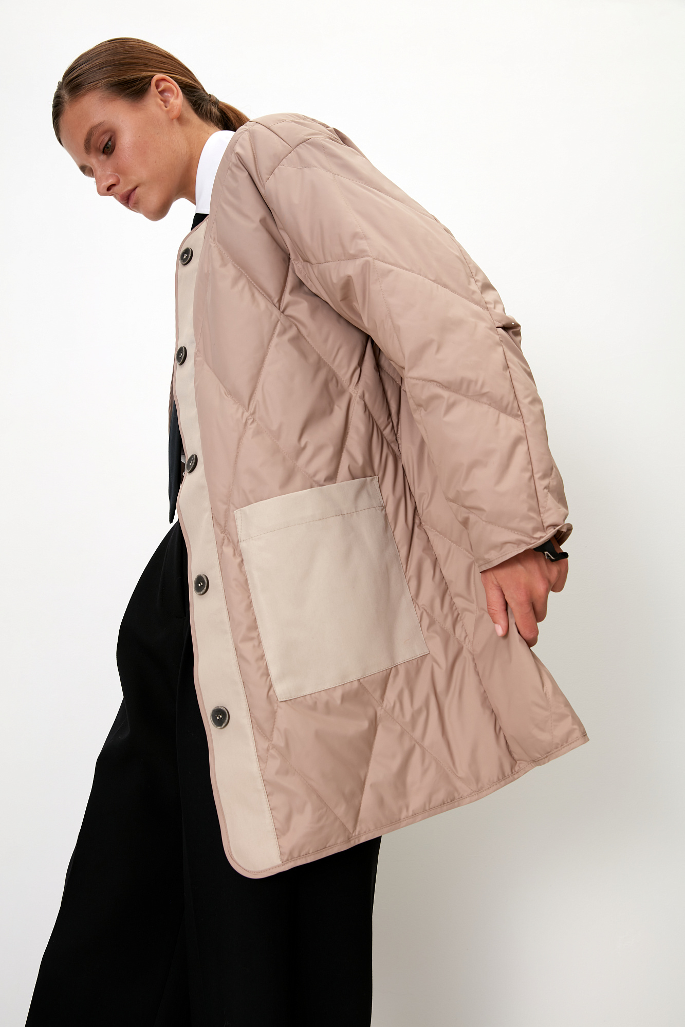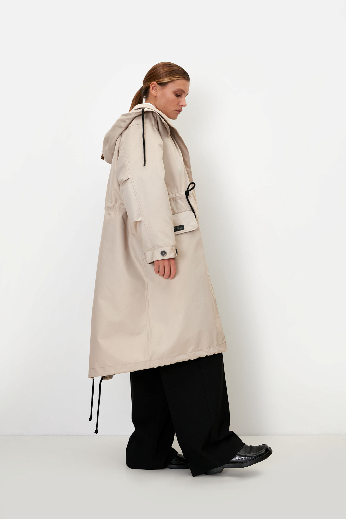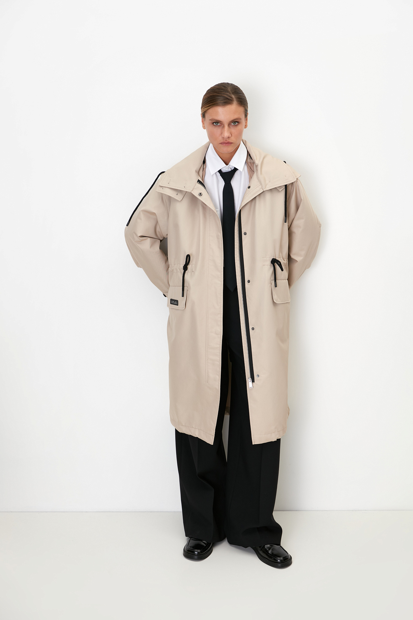 Парка с накладными карманами, воротником-стойка и капюшоном на пуговицах. Съемная стеганая подкладка, выполненаная из натурального пух-пера. Потайная застежка на молнии и кнопках. Для фиксации кулиска на поясе и капюшоне. Средний показатель водонепроницаемости, можно носить в сухую погоду или моросящий дождик.