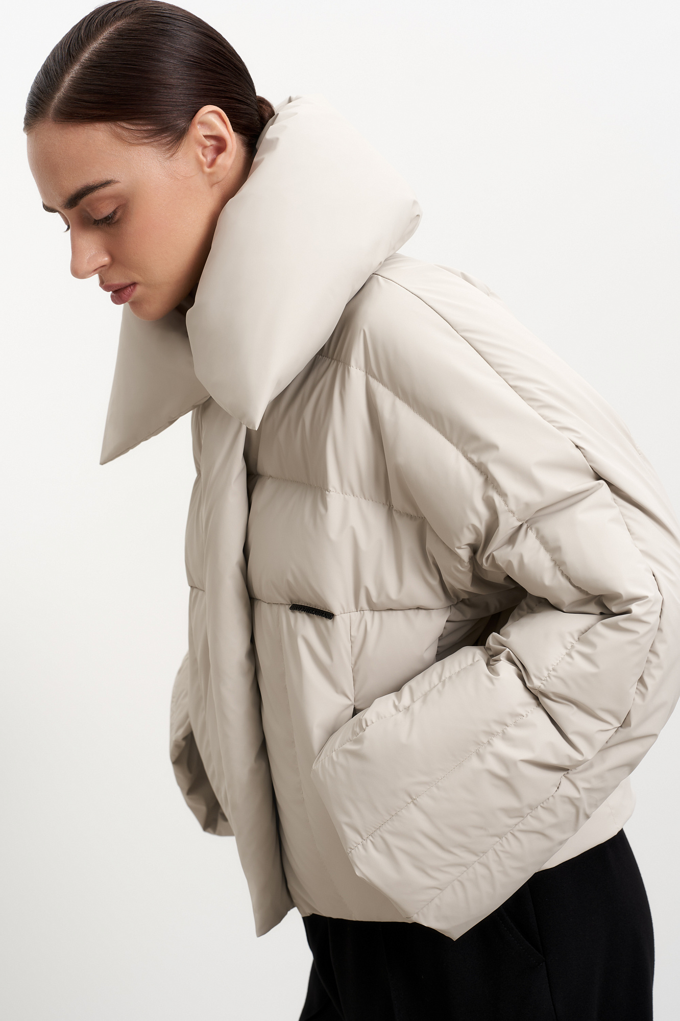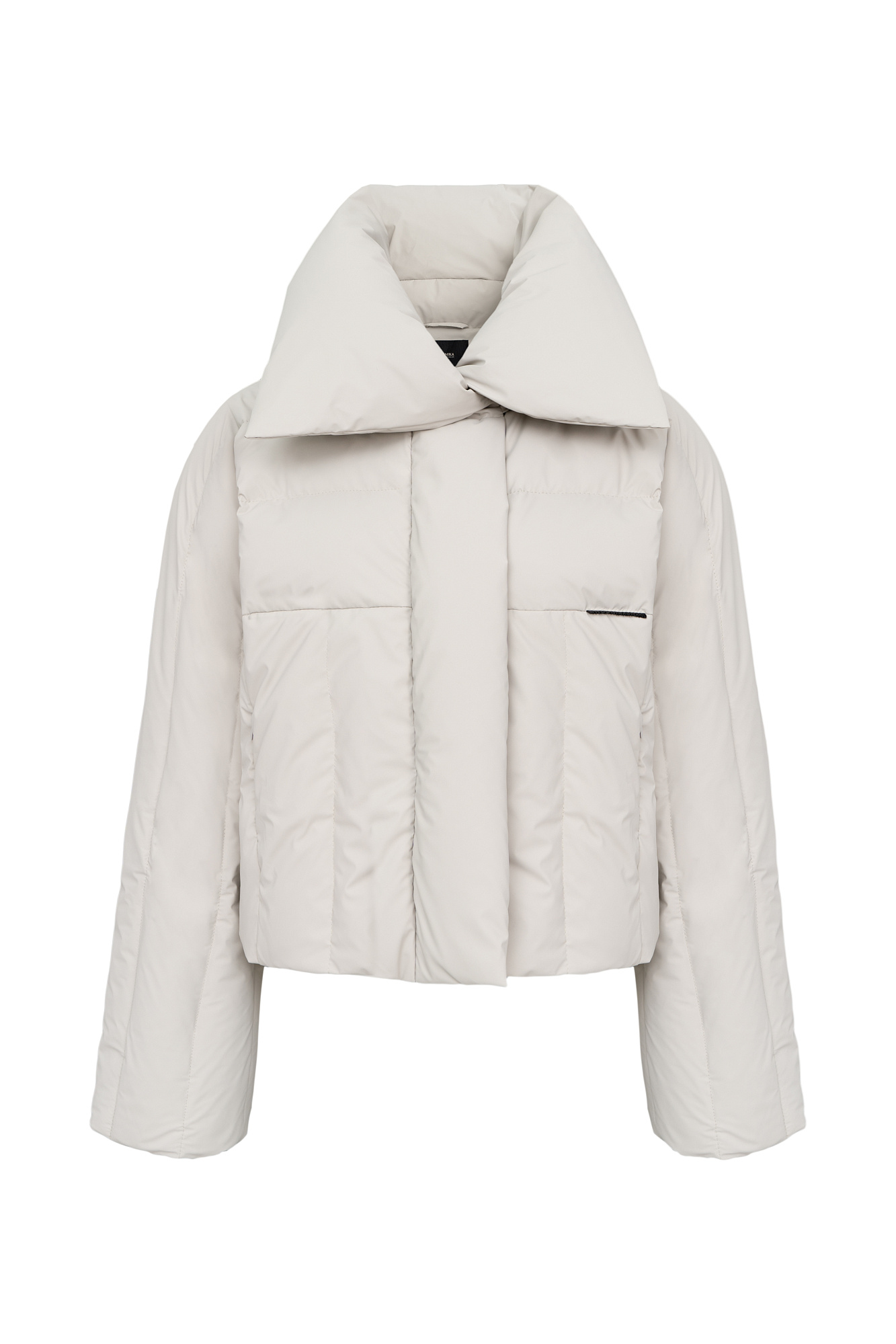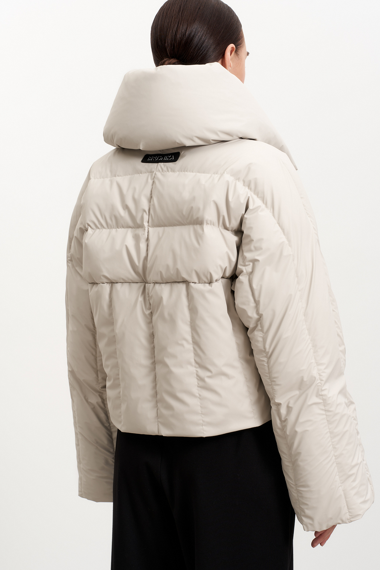 Короткий пуховик с воротником-стойкой. Модель прямого силуэта с боковыми карманами, спущенным плечом и брендированным ярлыком на груди. Застежка на потайную молнию и кнопки. Наполнитель натуральный пух 90% перо 10%.