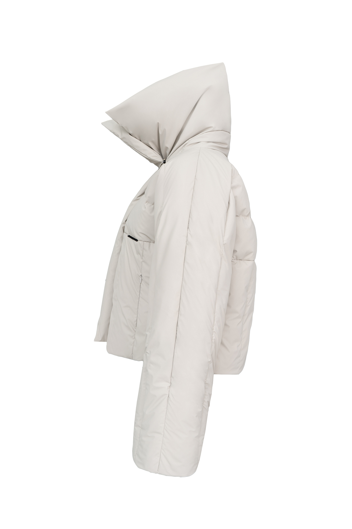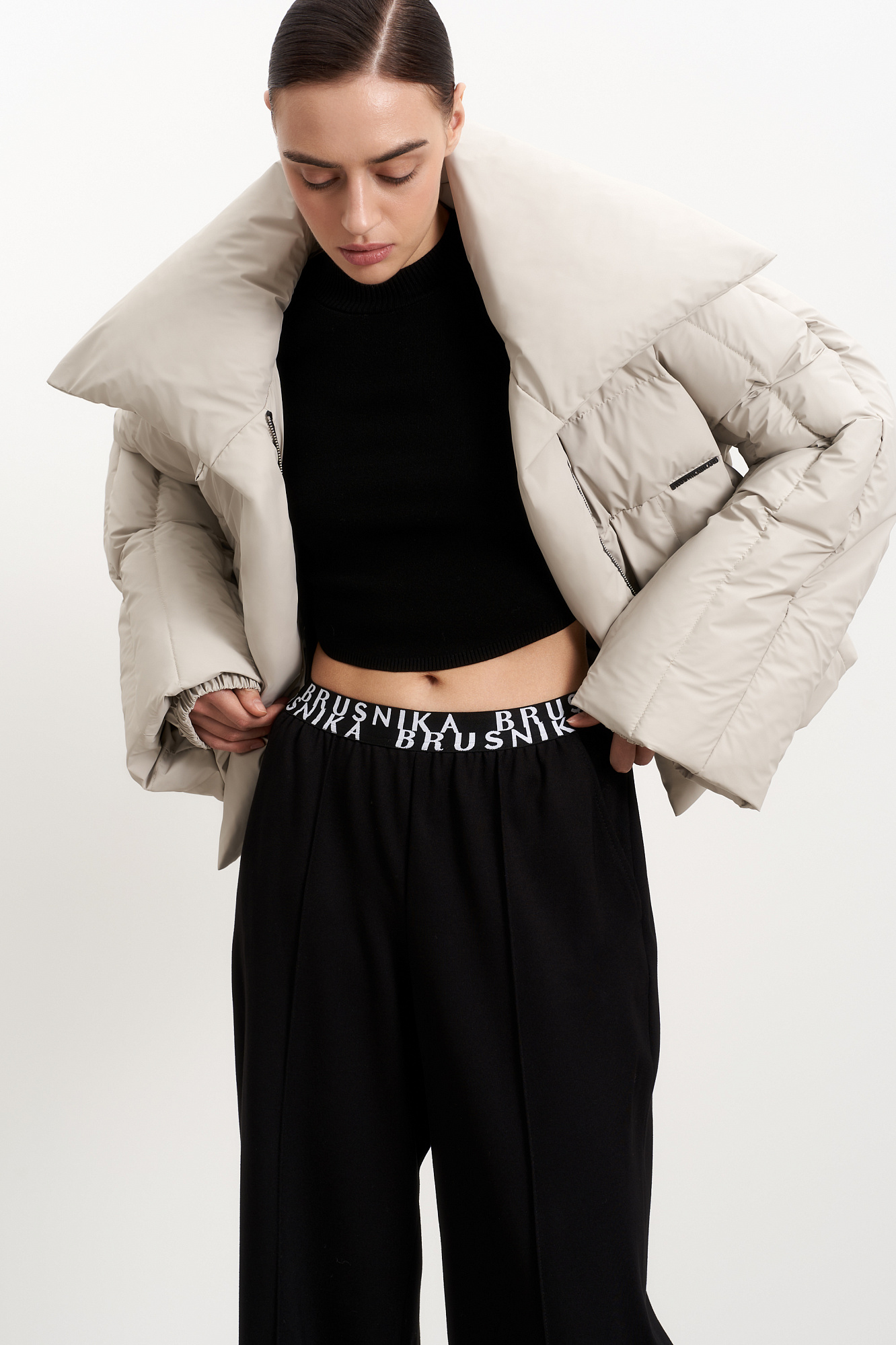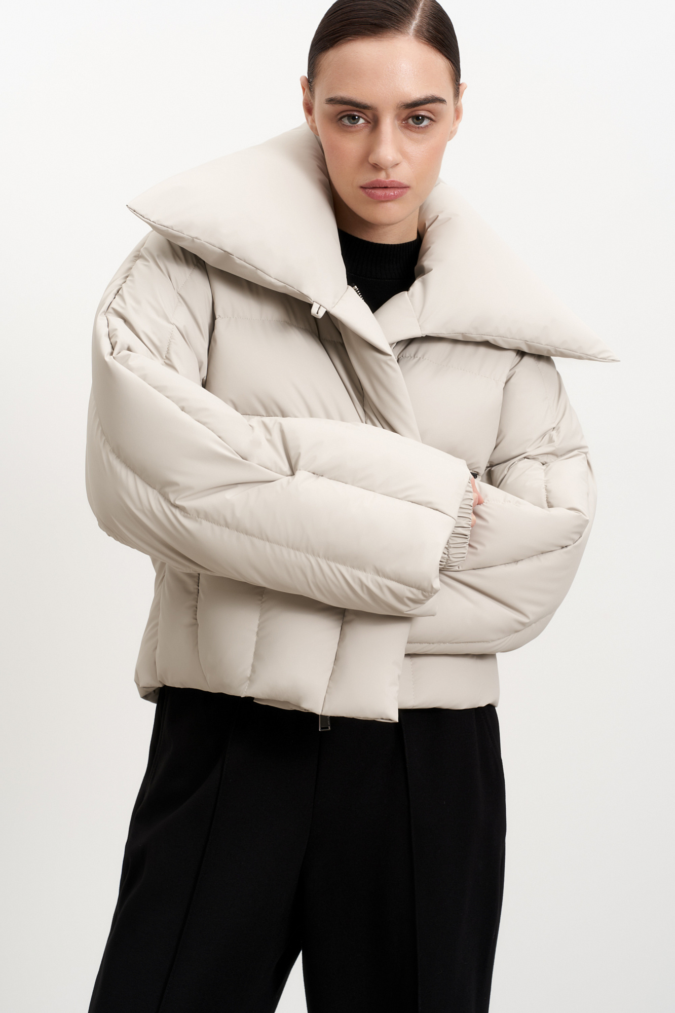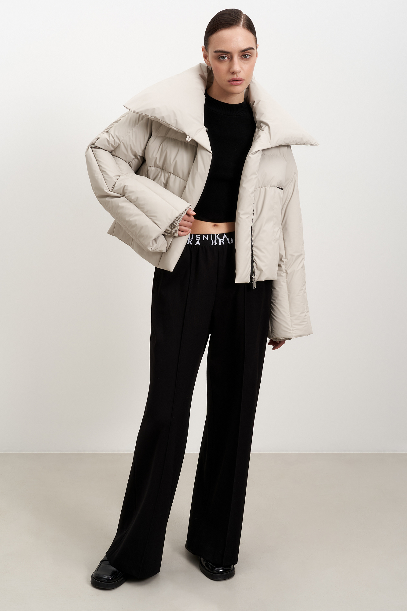 Короткий пуховик с воротником-стойкой. Модель прямого силуэта с боковыми карманами, спущенным плечом и брендированным ярлыком на груди. Застежка на потайную молнию и кнопки. Наполнитель натуральный пух 90% перо 10%.
